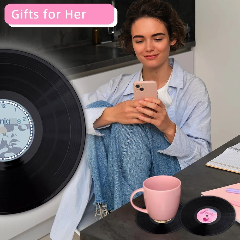 6PCS Retro Vinyl Record Coasters of 6 for Drinks, Funny Costers Black Product Details Color: Black Material: Acrylonitrile Butadiene Styrene Brand: Houti Shape: Round Product Care Instructions: Hand Wash Only Is Dishwasher Safe: No Product Dimensions: 3.75"L x 3.75"W Manufacturer: Houti Number of Items: 1 Item Weight: 3.52 ounces Country of Origin: China Item model number: CST001 What You Get: 6PCS 4.13 Inches trendy cute black vinyl coasters for desk decor, also ready to gift it to teen girls, women, friends. Trendy Vinyl Coasters: Aesthetic music black vinyl coaster for music lovers, which is a perfect craft for your bedroom and kitchen DIY. Gift Idea: This vinyl coasters have a gift box that is ready to be gifted to your friends, daughter, mom, female co-worker, or anyone who is music lover. It's a great gift idea for Birthday, Christmas, back-to-school seasons. Material: This coaster set is made of ABS material with a rubber pad on the bottom for slip resistance. The colorful patterns on the coasters are vibrant and can be directly washed without worrying about fading or peeling. Free to contact us if there is any problem with the coaster set. 6PCS Retro Vinyl Record Coasters of 6 for Drinks, Cups for Kitchen, Bar Desk Decor