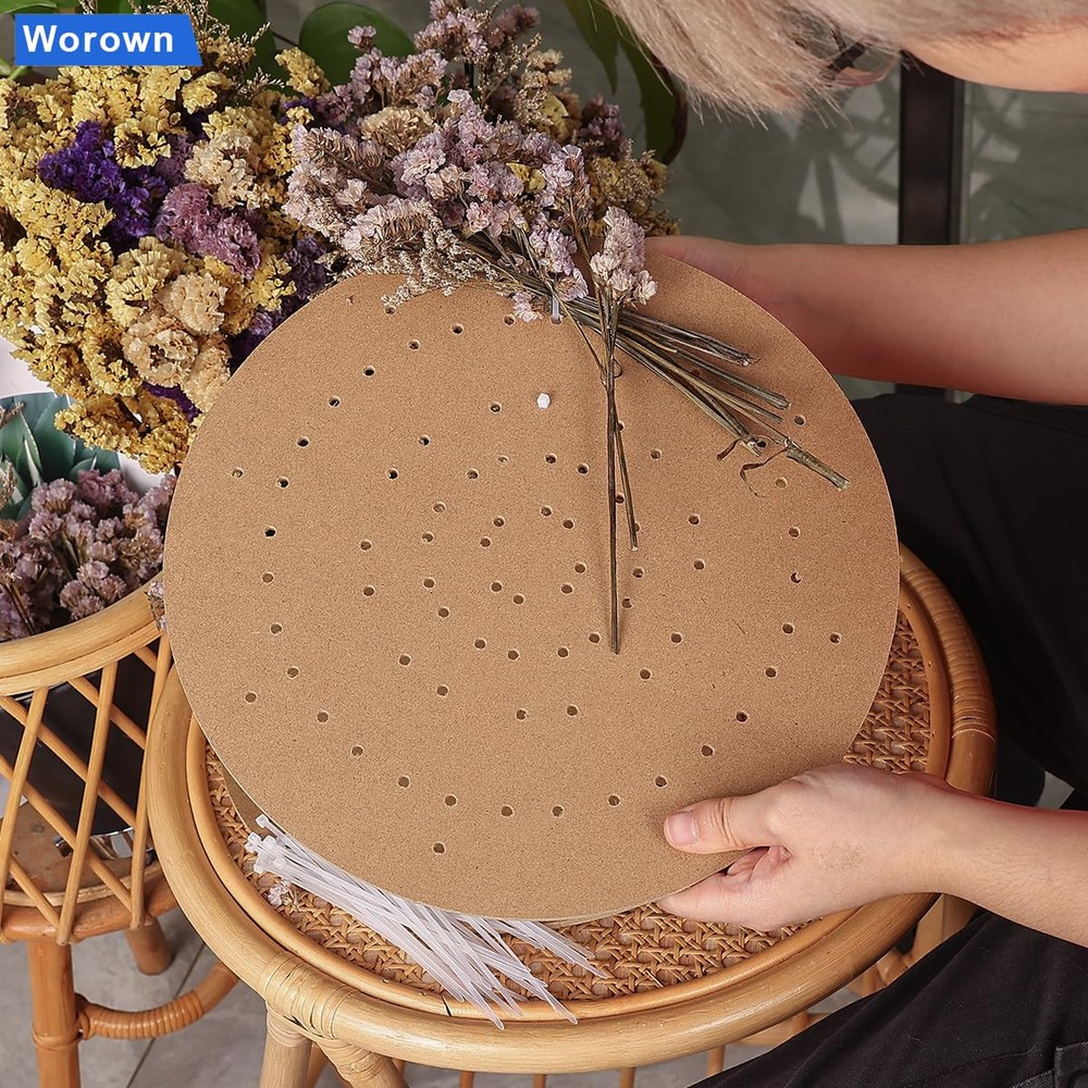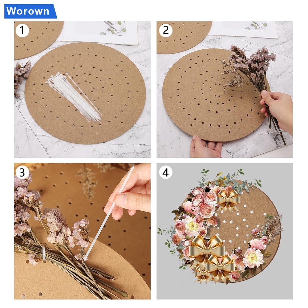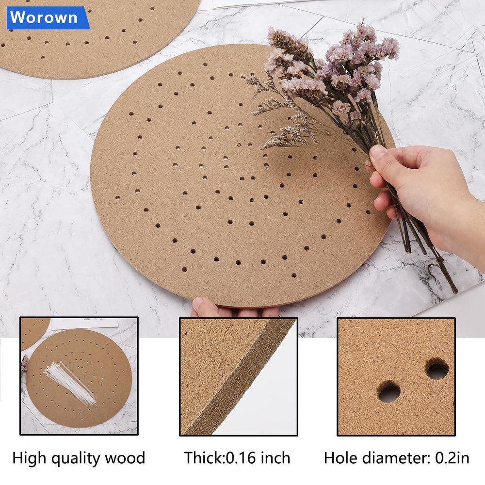 6-Pack 12-Inch WreathBoards, Wreath Forms, Wreath Frames with Holes for Crafting Wedding Wreath Decorations, Christmas Ornaments, Halloween Accents, Thanksgiving Day Accessories, and Wall Mountable Artworks Package Includes: 6 round wreath boards Approximate Size: each wreath board has a diameter of 12 inches Material: Wood wreath boards and nylon ties These wreath boards are ideal for creating floral hoop wreaths, macrame crafts, plant hangers, and other diy projects. they are perfect for decorating wedding wreaths and crafting wall hangings. Package included: 6 pieces of wooden wreath boards and 100 self-locking zip ties Size(approx.): Each round wreath measures 12 inches in diameter, while the zip ties are 6 inches / 15cm in length, making them ideal for DIY wedding wreaths and wall hanging crafts Material: Our round wreath boards are constructed from high-quality density boards and come with nylon ties known for their durability, flexibility, and eco-friendliness Applications: Featuring a number of guide holes, these wooden wreath boards make crafting floral hoop wreaths, dream catchers, macrame crafts, plant hangers, and other decorations easy. They are great for weddings, wreath decoration, and wall hanging crafts Compatibility: The wreath boards work well with a range of materials, such as cotton, fabric, curtains, ribbons, and other materials that can be used to create different types of exquisite crafts