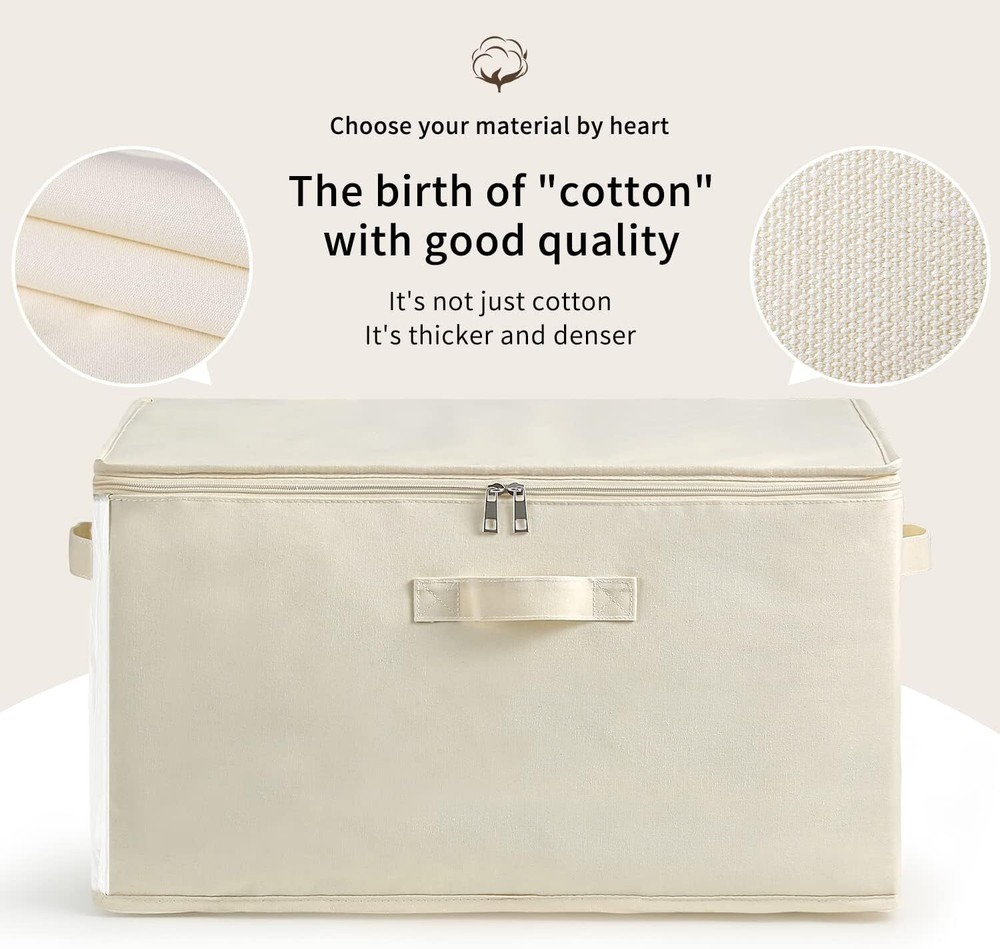 Canvas Canvas Construction: Made of breathable canvas fabric with a clear window inset to easily view stored items, protecting your wool, cashmere, silk, or other clothes fresh, aired, and dust-free. Closet storage bag helps keep items safely stored, freeing up extra closet and drawer space Convenient Storage: The modular shape of the bag makes it easy to fit in a closet or on a shelf, and it works well for storing items like extra bedding, clothing, and seasonal items. Water-resistant: Cotton fabric with PE interior lets the storage bag make a balance between breathable and water-resistant. Perfect for storage beddings, and clothing. Such as Comforter, Pillows, Down Jackets, and Sweaters. Foldable Design & Handles: Strong handles allow for convenient access and portability; can be folded flat and put away when not in use. Our storage is easier to put in with the duvets, quilts, or seasonal clothing and carry away. Size: 21.65*16.54*11.81 inches(55*42*30cm). Material Canvas, Cotton Color Natural color Product Dimensions 21.65"L x 16.54"W x 11.81"H Special Feature Collapsible Load Capacity 44.1 Pounds Recommended Uses For Product Clothing, Bedding Closure Type Zipper Shape Rectangular Number of Items 6 Size 6 Pack Number of Sets 6 Item Weight 2.82 Kilograms On Feb 11, 2025 at 19:03:32 PST, seller added the following information: