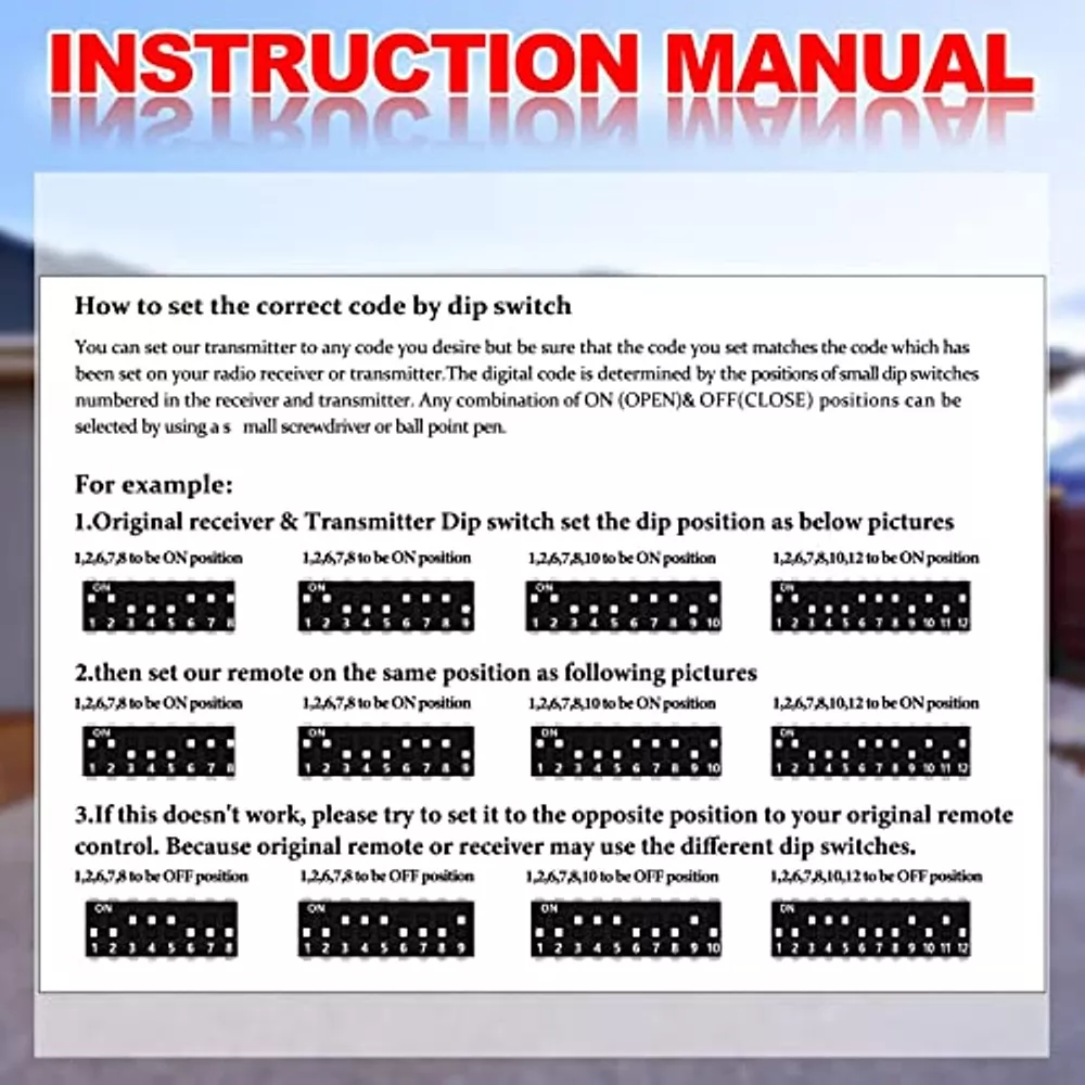 About this item Package Content: you will receive 6 pieces of door openers compatible with Linear Delta 3 310MHZ built in 23A 12V dry battery, including instructions and key chain, which can meet your use needs, and you can operate them well. Compatible Models: this garage door remote control is not universal, but only compatible with Linear Delta 3 (DTA DTD DTC DNT00002A) 310MHZ remote control with 8 position DIP switch; Please pay attention to the information before purchasing. Programming Instructions: the garage door remote is compatible with Linear Delta 3/DTC Delta 3, which can control operates at 310MHz, with clear instructions and easy programming; Before starting remote programming, make sure that the garage door opener is fully closed. Package Includes: 6 Pack Garage Door Remote Compatible 8 Dip for Linear Delta 310mhz Gate Opener On Aug 12, 2024 at 12:46:37 PDT, seller added the following information: