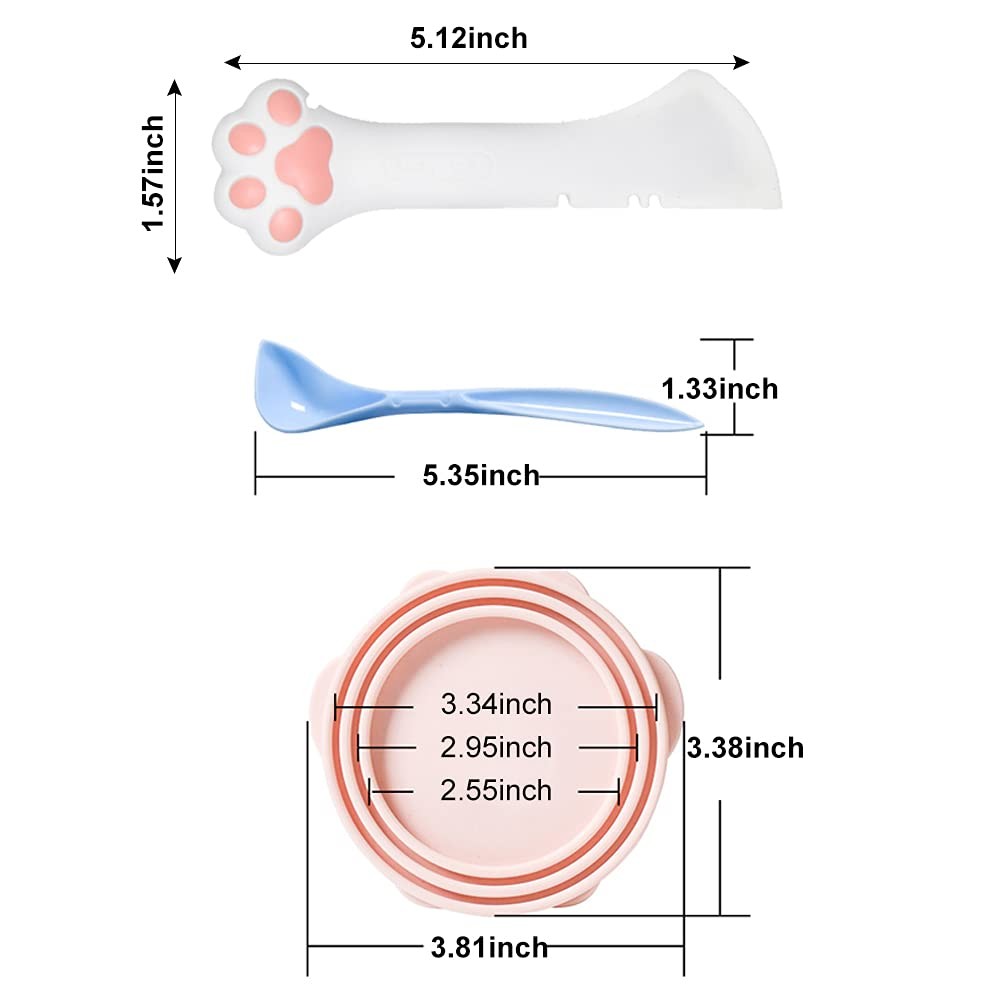 PET High Quality Material: The pet spoons and cat can lid are made of non-toxic and safe silicon material, you can use them for a long time without any harm;non-toxic, cold-resistant and heat-resistant. Multifunctional Design:Silicone pet can opener uses the lever principle design, allowing you to open the pet can easily.the pointed and curved design can clean the corners of the can; The stainless steel spoon can help you easily fish out the food in the pet can,scoop out every bit of food easily Universal Sizes:The cat/dog can cover fits for 3 ounce, 5.5 ounce, 12 ounce cans,the inner ring diameter are,2.5inch,2.9inch and 3.3inch,these lids also fit many people soup cans or canned veggies. Packaging Set: The package contains 4 pieces silicone pet can lids in pink, blue, green and gray color, 2 pieces of canned spoons in blue and pink and 2 pieces of pet food can covers in pink and blue, nice combination to meet your pet's daily needs. Good Airtight Performance: when your pet can't finish the canned food at one time, you can use the silicone can top to keep the canned food airtight and prevent strange odor; Place the canned food covered with the silicone lid in the refrigerator can keep the food fresh for longer time.