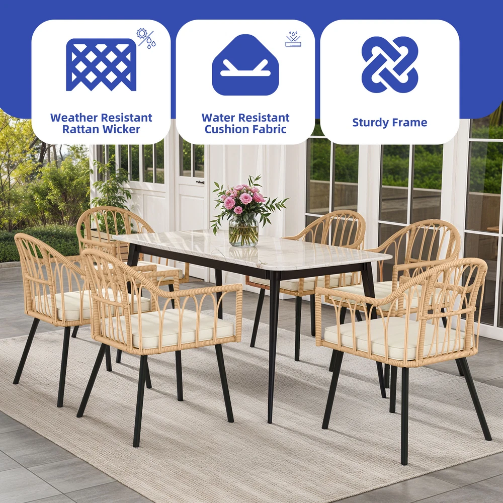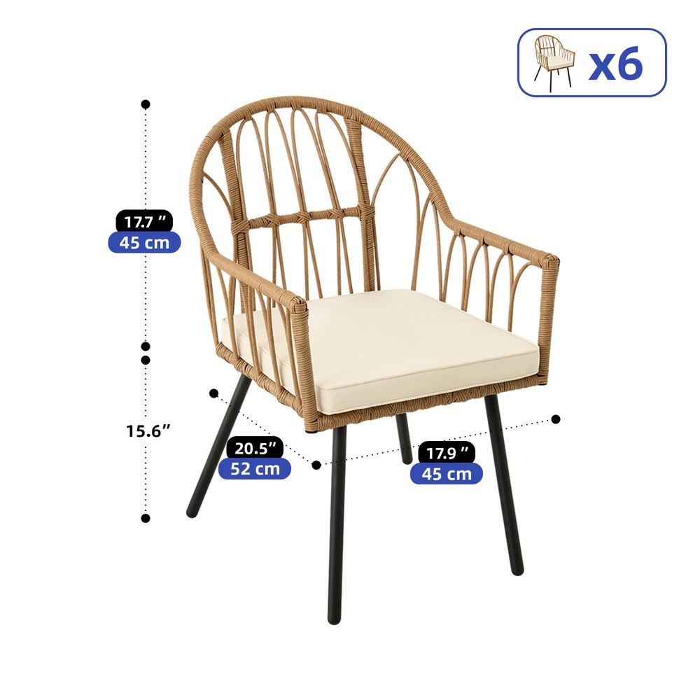 6 PCS Indoor & Outdoor Dining Chair with No Table UV Protect All-Weather Rattan Product Description NOTE: Professional Installation Would Be Highly Recommended. Description : 1. Color: Beige 2. Material: Rattan, Wicker, Metal 3. Room Type: Living Room, Entertainment Room, Open Plan Living Area, Sunroom, Patio, Backyard, Outdoor, Courtyard, Deck, and Poolside 4. Features: Comfortable & Breathable Fabric, Skin Friendly Fabric, Thick & Strong Wicker, Rust-Resistant Metal, Removable Cover, UV Protected, Weatherproof, Waterproof, Easy to Assemble, Easy to Clean, Height Adjustable Protective Foot Pads, Highly Ventilated & Thick Cushion. Features: 1. Comfortable Se ating Experience: The dining chairs are designed with ergonomics in mind, featuring a curved backrest for spinal support and a generously padded cushion for ultimate comfort. Additionally, the height-adjustable mechanism ensures a perfect fit for all table heights and user preferences. 2. Built to Last: These chairs are crafted with weather-resistant rattan wicker and a robust frame , ensuring durability and stability in various outdoor conditions. The cushions are made from water-resistant fabric , protecting them from moisture and making them easy to maintain and clean. 3. Effortless Maintenance: These chairs are UV protected to resist sun damage and waterproof to withstand the elements , ensuring long-lasting use and easy maintenance. They are also designed for easy assembly and simple cleaning , making them an ideal choice for any outdoor space. Dimensions: 1. Chair Dimension: 17.9" W x 20.5" D x 17.7" H Package Included: 1. 6 x Chairs 2. 1 x Cushions Set 3. 1 x Instruction Manual Note: 1. During assembly, do not tighten screws until all holes are aligned. 2. Confirm the appropriate furniture size for your needs prior to purchase. 3. There may be a slight color discrepancy between the product as seen on your monitor versus in real life. 4. Do not expose the product to extreme sunlight. To extend product lifetime, cover item when not in use. 5. Contact us immediately if any components are missing or damaged upon arrival. Our customer service team will resolve your issue right away. 6. Protect cushions from rain. The inner sponge is NOT waterproof. To extend product lifetime, cover when not in use. 7. The product may be dispatched separately into 2 packages, may not arrive simultaneously. Shipping 1. Normally the item will be dispatched within 1 business day if payment is cleared before 12 pm PST. 2. Please verify the correct shipping address in your PayPal account before making the payment. We only dispatch the item to the address that is sent to us at the time of checkout. 3. We don't ship to Hawaii, Alaska, Puerto Rico, APO/FPO/PO Boxes. 4. We don't provide local pick-up service. 5. Normally we will use USPS, UPS, FedEx & LTL to dispatch items. Payment 1. We accept PayPal and credit card. 2. We will ship to the confirmed Paypal shipping address that is provided with the payment only. Return 1. 30 days Money Back Guarantee. 2. Please contact our customer service to receive a RMA form first if want to return the item. 3. All returned items MUST in new condition with the original package. Contact If has any problem, please contact us by sending an ebay message. Our customer service will resolve the problem as soon as possible. On Mar 7, 2025 at 02:15:46 PST, seller added the following information: