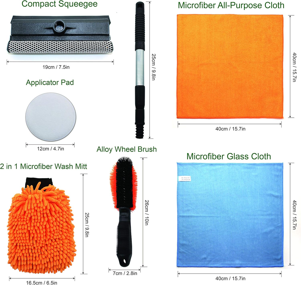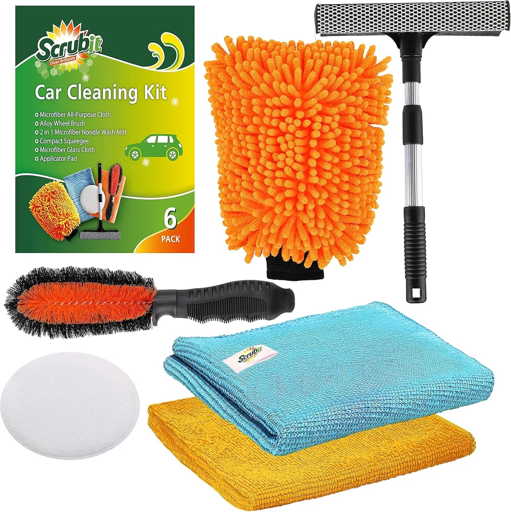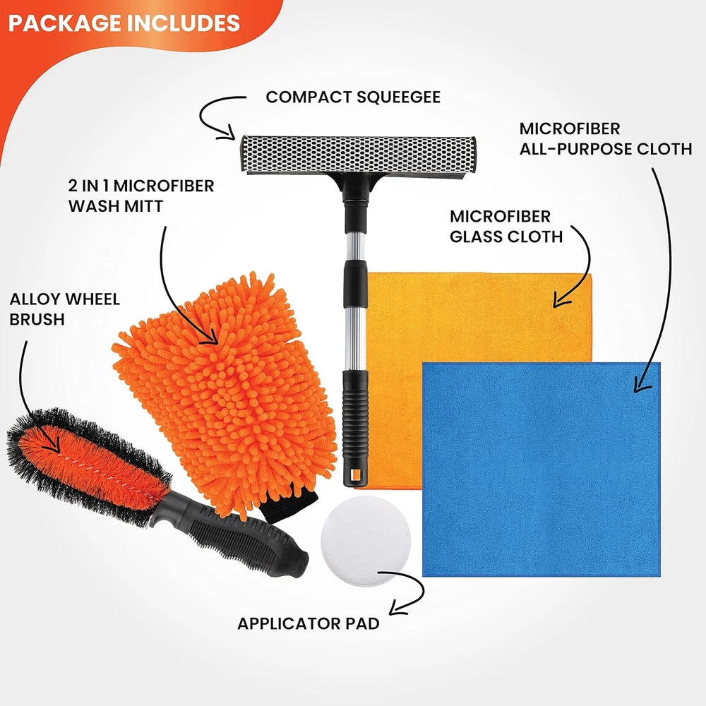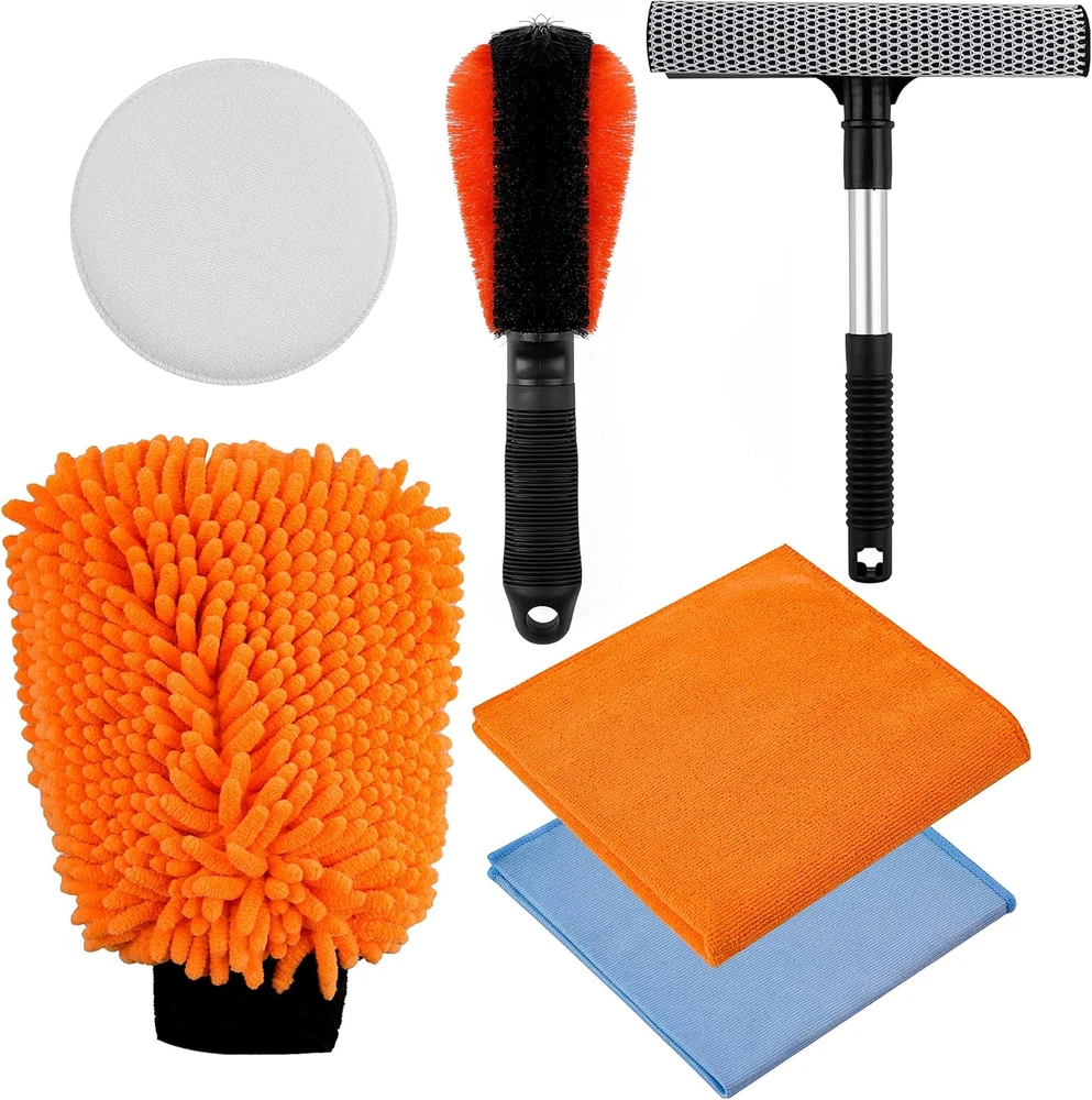 Car Wash Kit – 6 Cleaning Tools Includes Windshield Squeegee, Wheel Brush, Microfiber Mitt, Cleaning Towels and Wax Applicator Pad – Premium Car Care Set for Exterior and Interior Detailing FULL PROFESSIONAL CAR CLEANING KIT: Your car wash and wax kit includes all supplies and tools, an all-purpose microfiber cloth, a microfiber glass cleaning cloth, an alloy cleaning brush, an 2 in 1 microfiber noodle wash mitt, an compact squeegee, and an applicator pad to keep your car at its best - see pictures for full bundle details. KEEP YOUR CAR BODY BEAUTIFUL AND DURABLE: A good cleaning kit with decent car wash soap, wheel cleaner and polish can prolong the life of your car body - and keep it maintaining to be looking its best for its full lifetime with you. KEEP YOUR WHEELS AND WINDOWS CLEAN TOO: The microfiber window cleaning cloth, compact squeegee and the alloy brush let you keep your whole car clean - windows and wheels too. Because when you want your car to look the best, you need shiny wheels and clean windows too. ONLY QUALITY MATERIALS: We use only the best polyester blends for our microfiber items, durable rubber for the squeegee and strong fibers for the alloy brush, so your car can look its best with the help of this kit over the long term. Cleaning On All Levels This cleaning kit lets you keep your whole car clean. The body and interior with the soft microfiber cloth, 2 in 1 noodle wash mitt, and applicator pad. The windows with the microfiber glass cleaning cloth and the durable squeegee. And the tires with the handy and convenient alloy brush. Whatever your cleaning needs, from scrubbing off dirt from your hood, doors, or headlight till washing and waxing your auto without making a scratch this kit’s got you covered. Keep Your Car Brand New Keeping your car clean is a crucial part of preserving that “new” look. A good wax - which our applicator pad will help you spread out perfectly - can keep your paint safe from harmful UV rays. And a easy regular polish of your interior and exterior will keep things looking new for years to come. A Durable Kit For Long Term Use We understand that keeping your “baby” clean is a long term effort. Which is why we’ve ensured this set is made from high quality microfiber, rubber and other materials, so you can keep your car, van, truck, or even your motorcycle looking its best and shine for the long term. The Perfect Gift For Your Car Enthusiast Friend Got a friend who loves their ride? Nothing says thoughtful like a professional car cleaning kit. Get one for yourself by all means - but don’t forget your father in law, best friend or brother - help them keep their cars spotless too. Your Satisfaction Is Our Guarantee No matter what, you’ll be satisfied with this professional kit. If you’re unsatisfied with anything, we’re there for you. We offer an iron-clad 30 day satisfaction guarantee. If there’s anything you’re unhappy with, we’ll make it right. We’ll replace your kit or give you a full refund. Get Your Professional Car Cleaning Kit Now And Keep Her Looking Like New All Her Life Item model number B07SYB85V3 Manufacturer Part Number 01 63 Item Weight 1.23 pounds Voltage 12 Volts Package Dimensions 11.5 x 7.52 x 4.17 inches 7.52 inches x 11.5 inches x 4.17 inches. Weight: 1.23 lb Shipping from the USA All of our products are shipped from the USA, ensuring quick delivery to your destination. Payment We offer the following payment methods: PayPal, credit card, bank transfer, and eBay's secure payment system. Free Shipping & Free Returns Shipping within the USA is FREE. Additionally, any return is absolutely free for you. Risk-Free Purchase You have the option to return an item within 30 days without any justification. We cover the return shipping costs! Fast Shipping We ship immediately upon receipt of payment. Generally, the package is delivered within 2-3 days in the USA. If it takes longer, we will contact you. Quality and Costs Made in Europe, USA, China No customs fees or additional charges Total satisfaction guarantee Invoice with declared VAT available upon request in .pdf format Feedback Your feedback is very important to us. After you pay for your purchase, you will automatically receive positive feedback from us.