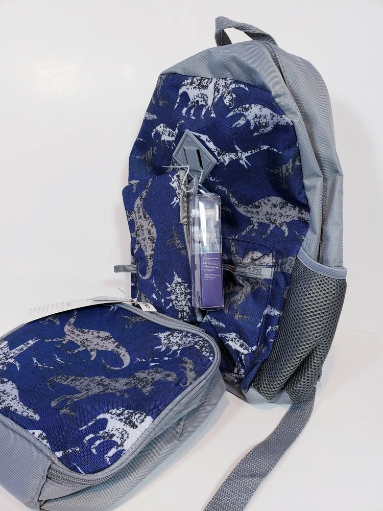Love2design 6 Piece School Backpack Set Dinosaurs lunch bag ear buds. Features included Backpack padded and Adjustable shouldrr straps/ hologram lash tabs/ carabiner Keychain/ bpa free water bottle/ air mesh side pockets/ matching ear budds/ lunch bag and pencle case brand new .