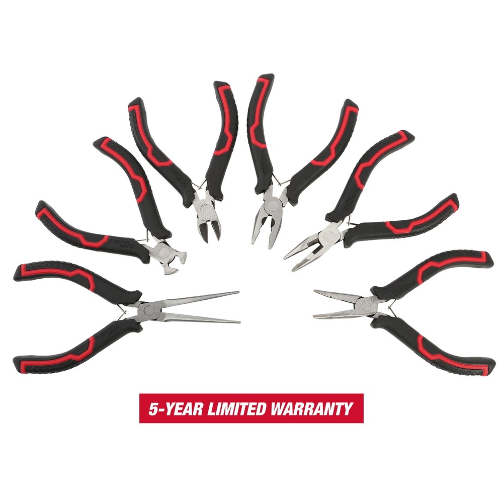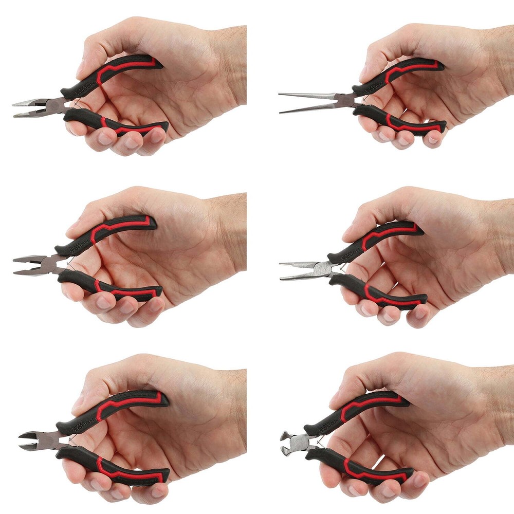 6-Piece Mini Pliers (Model 5652) set combines the most popular pliers used for bending, forming, shaping and cutting. The 6 piece pliers set includes: Mini End Nipper Pliers, Mini Long Nose Pliers, Mini Linesman Pliers, Mini Needle Nose Pliers, Mini Diagonal Pliers and Mini Bent Nose Pliers. Each piece from this set is made from drop forged steel for strength and durability which is hardened and tempered for easy cutting. The heads on the The 6-Piece Mini Pliers are precision machined for accuracy and the spring loaded grips ensure efficient use. These pliers are perfect for crafting, jewelry making, and many other precision projects. This 6-Piece Mini Plier set is backed by a 5 year limited warranty. Hyper Tough New 6-Piece Mini Pliers Set Precision Machined Heads for Accuracy Spring Loaded Ergonomic Soft-Grip Handles 5 Year Limited Warranty Includes 1 - Mini Long-Nose Plier 1 - Mini Diagonal Plier 1 - Mini Needle Plier 1 - Mini End Cutting Plier 1 - Mini Linesman Plier 1 - Mini Bent Nose Plier
