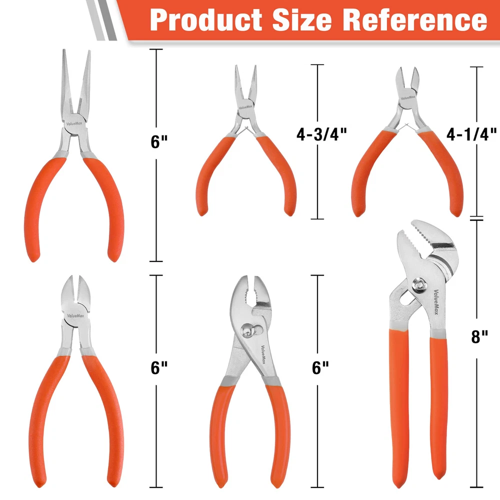 PACKAGE INCLUDING: Our pliers tool set including 6 Inch Long Nose Pliers, 6 Inch Diagonal Pliers, 6 Inch Slip Joint Pliers, 8 Inch Groove Joint Pliers, 4-3/4 Inch Long Nose Pliers, 4-1/4 Inch Diagonal Pliers. Variety of pliers for projects and tasks ranging from fastening to wire cutting. PREMIUM QUALITY: Pliers are made of premium drop forged hardened carbon steel with nickel-plated, which ensures our pliers are sturdy, durable, and long-lasting. Tips: pliers are covered in grease to prevent getting rusty, wipe grease off before using. ERGONOMIC DESIGN: Non-slip, comfort grip handles provide better leverage when gripping objects. Hardened cutting edges for extra-tough and easy cutting. Heat-treated jaw help with gripping power and the overall life of the product. 6 PIECES BASIC PLIERS TOOL SET: Our 6-piece set of pliers can be used for gripping small parts, bend, shape, and twist wire, tightening & loosening nuts, bolts, pipe & fittings, holding or bending flat or round stock and cutting wires. WIDE APPLICATION: These pliers are great for home repair, gardening, and a variety and general use.