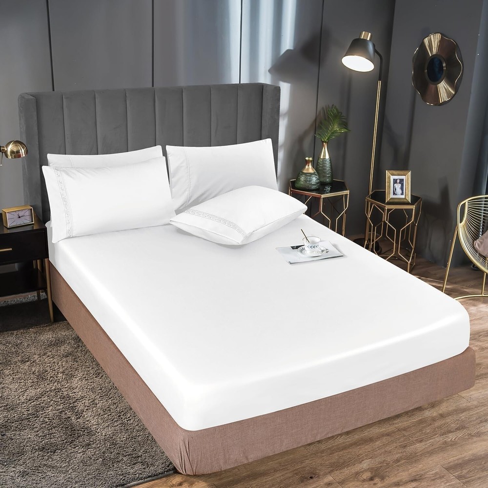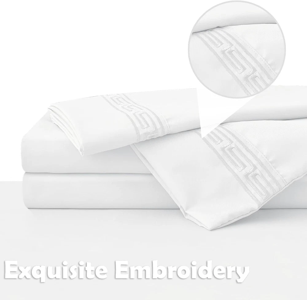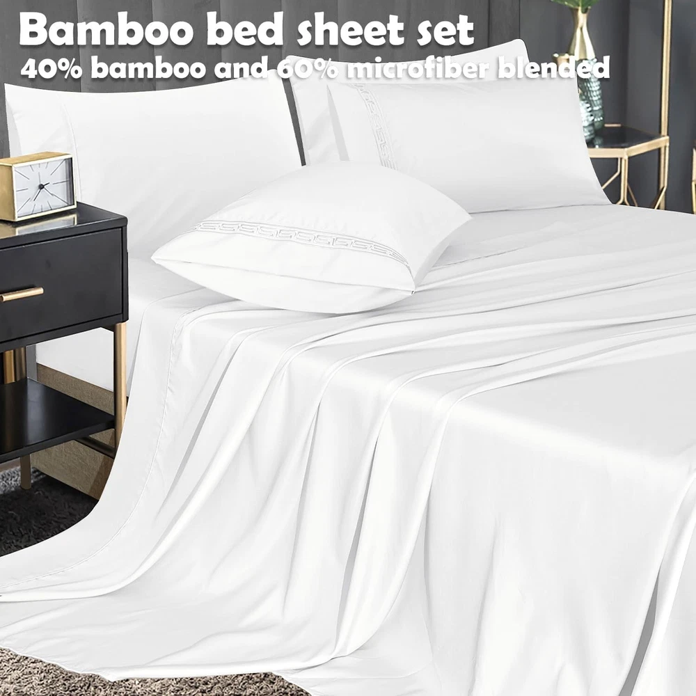 COOLING & BREATHABLE COMFORT - Elevate your sleep experience with our premium bedding set. Lightweight and breathable, our sheets are crafted to keep you cool and refreshed. The sheets' natural temperature regulation and moisture-wicking properties create an oasis of comfort for a restful night's sleep. LUXURIOUS BED SHEET SET - Indulge in the silky softness of our bed sheets set. The bed sheet set is made of 60% polyester and 40% rayon derived from bamboo. Gives you a comfort of nature. PERFECT FIT & STABILITY - Experience a seamless fit on any mattress up to 16 inches thick. Our deep pocket design and all-around elastic ensure a snug fit for memory foam or traditional mattresses, providing stability throughout the night. No more slipping sheets—just uninterrupted sleep. ARTISTIC EMBROIDERY DETAIL - Transform your bedroom with our MCO bed sheets. Each pillowcase features beautifully crafted embroidery, adding an artistic touch to your sanctuary. Elevate your sleep space with the perfect blend of comfort and style. EASY CARE & DURABLE - MCO sheets offer easy maintenance compared to traditional cotton sheets. These sheets are fade, wrinkle, tear, and shrink resistant, ensuring long-lasting durability. Machine washable with cold water and tumble dry low for a hassle-free bedding experience. COMPLETE BEDDING SET - Redefine your bed with our Full sheet set. The 6-piece set includes 1 x flat sheet (81"x96"), 1 x fitted sheet (54"x75") and 4 matching pillowcases (20"x30"). The White color adds an elegant touch to your room. SHOP WITH CONFIDENCE - We stand behind our product with a 30-night risk-free satisfaction guarantee. Your comfort is our priority. If you have any concerns about our sheets, reach out to us. Add to cart now and experience the unmatched comfort of MCO sheets. · Size Full Unit Count 6 Set Fitted Sheet Pocket Depth 16 Inches Style Color White Pattern sollid Style Name Traditional Theme Solid Seasons All