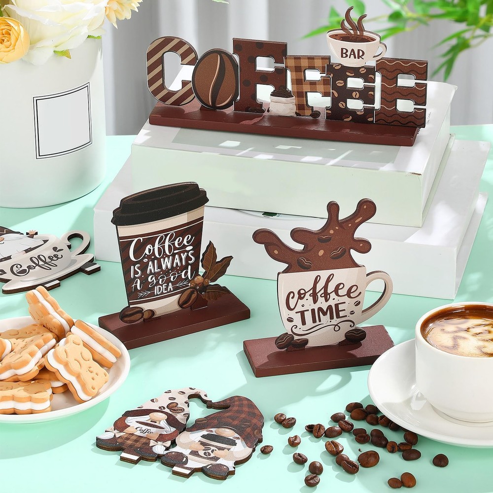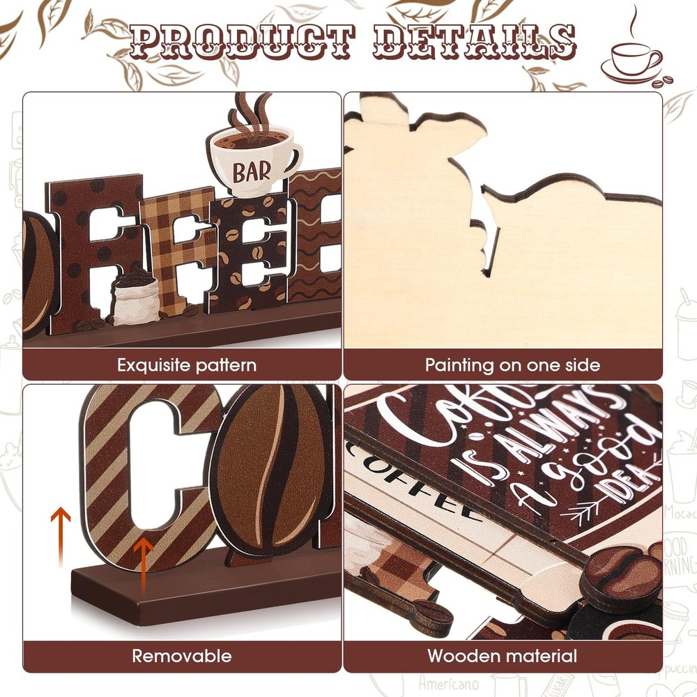 Features: Farmhouse Tiered Tray Decors: With the adorable appearance and vintage design, the coffee bar table decor will be an interesting photo props at various themed parties, bringing a nice visual effect. Decor for Coffee Bar: These rustic coffee table signs are ideal additions to your collection or as a nice gift set for your coffee lover friends. They will remind of your sweetness when your friends see the coffee gnomes decorations. Specifications: Material: wood Color: brown Size: as the picture shows Package includes: 6 x coffee bar signs Notices: Manual measurement, please allow slight errors on size. The color may exist a slight difference due to different screen displays. Coffee Bar Decoration: You will receive 6 pieces of wooden coffee decors in different styles, retro and cute; The biggest one measures about 8.2x3.5inch/21x9cm, sufficient quantity and suitable size can meet your coffee table decoration needs, which will add more fun to your place; Please make sure the size is what you want before purchase Adorable Design: Our coffee signs are printed with classic coffee theme patterns, such as coffee gnomes, coffee cup, truck with coffee beans; There are some words related to coffee, like [Coffee is always a good idea, Coffee time]; With the overall brown color, the coffee table signs will be warm and attractive decorations on your coffee table, adding flavor to your coffee time Easy to Use: The farmhouse coffee bar decor signs are divided into upper decorative parts and bases; You just need to insert a decorative part into the pre-opened slot of a base, the slot may be a little tight; Then, you will get a lovely coffee decoration which can stand stably on many places Reliable Material: Our farmhouse coffee theme decorations are made of quality wood material, well polished and printed, not easy to break or fade, will serve you for a long time; Using these brown coffee wooden signs as additions of your for your festivals and parties, leave a deep impression on your guests Widely Application: These farmhouse coffee gnomes decor can stand freely, suitable for table or shelf, can be applied to decorate your coffee bar, coffee table, living room, dining room, office and other places; They are also suitable for coffee theme party, birthday party, family gathering etc., definitely a nice gift set for your family, friends, and those coffee lovers