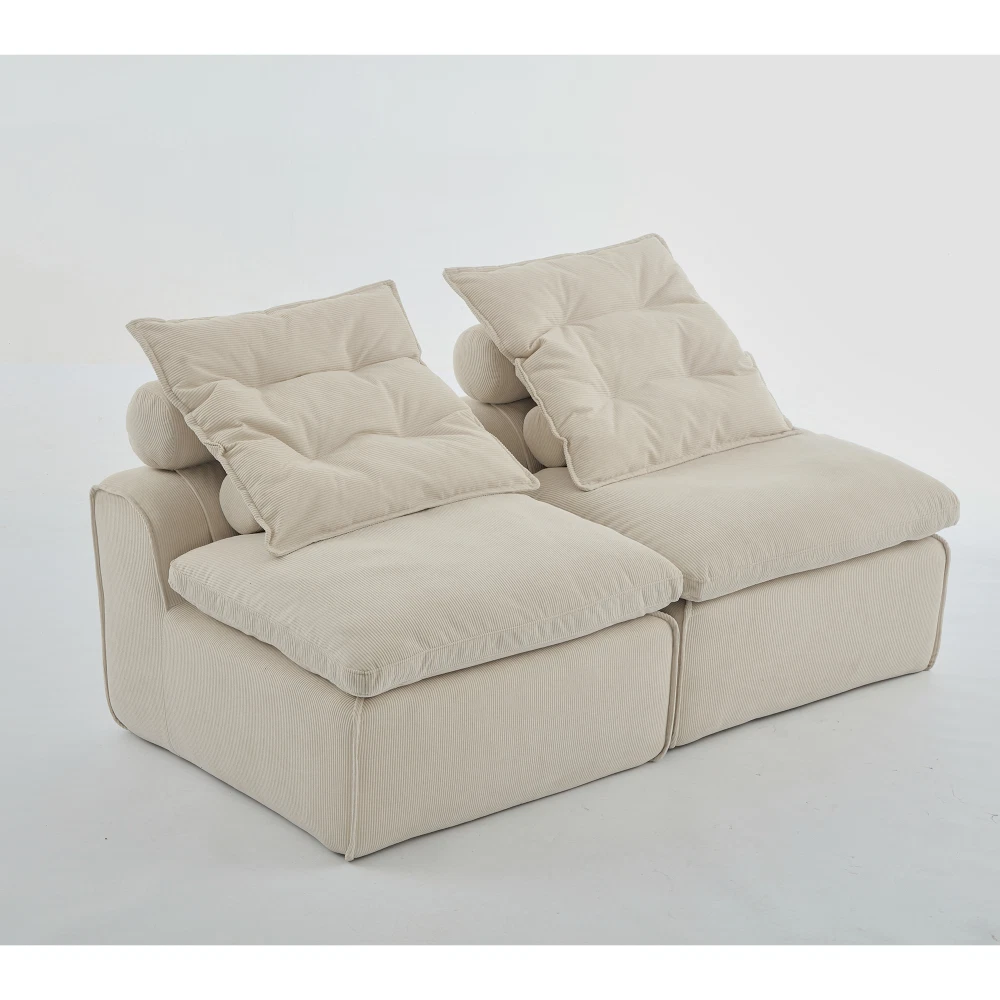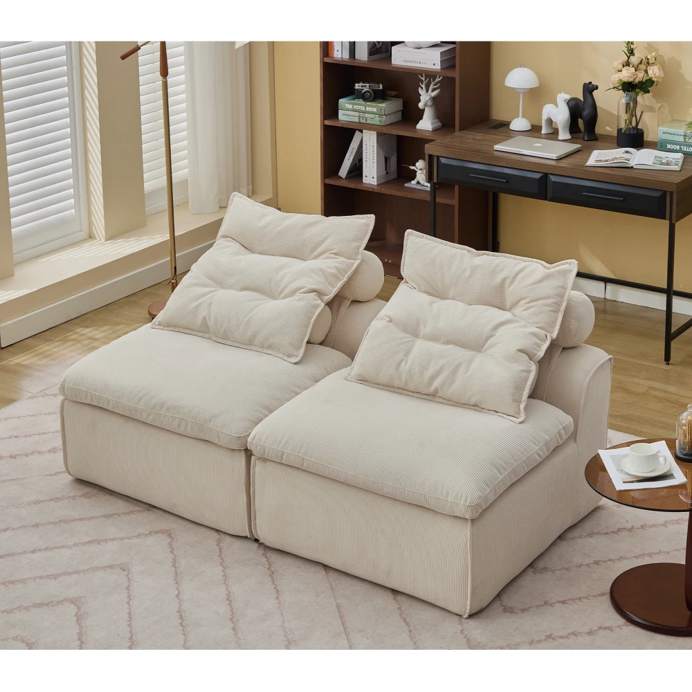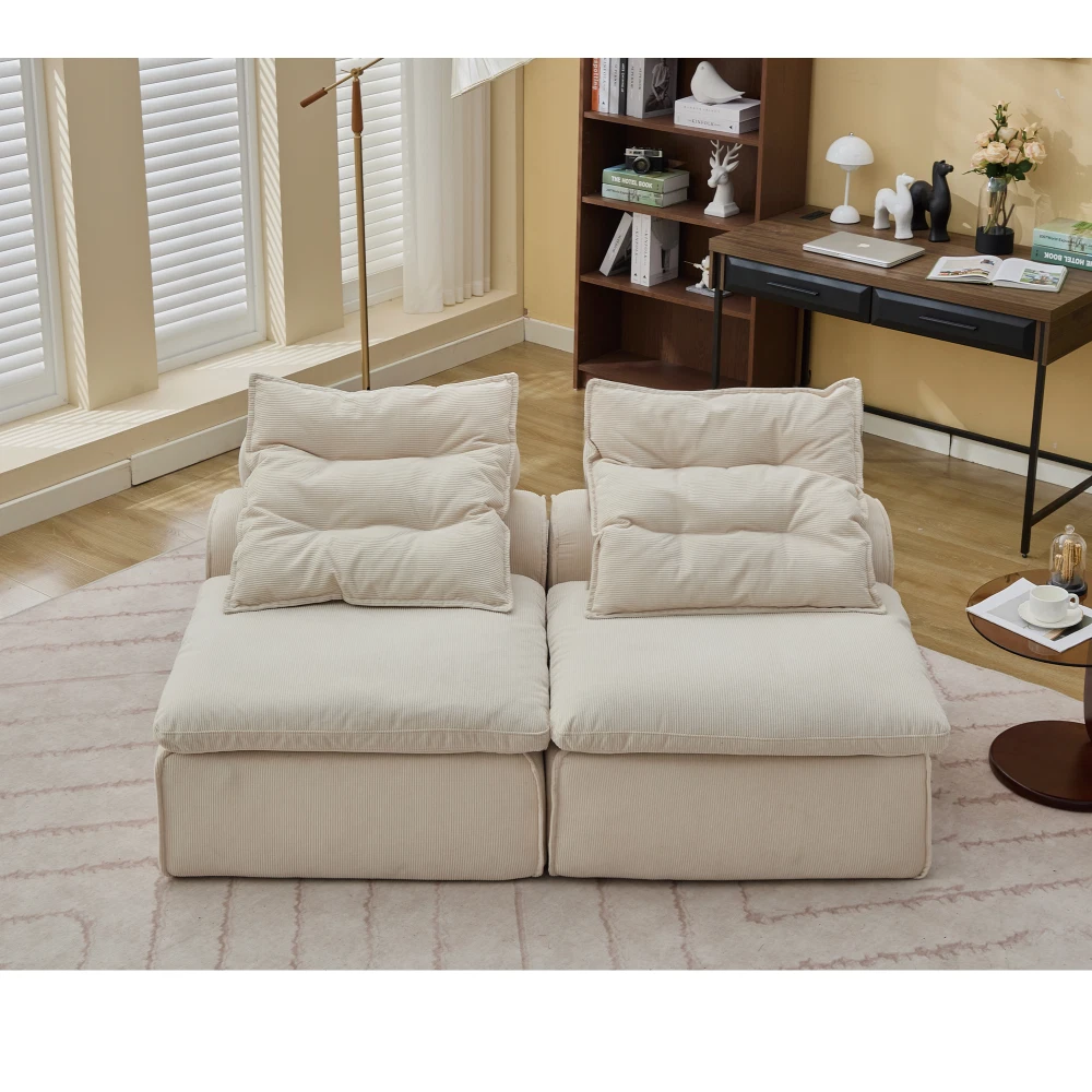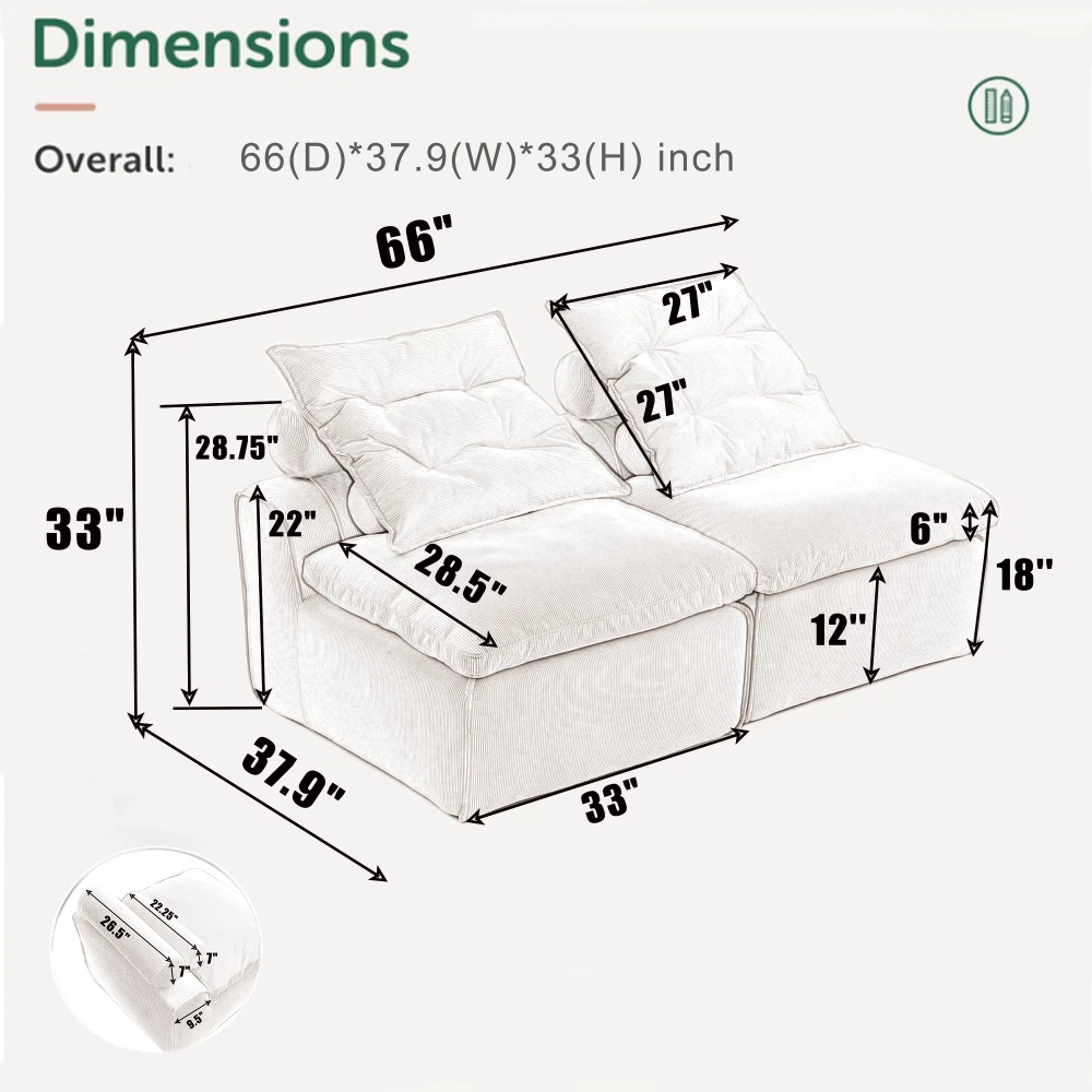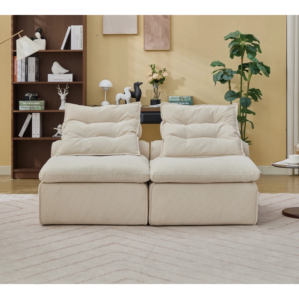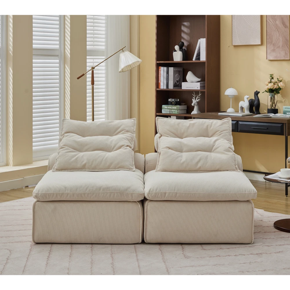 【Compact, Armrest-Free Design】: Ideal for Small Spaces: With no armrests, this chair maximizes space while . Its sleek and compact design is perfect for small apartments, reading nooks, or dorms, blending style and functionality in a space-saving form. 【Warm and cozy feeling】: With soft corduroy fabric, this sofa offers a cozy, inviting texture that stands out from standard upholstery. It is ideal to create a warm and welcoming atmosphere and add a touch of warmth to your home. 【Supportive foam Comfortable without compromise】:High quality foam, this chair offers balanced support and comfort. It is designed for a comfortable experience, whether you are reading, working or relaxing. 【Neck and Waist pillow】:The neck and waist pillow combination is designed to provide outstanding comfort and support. No matter how you sit, it will give you a comfortable feeling. The lumbar pillow supports the natural curve of the waist and relieves discomfort when sitting for long periods of time. 【Size】: Individual sofa size:33*37.9*33''(L*D*H) 6pcs built-up sofa size :132*70.9*33''(L*D*H) 【Sofa care and maintenance】:Due to the compression of the cotton product will have wrinkles when opened, this is a normal phenomenon, please pat to help it return to its original state, 72 hours will return to the original. 【No Assembly Hassles】 Say goodbye to the nightmare of furniture assembly. Unbox all packages, gently pat each part to restore its fluffy appeal, and within up to 72 hours, your sofa will resemble the picture-perfect status you desire. 【DIY Sofa】:This modular sofa offers a variety of combinations to suit different Spaces and occasions. Each module can be used individually or in combination, providing unlimited layout possibilities. Fabric The sofa is made of corduroy fabric to bring you the ultimate Warm&Cozy,Durable,Lint-Free Dimensions Individual sofa size:33*37.9*33''(L*D*H) 6pcs built-up sofa size :132*70.9*33''(L*D*H) Features Product Type Sofa Design Modular Sofa,DIY Sofa Seating Capacity 6 Upholstery Material Soft Corduroy Fabric Seat Fill Material Foam; Pocket Spring Pillow Included Yes,12 included(Neck Pillow*6 Lumbar Pillow*6) Product Care Lightly brush or vacuum frequently to remove dust and grime. Spot clean using a mild water-based solvent. Pre-test cleaning methods on a hidden surface. A professional cleaning service is recommended for an overall soiled condition. Country of Origin China Product Dimensions Overall 132*70.9*33''(L*D*H) Back Height - Seat to Top of Back 28.75'' Seat Height- Floor to Seat 18" Seated depth 28.5" Lumbar Pillow size 22.25*7"(L*D) Neck Pillow size 26.5*7"(L*D) Cushion thickness 6" Weight Capacity 230 lbs / seat Adult Assembly Required Yes Suggested # of People 6 Notice: 1.Due to the difference between computer display and photography, the color of the pictures and actual products will be slightly different. 2.The packaging of the product package may be updated at any time, please refer to the actual product received. 3.Most of our sofas are hand-measured, therefore the dimensions are for reference only, and may marginally deviate. On Mar 10, 2025 at 02:47:58 PDT, seller added the following information: