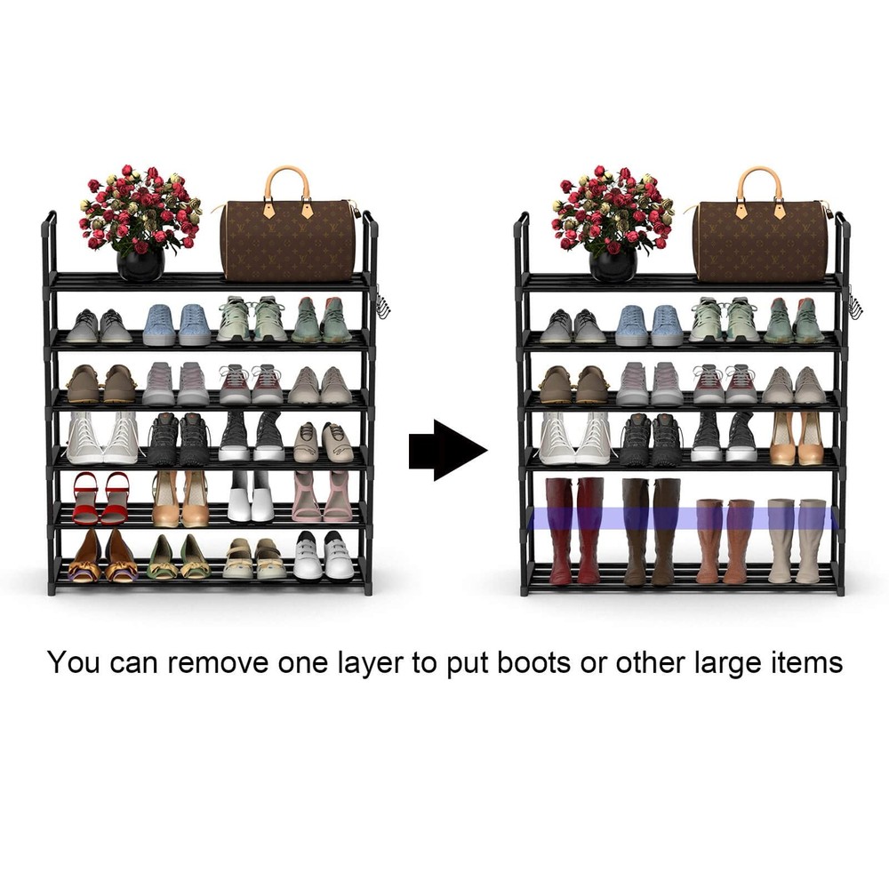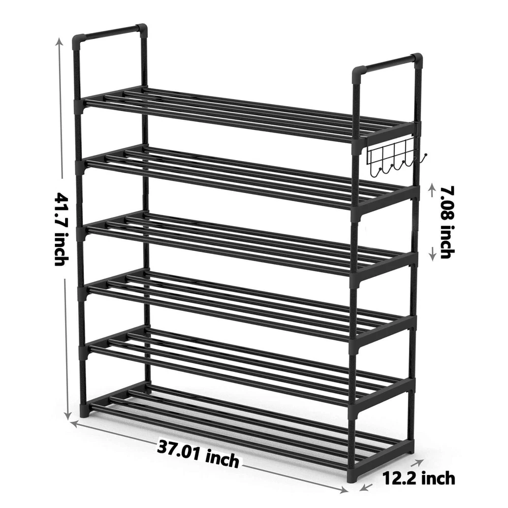 6-Tier Durable Metal Shoe Rack,Adjustable Shoe Shelf Storage Organizer with Versatile Hooks,Stackable Boot & Shoe Storage,for Entryway,Hallway,Living Room,Closet, Black Sturdy and Durable Metal: The 6 tiers shoe rack is made of sturdy and smooth powder coated metal tubing with corrosion resistant and high quality plastic connectors. Stable, each shelf can hold up to 11 pounds and has a long service life. More large space:This expandable shoe rack holds up to 24 pairs of shoes. You can remove one layer to put boots or other large items. Besides shoes, this modern shoe racks can hold hats, books, bags, small accessories, and sundries for maximize your space! Multifunctional: The black shoe rack cabinet has hanging hooks that allow you to hang commonly used items on the side hooks such as umbrellas, belts, keys, bags, hats, shopping bags, rackets, etc Product Dimension: The size of 37.01"x12.2"x41.7",Put in the kitchen can be placed in the kitchen utensils and tableware. In the entrance can keep clean and tidy. The shelf in the bedroom can put miscellaneous things in the closet to keep clothes neat and tidy. Make the miscellaneous room look cleaner. EASY TO ASSEMBLE: No tools needed,Free standing shoe racks includes instruction manual,You can have it assembled about 20 minutes, if you have any questions about the process, please do not hesitate to us at any time