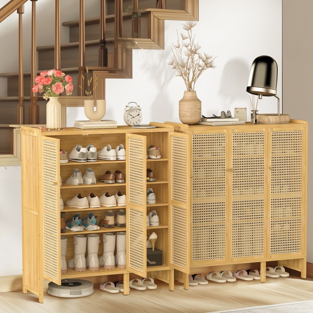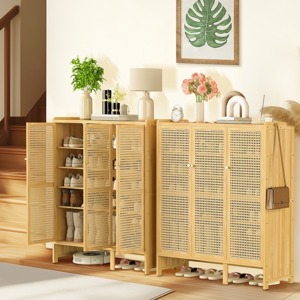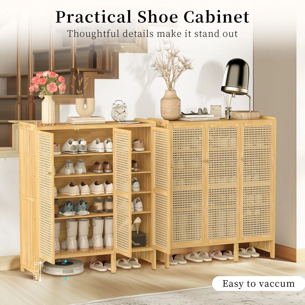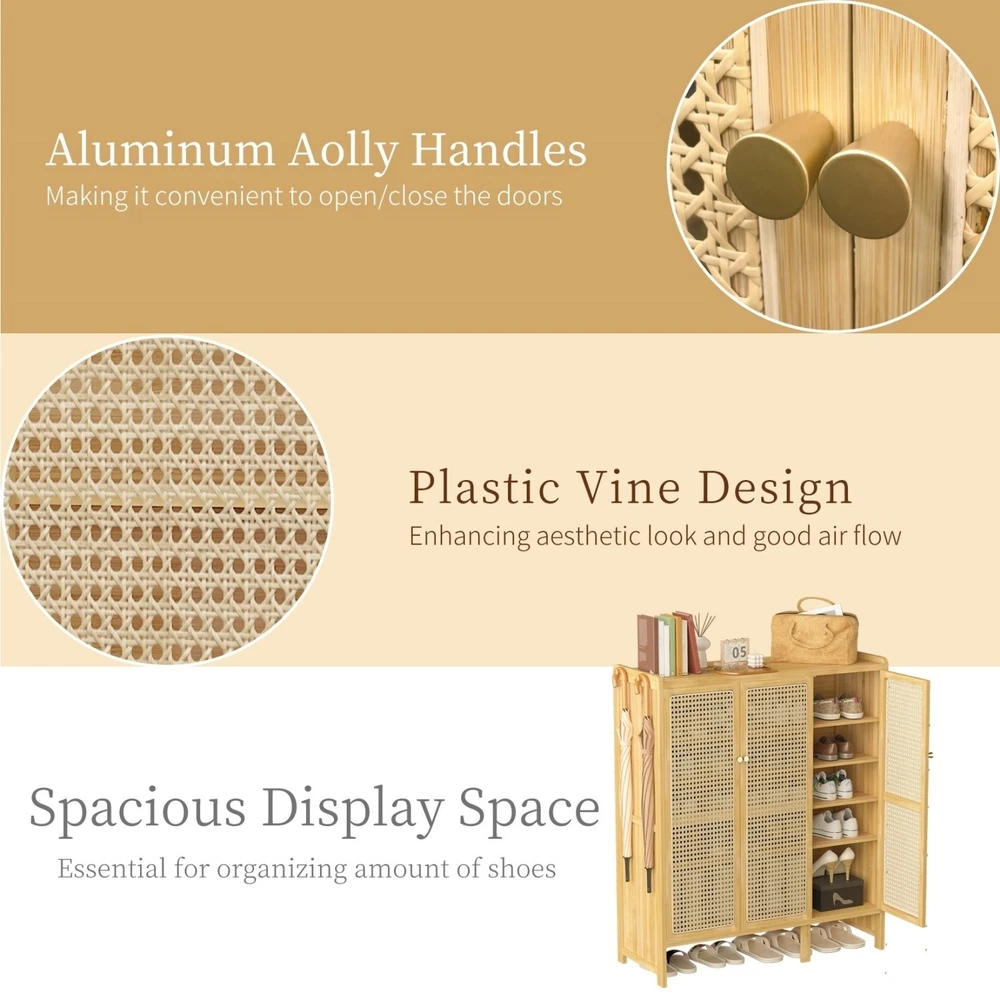 6-Tier Shoe Storage Cabinet 3 Hollow Doors Entryway Bamboo Shoe Rack Organizer 6-Tier Shoe Storage Cabinet 3 Hollow Doors Entryway Bamboo Shoe Rack Organizer US SELLER, FAST ARRIVAL! Features: Built with 5-tier ample interior shelves for accommodating up to 18-20 pairs of shoes. Includes a top surface for displaying planters, framed photos, keys, artwork, a mirror. All three doors have gaps in the rattan, vented to air circulation inside the cabinet. Breathable plastic rattan panel doors, not only add texture also promote ventilation. Rattan-wrapping edge, not only enhance beauty also prevent net from coming loose. The doors are fitted with magnetic closure, reduce the risk of doors being damaged. Magnetic closure easy to open and close, keeping shoes safely hidden , reduces wear. Comes an elegantly integrated aluminum door knob adds a refined finishing touch. Built with four hooks for hanging everyday essentials like handbags, umbrellas, hats. Constructed from bamboo frame with MDF shelves, lends super strength and robust. Natural bamboo structure, without any pungent smell, safe for the health of family. Strong package includes all the hardware and instruction for hassle-free assembling. Specifications: Shape: Rectangular Model: Shoes Cupboard Features: Well-ventilated Doors, With Shelves Materials: 70% Bamboo +20% MDF +1% Iron +9% ABS Color: Natural Wood Net Weight: 16.5kg/ 36.38 lbs Product Dimension: L * W * H total 90.5x35x107cm/ 35.62x13.77x42.12 inch Tabletop Surface: L * W 90.5x35cm/ 35.62x13.77 inch Weight Capacity: Top Shelf 10kg/ 22.05 lbs Each Shelf 5kg/ 11.02 lbs Package Included: 1 x Shoe Storage Cabinet 1 x Instruction Guide Payment Delivery details Terms of sales About us Contact us Payment 1.We accept payment by credit card, paypal, payoneer. 2.Upon on payment, please confirm your shipping address. Delivery details 1. All of our products are brand new. 2. All Mirror have passed drop test over 1.2m and quality inspection, ensures the mirror was shipped in good condition before shipment. Terms of sales 1.We are located in NJ, CA ,all the items will be shipped via USPS, UPS Ground, Fedex Ground with tracking number provided. 2. We cannot ship to Alaska, Hawaii & Puerto Rico Addresses. About us About Wisfor At Wisfor,we provide high quality LED bathroom mirrors,focus on the development and innovation of mirrorsand our company has over 10 years backed with professional service experience, and exports products to more than 130 countries around the world. There are severial series of mirrors, Bathroom Mirror with Light, RGB Frontlit &Backlit LED Mirror, Metal Frame Mirror,Decorative Wall Mirror,ect. And many shapes, rectangle, round, oval, and so on.We always focus on the development and innovation of high-quality LED bathroom vanity mirror, to meet your demand and to elevate personality and design tastes. Contact us 1. If you are satisfied with the transaction could you pls leave us a positive feedback 5-star that we will be appreciated. 2. Normally your email would get replied within 24 hours (Business Hours) and your issue will be followed up carefully till we 've reached an agreement. 3. If you have any questions or suggestions before opening a case or dispute ,or leaving any neutral or negative feedback, please contact us first,we will try our best to resolve your problem. Brand UNHO Model Shoes rack Features With Doors, With Shelves Item Height 42.12 inch Item Length 35.62 inch Item Width 13.77 inch Type Shoe Cabinet Mounting Free Standing Assembly Required Yes MPN CNA9VJ2GA Material Bamboo Number of Shelves 5 Item Depth 35.62 inch Item Weight 16.5kg Color Natural Wood Capacity 16-20 pairs Number of Items in Set One-Piece