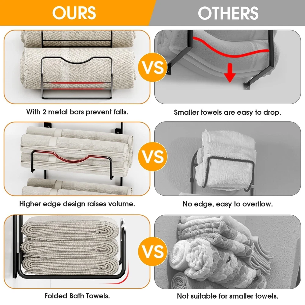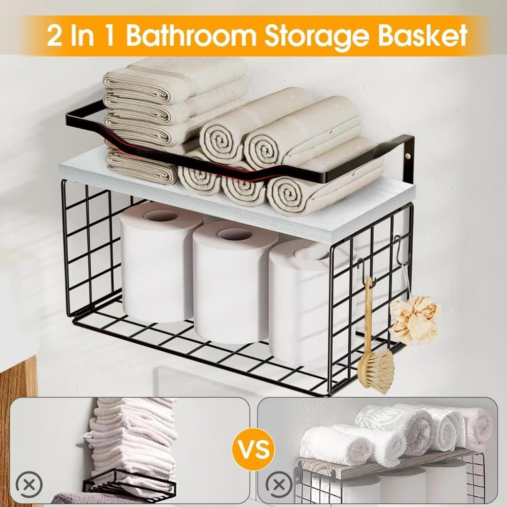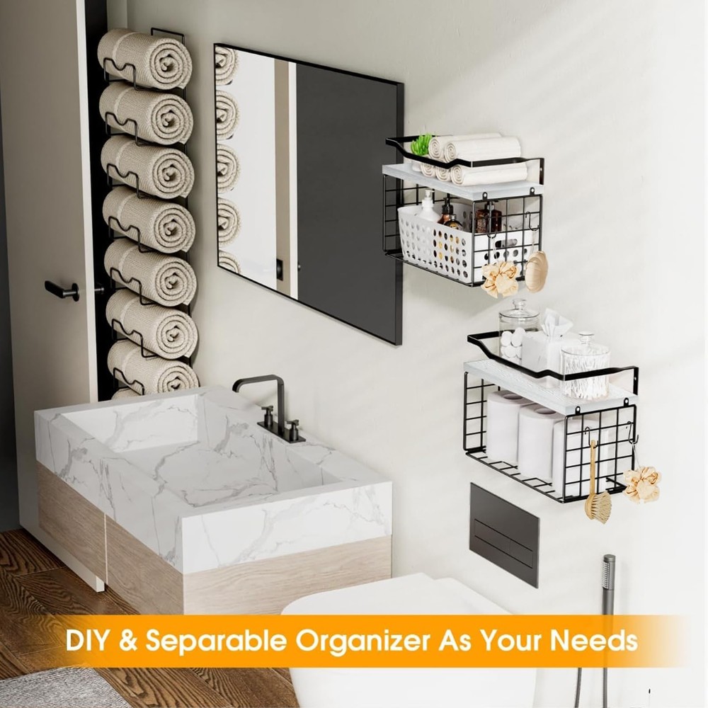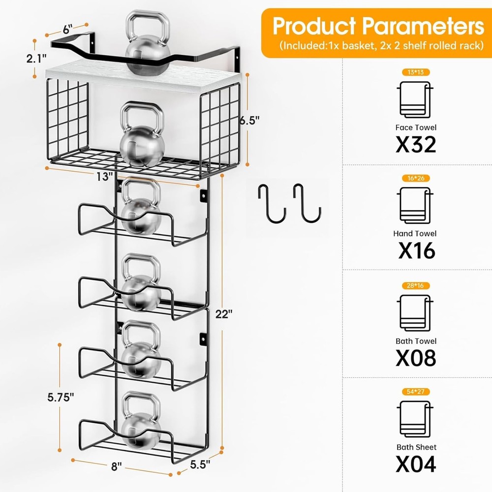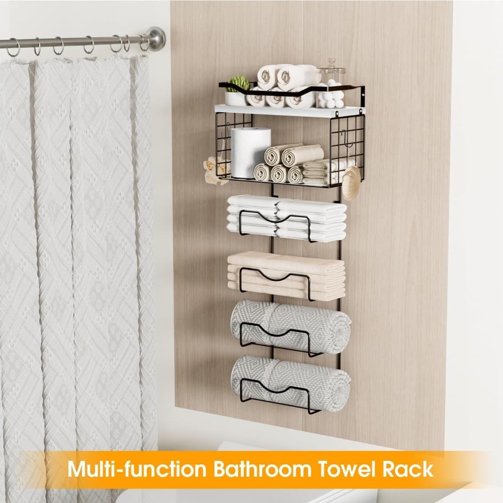 Towel Racks for Bathroom,Towel Rack Wall Mounted, 6 Tier Rolled Or Folded Towel Holder with Floating Shelves, Bathroom Towel Holder for Bath, Hand Towels,Metal,White Wood Panel Space Maximizer - Combined towel rack and floating shelf for towel rack wall mounted maximizes space in small bathroom/apartment/ RV, offers plenty of space for towels, toilet paper and other items in bathroom within easy reach. Multi-Functional Storage - Unlike traditional towel holder, ours with 4 tiers design can store 4 big sized bath towels or 8-16 small sized towels independently, easy to access without interfering with each other. Detachable design is perfect for small spaces. Improved Construction - Towel racks for bathroom add 2 bars at the bottom per tier to make a tighter gap and avoid falling towels; the bottom rectangle form replaces the oval, you can either roll it up for storage or fold it up; higher rim design for extra capacity space. Large Capacity - Bathroom floating shlefes with wire basket is easy to store all kinds of aroma, greens, candle cups, rolling papers, towels, the metal and wood combined makes bathroom towel holder more deco. Use separately from the towel rack. Durable and Easy Setup - High-quality metal and wood materials with surface coating ensure durability, waterproof and rustproof, fit for wet and humid environments like bathroom, and is also an ideal space-saving solution. Use the manual makes mounting towel drying rack simple as ABC.