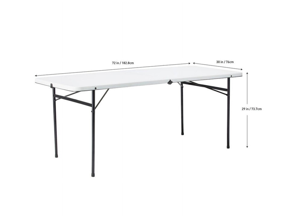 Mainstays 6-Foot Fold-in-Half Folding Table – White Plastic Table with Carry Handle, Indoor/Outdoor Use Add convenience and functionality to any setting with this 72" Mainstays fold-in-half table. Designed for both indoor and outdoor use, it offers a spacious surface, easy portability, and a clean, modern look—perfect for events, gatherings, or everyday use. Key Features: Large Surface Area: 72" L x 30" W tabletop comfortably seats up to 8 adults—ideal for meals, crafts, or displays Fold-in-Half Design: Legs fold in, and the table folds in half for compact storage and easy transport Durable Construction: Made from strong, powder-coated steel and a resin top that resists wear, water, and stains Built-in Carry Handle: Integrated handle allows for easy transportation—great for on-the-go use Rubber Leg Caps: Provide extra grip and protect floor surfaces from scratches Classic White Finish: Neutral color fits effortlessly into any event décor Easy Maintenance: Simply wipe clean with a damp cloth Perfect For: Indoor/outdoor dining Crafting and workstations Tailgating, BBQs, parties, and school functions Garage sales, displays, and more Specifications: Dimensions (Open): 72" W x 30" D x 29" H Seating Capacity: Up to 8 adults Includes: 1 × Folding Table Material: Resin top with powder-coated metal frame Color: White A versatile and portable solution for any occasion—durable, lightweight, and ready when you are.