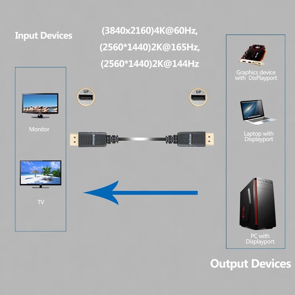 DisplayPort to Displayport Cable 6 Feet, Gold Plated Display Port to Display Port Cable 4K@60HZ ResolutionMale to Male for DisplayPort Enabled Desktops and Laptops to Displays 10 Pack Convenient cable directly connects a DisplayPort (DP, DP++, DisplayPort++) equipped computer to a HD monitor or projector with DisplayPort input Supports video resolutions up to 4K@60HZ (3840x2160, Ultra HD) and 1080P (Full HD), and flawless audio pass-thru for uncompressed digital , or 2 channels Transmits high definition audio and video from your computer to a monitor for video streaming or gaming; Connect and configure your monitor for an Extended Desktop or Mirrored Displays DisplayPort connector with latches provides a secure connection with a release button that must be depressed before unplugging Gold-plated connectors, bare copper conductors, and foil & braid shielding combine together to provide both superior cable performance and reliable connectivity.