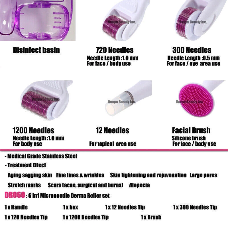 Store category Sign Up Now ! You may also like 6 in 1 Microneedle DERMAROLLER Ser System Anti-aging Stretch Marks Scars Removal Product Description Item Details: Item: 6in1 Derma Roller Set Certification:Medical CE / ISO13485 Model Number:DR-60 Numbers: 12 / 300 / 720 / 1200 needles Lenghts: 0.5 mm / 1.0 mm / 1.5 mm Type: Single Material: Medical Grade Stainless Steel / ABS Plastic Color: White / Grey Package Included: 1.300 tip - (0.5 mm) for eye area 2.720 tip - (1.0 mm) for face area 3.1200 tip - (1.5 mm) for body area 4.12 tip - for topical area 5. Brush - reusable 6.Handle 7.Box Disinfection Requirement: --75% Ethyl Alcohol & Sterile EO Gas Specification: Gamma-Sterilized, 6in1 Roller set, Easy-grip sculptured handle, Finest needles Description: Derma rolling is useful to improve your skin appearance by making it free from acne, wrinkles, saggy skin and other common skin conditions. It creates tiny punctures on the skin for stimulating skin repair and cell generation. But derma rolling is painful process as it involves a roll over of needling drum over your skin. This stimulates natural collagen reproduction and also creates fine channels for the increased delivery (up to 80%) of topical nutrients and skin aiding products. Derma Needling Treatment can address below skin problems: -Aging sagging skin -Fine lines & wrinkles -Smokers lines around the lips -Skin tightening and rejuvenation -Large pores -Stretch marks -Scars (acne, surgical and burns) -Alopecia Application Suggestion: 1)Home Use: 0.2mm / 0.25mm / 0.3mm --Treatment Area: All face & body areas, eye area (used carefully) --Used For: Fine lines & shallow wrinkles,Light pigmentation spots, General anti-aging --Treatment experience: virtually painless / small pain --After treatment: skin redness, usually healed within 24 hours. 2)Clinical Medical Use: 0.5mm / 0.75mm Treatment Area:All body areas, especially larger areas Used For:scars, UV damage, hyperpigmentation,anti-aging, collagen induction, fine lines Treatment experience: 1)0.5 mm - mild pain,apply numbing cream if needed 2)0.75 mm - painful & bleeding, apply numbing cream if needed After treatment:skin redness, dryness and peeling(0.75 mm). Skin usually healed within 48-72 hours 3)Midical Use: 1.0 mm Treatment Area: All body areas, especially larger areas. Used For:Moderate wrinkles/scars, Light cases of stretch marks, Hyper Pigmentation (sun-spots), General CIT (Collagen Induction Therapy) Treatment experience: painful & bleeding, apply numbing cream if needed After treatment:skin redness, dryness and peeling, usually healed within a week 4)Physician Use: 1.5mm / 2.0mm / 2.5mm / 3.0mm Treatment Area:All body areas, especially larger areas Used For: Preferably for deep wrinkles, stubborn stretch marks and scars. Treatment experience: painful & bleeding After treatment:skin redness, dryness and peeling, usually healed within 7-10 days Cautions: 1.Do not use derma roller if you have below conditions: Hypersensitive skin, keloid, raised scars, active acne, eczema, herpes, fungal infection, wounds ,blood clotting problems, cold sores, warts , skin cancers, skin melanoma, moles sunburn, recently had radiation therapy, skin disease. 2.Do not use derma roller on your lips, eyes, sores and open wounds. Do not use size above 1.0 mm on face for beginner. Never share your derma roller. Derma roller is disposable product, repeatedly used could cause infection. Do not use 1.5 – 3.0 mm roller on face unless you are a qualified physician. You should sterilizer the roller for 20-30 minutes before treatment. Do not have more than one derma treatment (0.5-3.0 mm roller) in 4 weeks. Payment Delivery details Terms of sales About us Contact us Payment We accept paypal/ credit card payment via PayPal only and only ship to Paypal CONFIRMED address (NO PO BOX). Please note that all payment should be completed within 7 days after auction/buy now end. Please make sure you understand our Payment method and Shipping policies before purchase. If you need any assistance on your item problem please do not hesitate to contact us, our tehnical support will be there to assist you. Delivery details We ship WORLDWIDE ( Except Italy and Africa) All the orders normally will be shipped out within 2-3 business days after payment received. All nail product we ship through AIR MAIL of Hong Kong Post Office,Machine ship by EMS. In normal condition, please OPEN the packet and CHECK immediately before you sign for the packet. Defective items or missing parts must be reported within 24 HOURS After RECEIVE. If packages are delivered in unfit condition, please refuse shipment and contact us within 24 hours. International Buyers – Please Note: a. Import duties, taxes and charges are not included in the item price or shipping charges. These charges are the buyer's responsibility. b. Please check with your country's customs office to determine what these additional costs will be prior to bidding/buying. If you need any assistance on your item problem please do not hesitate to contact us, our tehnical support will be there to assist you. Terms of sales Please make sure you understand what you are bidding/buying and contact us for all the information you may need before you place an order. All products are thoroughly inspected prior to dispatch. We accept return of 14 days of receipt, please make sure the return item must be in original shape/packing and working order. Buyer pays for all return postage costs and 20 percent restocking fee. Return item must be shipped by registered mail with tracking number. About us We are a professional supplier of Salon Equipment & furniture & Nail product. We focuses on selling quality products directly to worldwide wholesale local dealer, cosmetic company, the end user at Competitive price & Excellent service. Contact us Please contact us for any further information or questions , we will reply you ASAP. Item: 6in1 Microneedle Derma Roller Set Certification:Medical CE / ISO13485 Mo