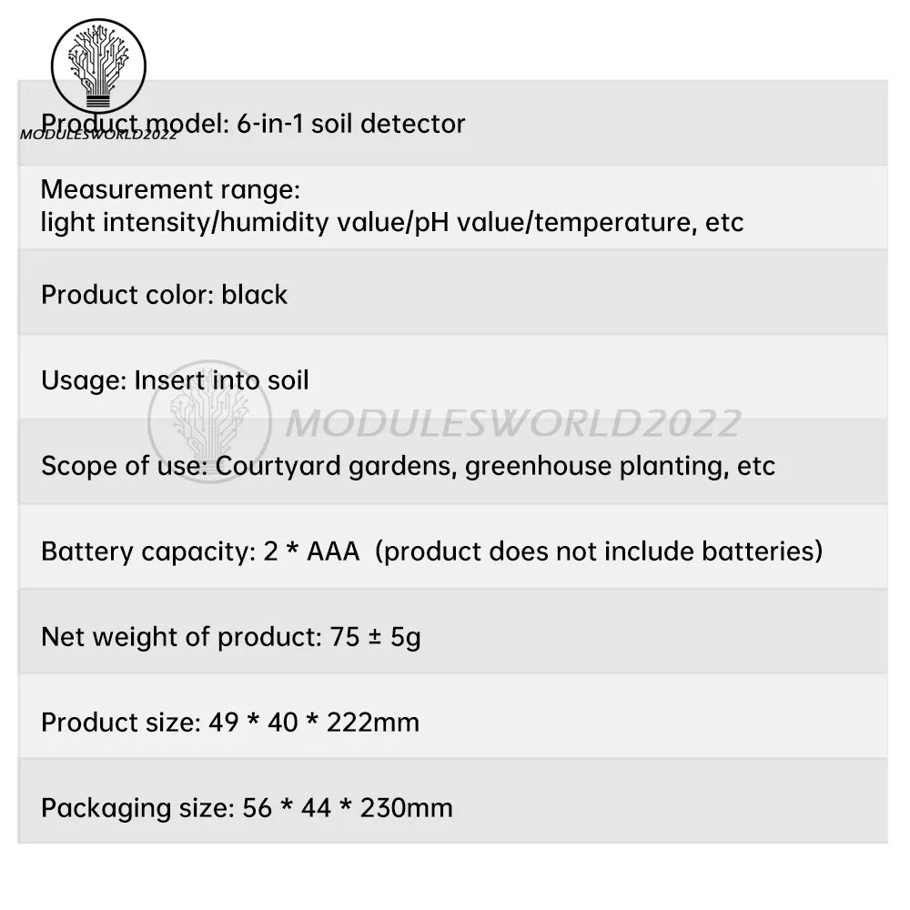 Store Categories Store Categories Other Product View Details Characteristics: 1. Accurately grasp the soil fertility status: 3 seconds to read the test results, the data is accurate for a variety of soils, comprehensive care 2.Soil fertility determines the nutrition for plant survival, creating a quality environment for your soil. 3.Dual temperature ℃/℉ unit switching: soil temperature can be detected at any time. 4. Highly sensitive probe: fast detection and reading of soil information. 5. Backlit screen display: HD backlit screen design, clear readings and multiple parameters are displayed at the same time, suitable for all kinds of soil testing. Parameters: Product model: six-in-one soil tester Measuring range: illumination / humidity / pH / temperature, etc. Product color: black Use: inserted into the soil Scope of use: courtyard garden, greenhouse planting, etc. Battery: 2*AAA (shipped without battery) Package Includes: Tester*1 Instruction manual*1 Shipping Policy Payment Method Returns Policy Shipping Policy Payment Method Returns Policy Home Payment Shipping About us Contact us Copyright©2018 datacaciques Home Payment Shipping About us Contact us Store Categories Store Categories Other Product View Details Characteristics: 1. Accurately grasp the soil fertility status: 3 seconds to read the test results, the data is accurate for a variety of soils, comprehensive care 2.Soil fertility determines the nutrition for plant survival, creating a quality environment for your soil. 3.Dual temperature ℃/℉ unit switching: soil temperature can be detected at any time. 4. Highly sensitive probe: fast detection and reading of soil information. 5. Backlit screen display: HD backlit screen design, clear readings and multiple parameters are displayed at the same time, suitable for all kinds of soil testing. Parameters: Product model: six-in-one soil tester Measuring range: illumination / humidity / pH / temperature, etc. Product color: black Use: inserted into the soil Scope of use: courtyard garden, greenhouse planting, etc. Battery: 2*AAA (shipped without battery) Package Includes: Tester*1 Instruction manual*1 Shipping Policy Payment Method Returns Policy Shipping Policy We will arrange shipping for you within 24 Hours after payment cleared except the holidays. -We ship items to Worldwide. Thank you! -we will ship out the order in 1-2 business days after payment cleared .Since it is international shipping ,delivery time is about 15--28 business days to arrive to most countries. Payment Method We accept PayPal payment ONLY, and must be received within 5 days from the date of purchase. 2. It is easy and safe for you to pay by credit cards, debit cards, bank transfers and PayPal account balances. 3.Buyers are responsible for import duties,custom fees and taxes, if any, please check your country. Returns Policy 1.We believe our items are so outstanding. We are convinced you will be happy with your Purchase. 2. If you do not satisfy with our items. Please simply return to us within 30 Days in original condition. Just pay for the returned postage. Then we can issue full refund or resend the item to you after the returned item arrived at our warehouse. 3. Please include your eBay ID and item number with any email requests.