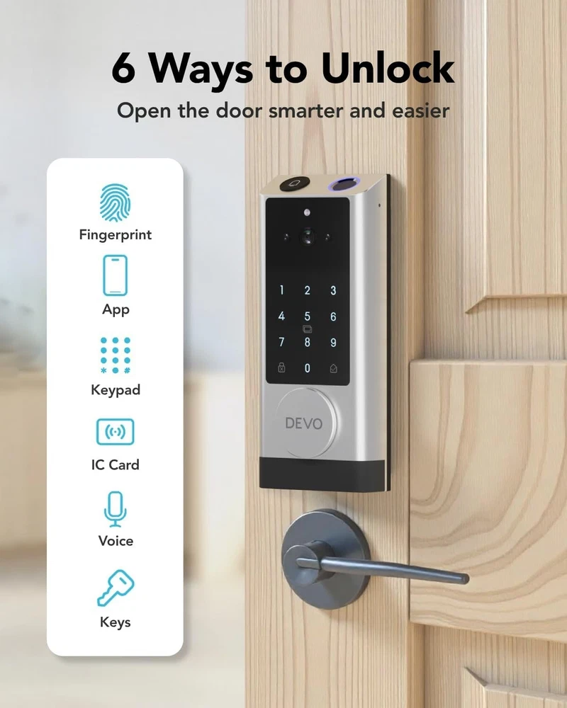 The 6-in-1 Upgraded Smart Lock is a keyless entry electronic lever door lock that allows you to program up to 30 user access codes that can be customized for family, friends or guests. It is easy to install, program and use, and it also features smart key security as a backup key slot. This entry lever can be locked or unlocked using a keypad or key on the outside and a rotary button on the inside. Combine the convenience of keyless entry with the highest residential security ratings and leading designs and finishes to enhance any door in your home. Perfect for a home office, storage room or interior garage door, the 6-in-1 Upgraded Smart Lock provides the right access solution to make your life more convenient, stylish and secure. Our smart locks are available in two styles - traditional and modern to match your home decor. In addition to this, our smart locks are available in three colors: Metallic Black, Premium Gray, Silver Gray. 【Wi-Fi Enabled】:6-in-1 Smart lock is a Wi-Fi-enabled door lock that connects directly to your home Wi-Fi network and smartphone for a secure smart home that does not require a third-party smart home hub, panel, or subscription 【APP Remote control】 Tuya APP, support Google Assistant, Amazon Alexa,Support remote unlocking and authorization, convenient for managing visitors or temporary users,Increase convenience.Receive notifications of your lock's activity and view the lock event history from your smartphone using the app for easy query and management 【Improve security】: Multiple unlocking methods (such as fingerprint, password, mobile phone App, etc.) Intercom, human body detection, automatic capture and upload to APP, automatic lock (timed anti-lock). Independent door Bell button, approach light reminder, automatic recognition of left and right door opening,reduce the safety hazards of traditional keys 【Multi-user management】: Support fingerprint, password or mobile phone authorization for multiple users, convenient for family members or employees,Switch between three entry modes: Multiple locking settings include ""Auto Lock"" (locks after every entry and exit), ""Passage"" (stays unlocked and no key or code required), and ""Disable Passage"" (for property managers, auto-locks every time and a key or code is always required for entry). 【SecureScreen&Digit Keypad&】Patented security feature for touchscreen deadbolts that prevents on-screen fingerprint user code identification by employing random digits prior to entering a personal user code,eypad deadbolt is backlit and comes with a dedicated one-touch locking button for keyless convenience"