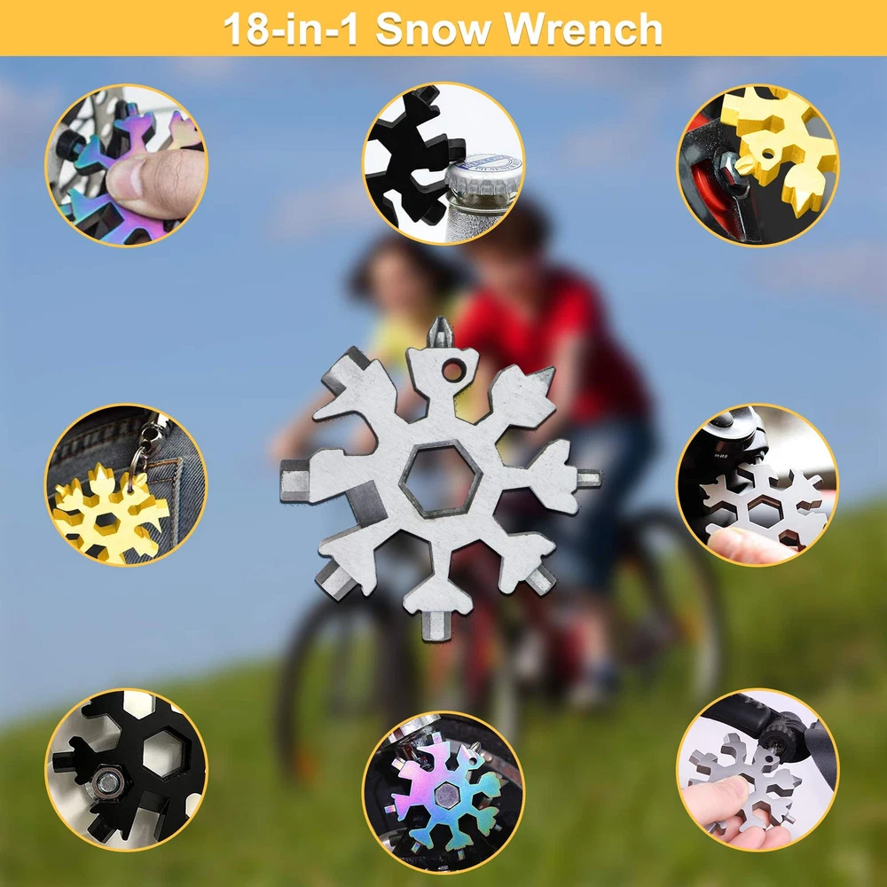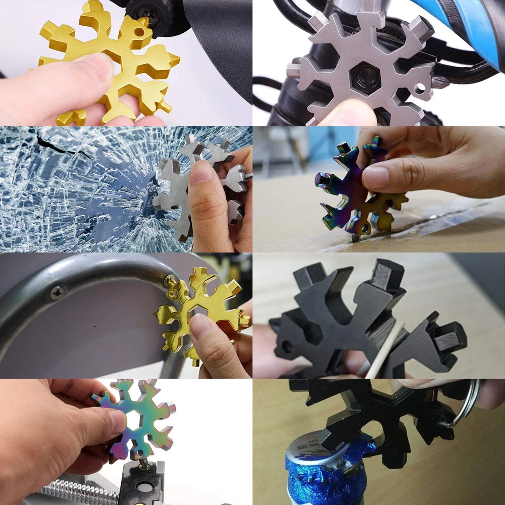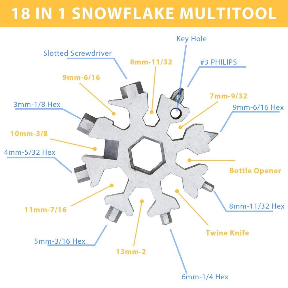 18 in 1 SNOWFLAKE MULTITOOL:Each snowflake tool has more than 18 uses,such as hexagon screwdrivers,wrenches,slotted screwdrivers ,phillips screwdrivers of different sizes.It can be also used ,Bottle Opener, Box Cutter,Rope Cutter,Gift Hanging Drop,etc. SMALL SIZE& KEYRING DESIGN: Our snowflake multi tool is Pocket Size.It just over 2.5" in diameter.It is so easy to be taken along.Because snowflake tool comes with a key ring that can be hung on a key or backpack.Key ring is designed to avoid the possibility of loss. MULTIPLE USES: One snowflake tool to unlock for multiple purposes.One snowflake multitool can be used to open the beer bottle,turn the screw,fix snowboarding,bicycle,Toys and more.It can be also used to open the carton, hung on the key or backpack. Hang on the Christmas tree for decoration or as a gift.When camping,rescue,boarding also be used. BEST CHRISTMAS GIFT: You will get 6 x multi-tool,6 、x key rings.It is an excellent gift for Christmas gifts.It's a good choice whether it's for Christmas decorations or as gifts. STURDY&DURABLE:18 in one snowflake tool is made of high quality stainless steel,exquisite workmanship.It is so sturdy and durable.Unique snowflake shaped design.Combine function and design in our compact multi-tool. Practical and beautiful.