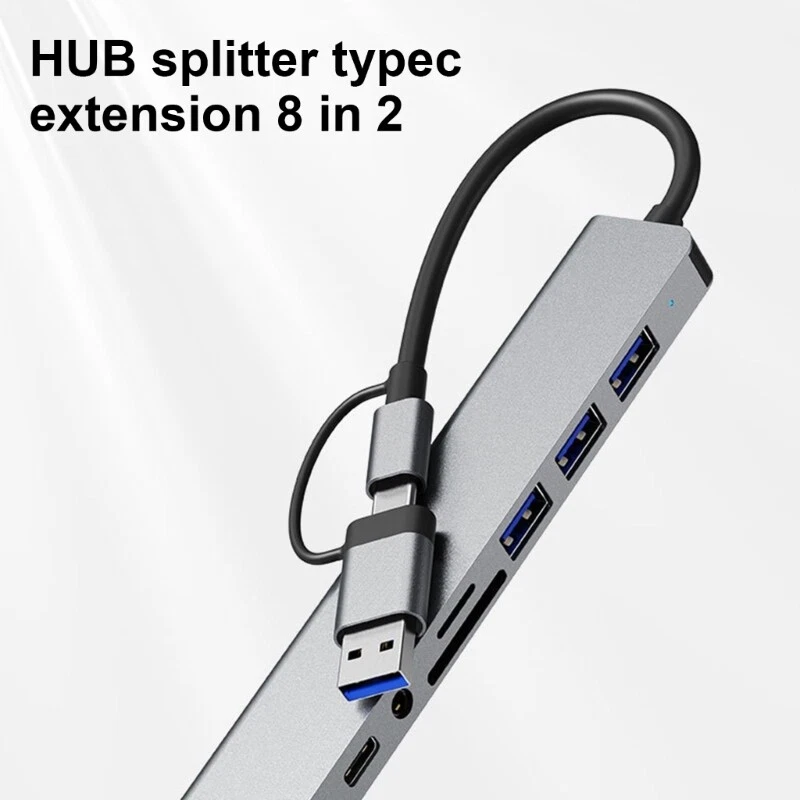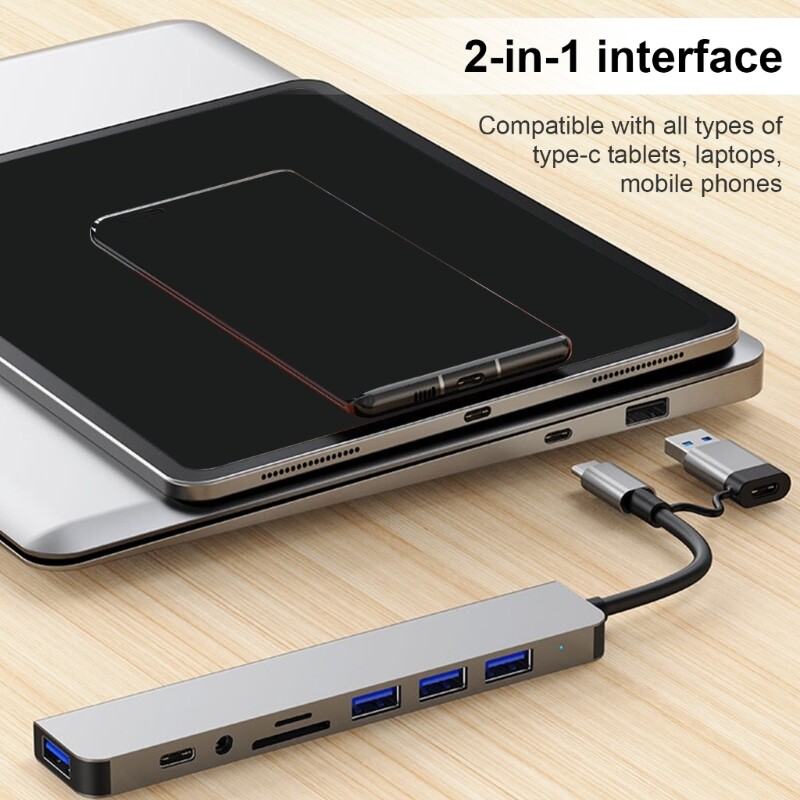 Features: the full potential of your devices with our USB3.0 Type C Hub, featuring multitudes of port including USB, card slots for comprehensive connectivities. Crafted from aluminum, this hub supports high speed data transfer and charging, ensuring efficient syncing across all your gadgets. Suitable for digital enthusiasts, office workers, and students who require a seamlessly integration of multiple devices for work, study, and entertainment. Improve your work room home or in office, or take it on the go for business trips, thanks to its small design that fits easily into any bag. Expand your ecosystem; this hub connecting everything from mice and keyboards to monitors. Specifications: Material:Aluminum Size:Approx.138x28x10mm/5.43x1.14x0.39inch Interfaces:USB3.0x1,USB2.0x3,TF+SD Card Reader,USB C Data Transfer Port,3.5mm port, Package Includes: 1pc USB C Hub note: Please allow 1mm errors due to manual measurement. Due to the differences between different monitors, the picture may not reflect the actual item color.