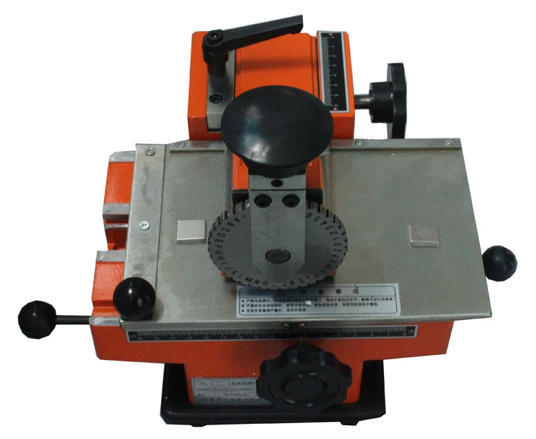 6mm Semi-automatic sheet embosser metal stamping printer label marking machine Note:This item Font size is 6mm,if you need other size pls contact us! Application: Emboss on all types of aluminum, copper, stainless steel, plastic tag for mechanical, electrical, pumps, valves, automobiles, motorcycles, electrical appliances. It embosses variable parameters: such as dog tag, specific model, date, batch number, serial number, serial number and so on. Principles: 1.The external force (hand pressure or a rubber hammer) will emboss letters or numbers on the metal plate with a certain depth (0.1 ~ 0.3mm deep). Its stepless adjustment agent will adjust the embosser position, word spacing, and line spacing. The character heights can be adjusted by changing different. Different letters and numbers can be easily changed by turning around the plate. 2.Maximum label size: 200*130mm 3.Print characters: uppercase letters, digits, and simple symbols 4.Font size: 2 mm, 3mm, 4mm, 5mm, 6mm (This item Font size is 6MM ,if you need other size,please tell us) 5.Print speed: about 2-4 characters / 10 seconds 6.Printing content including: A B C D E F G H I J K L M N O P Q R S T UV W X Y Z 123456789 . x / - Instructions for use: 1.The placing of signs methods, Signs placed in the work surface as shown upper left corner, with the signs and magnet clip without compression plate loosening. 2.Wheel loading and unloading, first used the word wheel wrench to remove the wheel nuts, and selected the right wheel, wheel lock fitted to the nut, aligned pointer. 3.Print, and start position adjustment, good signs placed to separate the clutch, turn the hand wheel spacing and kerning hand wheel so that wheel aligned characters printed on the box location just above the lock extension units, release the clutch lever, under pressure for a few kerning feed handles can be seen feeding on the caliper spacing density (hand wheel with a good tune kerning) depress the clutch, turn the hand wheel, release the clutch lever back in situ, with the palm of your hand slap of rubber parts, spacing after the feed handle pressure, to achieve printing. What's in Package: 1 x Semi-automatic marking machine 1 x 6mm Font