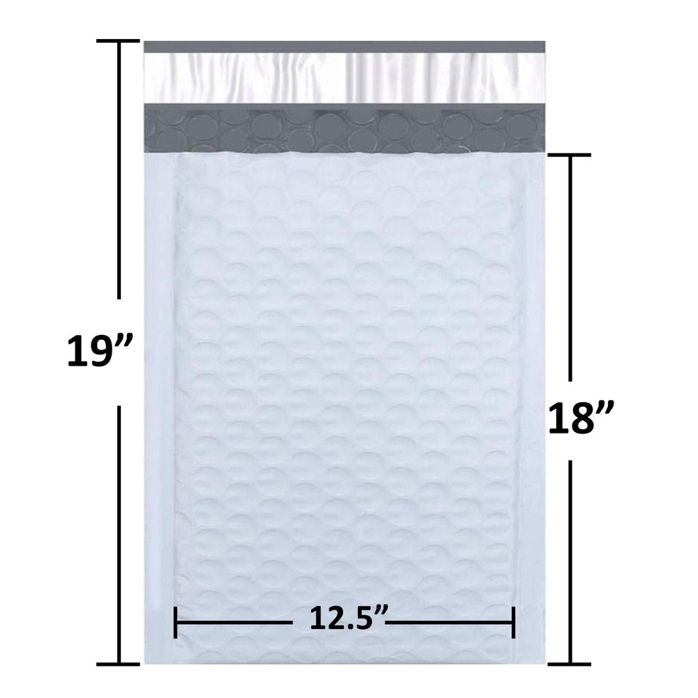brand our white poly bubble mailers #6 12. 5x19 inches with 3/16” bubble cushioned wraps help ship your products to customers in a safe Packaged mailer. Whether you’re shipping crafts to customers or gifts to family and friends, Our high quality bubble bags make an excellent package that allows you to send your items with confidence and ease. You can count on these envelopes to not only close securely, but to also protect your valuable shipment from inclement weather and excessive moistures. Lined with thick, yet airy, Bubbles, These mailers embrace your items in a safe cushion of air and plastic, ensuring their safe arrival at their definition. Peel-and-seal strip is quick and easy to use. Remove strip and close. Once the envelope has been sealed, it cannot be opened without visible signs of tampering. Puncture, tamper and water resistant providing extra security for item being shipped. Order your supply of these Poly bubble mailers today to avail our quick shipping policy. POLY BUBBLE MAILERS - This pack contains 50 light weight bubble cushoined poly mailer envelopes. Outside size: 12.5X19 inches, usable size: 12.5X18 inch. WATER RESISTANT POLY BUBBLE ENVELOPES: Water-resistant and tear-proof mailer protects delicate products. This mailer provides outstanding storage and shipping protection against water, snow and dirt. MATERIAL - These poly bubble mailers are made out of polypropylene material, 3/16" bubble cushioning wraps to help keep objects safe in shipping. They are 100% light weight and ad no cost to your shipping destination. SELF-ADHEARING - Peel-and-seal strip is quick and easy to use. Remove strip and close. Once the envelope has been sealed, it cannot be opened without visible signs of tampering. Puncture, tamper and water resistant providing extra security for item being shipped.