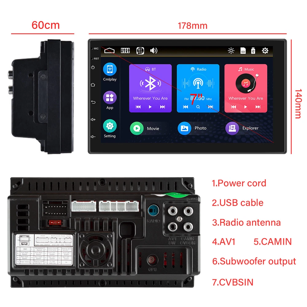Features ●Carplay: You can use wired connection to carplay, connect to Apple mobile phone, access mobile phone address book, mail, notification, map navigation, music, video and other information, and realize voice control. ●Wired Android auto: The wired Android auto car system can closely integrate the user's Android phone and player, and realize navigation, make calls, send and receive information, listen to music and other operations through data cable connection,Applicable to Android phones (not applicable to Huawei brand phones) ●Screen: 7-inch high-definition video playback ●Mirror Link: Support Android/ Iphone Mirror Link,through phone's original USB line Can synchronized to the on-board screen,which can support Apple mobile phone 13.4 version, Android mobile phone version 10.1. More than this version or does not support mobile phones, need to upgrade the software after the original factory debugging ●Built-in Bluetooth function, can connect to phone, and handsfree calling, more safer when driving car,bluetooth music play ●FM radio: You can listen to real-time traffic, news boradcasts, weather forecasts, etc receiver 18 preset Store Function ●Support Steering wheel control function : Quickly switch functions which you want with your car's steering wheel,more convenient ● Rear view camera input function(optional):Need to choose the camera, if connect to a car backup camera, the car stereo monitor will turn to rear view reversing details automatically(require optional) ●AUX audio input interface supports external MP3, mobile phones, music players, etc. Specifications: Voltage:DC 12V Operating system:Android 13.0 Apple CarPlay: Support Wireless/Wired Connection Android Auto: Support Wireless/Wired Connection CPU: Quad Core RAM:2G ROM:32G Screen size:7 inch 2.5D Capacitive touch screen Bluetooth Version:5.0 Mirror link:Android/IOS Screen Resolution:1024*600 Output Power: 4*45Watts USB Interface: USB2.0 Radio Range:FM 87.5-108.0MHZ (Europe) Operating temperature:-10℃ ~ 60℃ External microphone: support Audio format:MP3/WMA/APE/FLAC/WAV/OGG Videoformat:RM/RMVB/DVD/(VOB)/VCD(DAT)/MP1/MP2/MP4/H263/H264/FLV/3GP/SWF/AVI/ASF/MIPEG Language:English/Chinese/Portuguese/Spanish/Russian/German/Italian/Persian/French/Japanese/Turkish/Czech