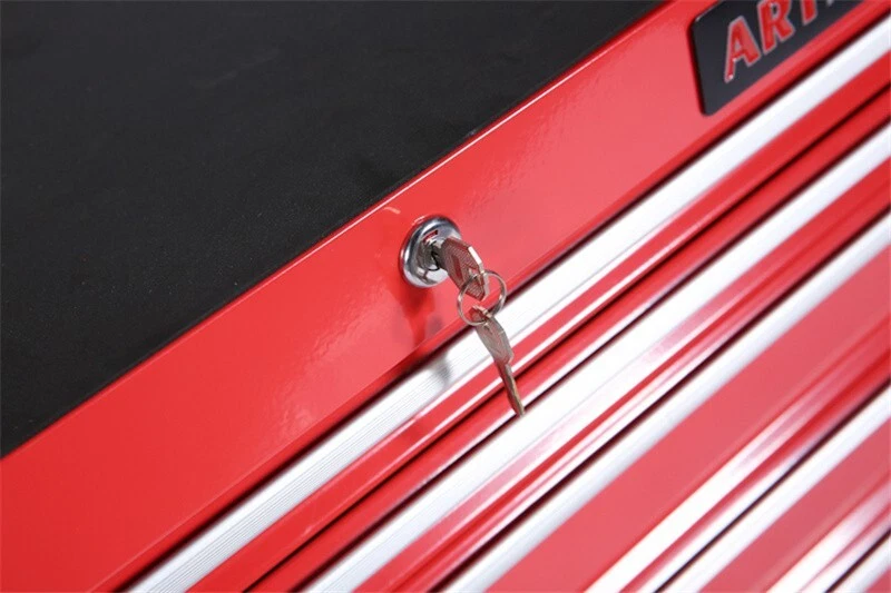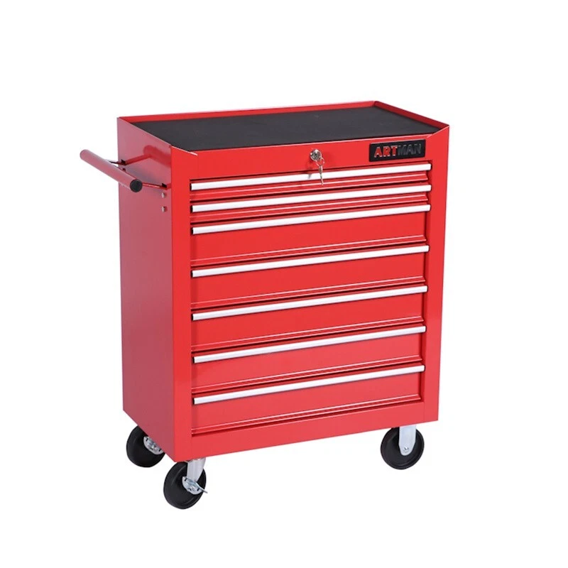 Features and Details : The ARTMAN tool trolley is equipped with a total of 7 drawers . The tool box is also lockable and can be used as a removable, attachable and mobile case attachment The opening and closing of the drawers of the tool cabinet is very gentle thanks to the ball-bearing drawers. The robust and powder-coated steel construction is used for high wear resistance. This assembly trolley has 4 steering wheels, 2 of which with parking brakes, so you can move the trolley freely in the garage, but also stop in one place Specification: Color:Red Material:Cold Rolled Steel Surface Finish :Powder Coating Casters:4" Casters (2PCS with brake and 2PCS without brake) Size :24.2*12.9*29.9inch Drawers Dimension :19.9*10.9*3.1inch Net Weight:25KG