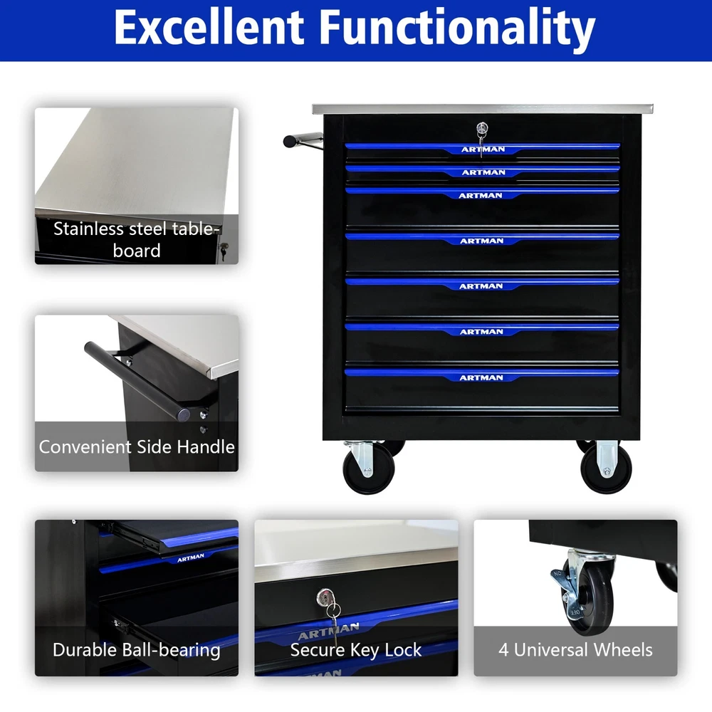 7-Drawer Metal Rolling Tool Chest with Wheels,Tool Storage Cabinet With Locking System,Toolbox with Wheels for Garage, Warehouse, Workshop, Repair Shop(Blue mix black, 7-Drawer) 100% Metal 【ALLOY STEEL MATERIAL UPGRADE] Elevate durability with our enhanced toolbox featuring thickened cold-rolled steel and a triple-layer powder coating. It offers superior strength and longevity, perfect for diverse indoor and outdoor applications. 【LARGE CAPACITY】 Our toolbox boasts 7 roomy pallet drawers, paired with a safety lock that locks all drawers. The drawer chest facilitates systematic organization, optimizing work efficiency by keeping all tools neatly arranged. 【EASY to ASSEMBLE】 Most parts are pre-assembled. Simply install the wheels on the bottom and the hooks on the side. 【REMOVABLE&NO-SLIP】 The robust and powder-coated steel construction is used for high wear resistance. This assembly trolley has 4 steering wheels, 2 of which with parking brakes, so you can move the trolley freely in the garage, but also stop in one place. 【MULTIFUNCTIONAL&PRACTICAL】 Perfect for home workshops and professional settings, our rolling tool box is suitable for garages, workshops, warehouses, and more. Its attractive design doubles as functional furniture, making it a versatile addition. Not just a tool organizer, it also makes an excellent gift for holidays, birthdays, and anniversaries. -------------------------------------------------- Specification: Product name 7 drawers Workshop tool trolley Metrail Cold Rolled Steel Surface Finish Powder Coating Casters 4" Casters (2PCS with brake and 2PCS without brake) Product Size (with wheels and countertops) 25.91*13.58*26.46INCH Prouduct Size (with countertops) 25.91*13.58*25.98INCH Package Size 27.36*15.16*28.94INCH Color Black+Blue Net Weight 63.27LBS Gross Weight 70.11LBS Package Include: 1 x tool cart (tools are not included) 1 x manual -------------------------------------------------- ABOUT US: We welcomes your arrival, we focus on higher quality furniture products. We aim to provide you with a more convenient and relaxing life, hoping to help you and you loved one to enjoy more leisure time. SHIPPING: (1) When we receive the order, we will immediately check the order. If the information of the order is insufficient, we will email you immediately. Please check the email within the first day after purchasing the product to avoid the delay delivery. (2) Under normal circumstances, you will receive the goods on 2-8 working days. If the address belongs to remote areas, the time will be longer. Please understand if encounter blizzard weather. (3) Currently, we do not ship to APO/FPO/PO Boxes. RETURN POLICY【Ask the seller a question】: (1) For damaged or defective items, just contact us using the " Ask the seller a question" link on eBay, please send pictures for us to check. We will help you within 24 hours and provide good solutions as soon as possible. (2) For the wrong purchase, no longer need, not in line with expectations or the items rejected during delivery: Please contact us to get an authorization and returning address before sending the item back.If an item is returned because of an undeliverable shipping address, buyer agrees to pay the cost for re-shipment. (3) Cancellation order: You can cancel the goods at any time before they are shipped. If the tracking number has been uploaded, please contact us and we will help you. CONTACT US【Ask the seller a question】: If you have any questions, please contact us at any time. Due to the time difference, we may not be able to reply to you immediately, but we will definitely reply to you within 24 hours.