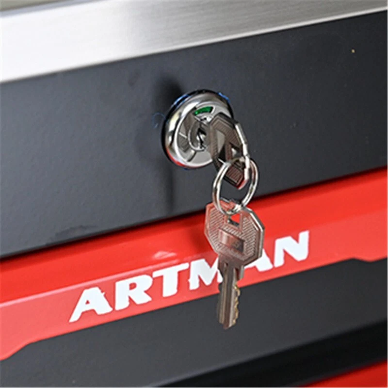 Features and Details: The ARTMAN tool trolley is equipped with a total of 7 drawers . The tool box is also lockable and can be used as a removable, attachable and mobile case attachment The opening and closing of the drawers of the tool cabinet is very gentle thanks to the ball-bearing drawers. The robust and powder-coated steel construction is used for high wear resistance. This assembly trolley has 4 steering wheels, 2 of which with parking brakes, so you can move the trolley freely in the garage, but also stop in one place This is a set of cabinets, can use a round hook at the bottom of the table to connect another tool car, thus forming a combination. Specification: Color: Black+Red Metrail:Cold Rolled Steel Surface Finish :Powder Coating Casters:4" Casters (2PCS with brake and 2PCS without brake) Product Size (with wheels and countertops):22.28*13.58*30.71INCH Product Size (without wheels and countertops):20.63*12.99*25.16INCH Weight (lbs.): 59.30