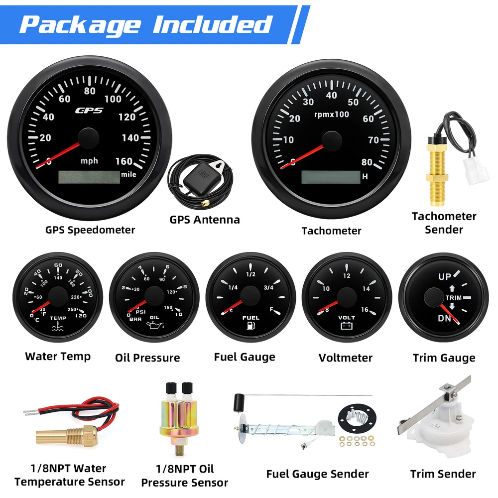 85mm GPS Speedometer 120MPH with 6 Gauge Set, Tachometer 8000RPM, 52mm Fuel Oil Water Volt Meters