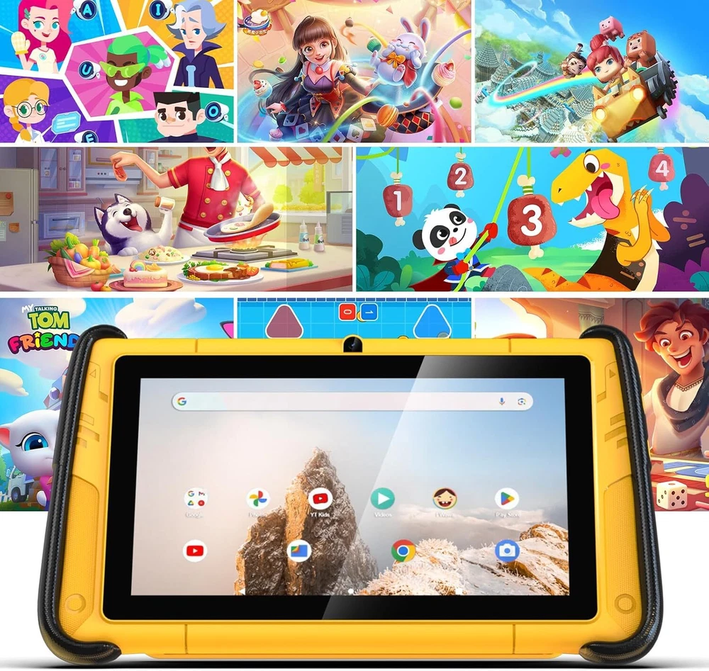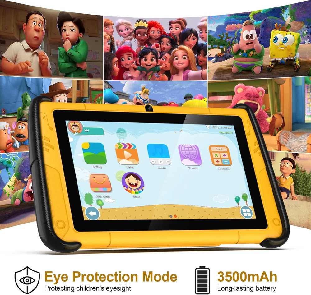 7 Inch Kids Tablet, Android 12 Tablet for Children with Game Yellow Product Details Standing screen display size: 7 Inches Screen Resolution: 1024x600 Max Screen Resolution: 1024 x 600 Pixels Processor: 1.5 GHz Card Description: Integrated Wireless Type: 802.11n Average Battery Life (in hours): 6 Hours Brand: VOLENTEX Model Name: K7 Memory Storage Capacity: 64 GB Screen Size: 7 Inches Display Resolution Maximum: 1024 x 600 Pixels 【High-performance Configuration】: The Volentex 7-inch kids tablet boasts a powerful configuration. It runs on Android 12 and features a 1.5GHz quad-core processor, coupled with 3GB of RAM and 64GB of internal storage. With expandable 512GB (microSD card not included). With a 300,000-pixel front camera and a 2 million-pixel rear camera to capture beautiful moments. Making it an ideal companion for children and igniting their learning interests, imagination, and creativity. 【Edutainment &&Eye Protection】: Kid tablets for toddlers with our pre-installed IWAWA app, children can enjoy the perfect blend of education and entertainment. Parents can also download child-specific apps from the Google Play Store. Additionally, the tablet comes with a child-friendly pre-installed video app , creating a safe online environment for joyful and productive learning. The eye protection mode can be enabled during extended tablet usage to safeguard children's eyes from harm. 【Controllers & Racing Protective Case】: The tablet for kids to enhance the user experience, offer dedicated accessories: controllers and personalized racing protective cases. These accessories not only allow children to immerse themselves in the world of gaming but also incorporate educational elements to promote learning through play. The eye-catching design of the accessories is sure to captivate children's attention. (the case is non-removable). 【Parental Control System】: Our kid tablet features a comprehensive parental control system. It allows parents to effectively manage their child's tablet usage by setting time limits and choosing suitable educational videos, games, e-books, and fun content. Parents can also set educational goals for their children and ensure that they are exposed to growth-enhancing content while filtering out any material that may hinder their development. 【Packaging&After-sales Service】: The product package includes a children's tablet, two controllers, a controller connector, an adapter, and a charging cable. If you have any questions or encounter any issues during the purchase or usage process, please do not hesitate to contact us. We are dedicated to providing excellent after-sales service and support.