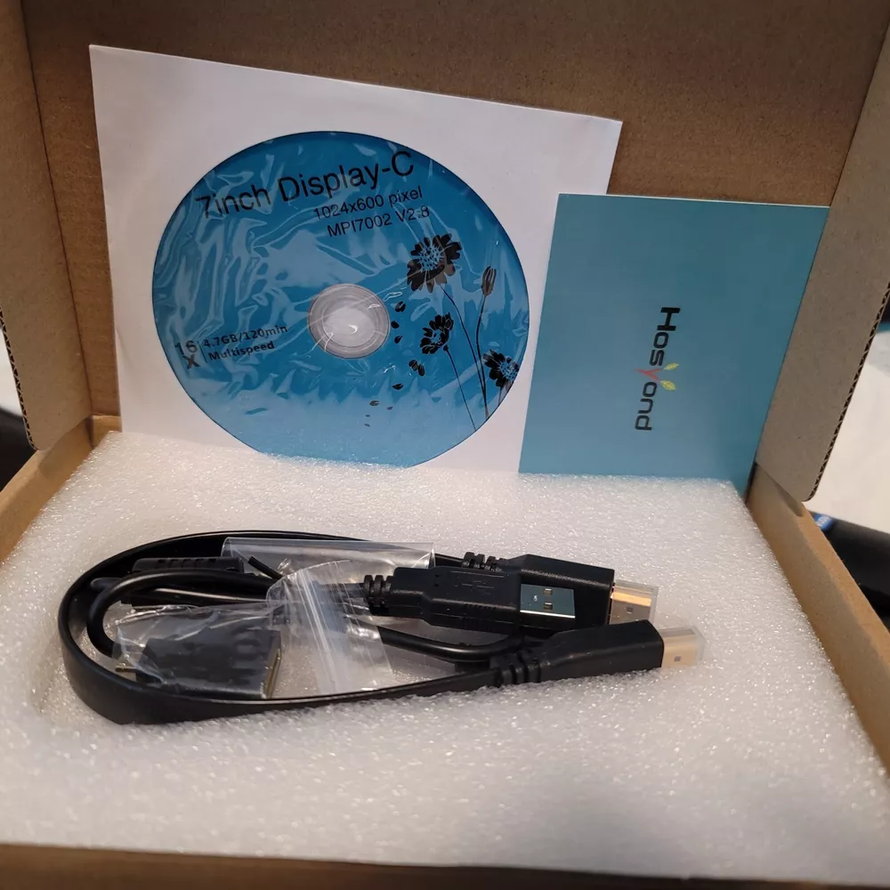 Model: HOSYOND Size: 1024 600, 800x480 pixel USB: YES Touchscreen: YES Drivers Included: Yes Cables: HDMI, USB-A TO USB-C ADAPTER MISC: 4 SCREW AND NUTS INCLUDED Condition: New with Box