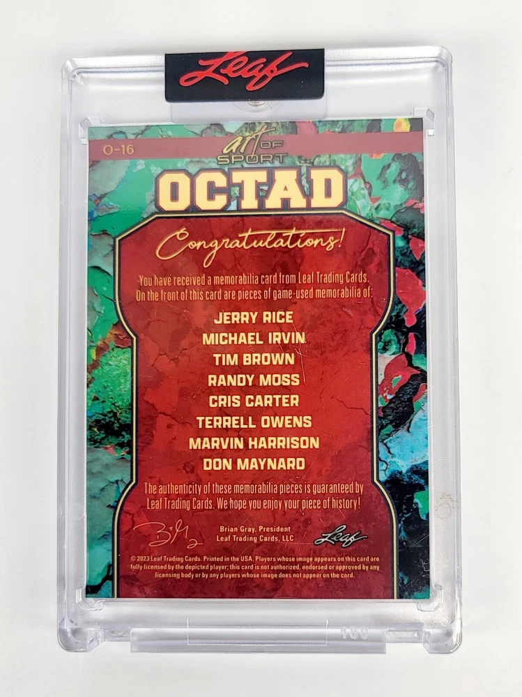 This rare and highly sought-after sports trading card features some of the greatest names in NFL football, including Jerry Rice, Michael Irvin, Cris Carter, Tim Brown, Randy Moss, Don Maynard, Terrell Owens, and Marvin Harrison. The card is a limited edition 2023 Leaf Art of Sport set with a print run of only 7, and is a red spectrum holofoil parallel/variety. Game Used jersey patches!! In addition to the exclusive and highly sought-after design, this card also features memorabilia from some of the featured players, including the New York Jets, San Francisco 49ers, Minnesota Vikings, Dallas Cowboys, Philadelphia Eagles, and Indianapolis Colts. With its short print, serial numbering, and other unique features, this card is a must-have for any serious football card collector.