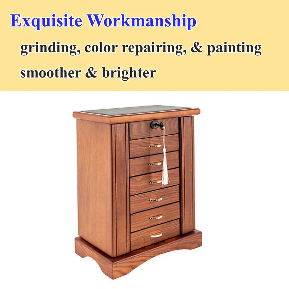 7 Layers Wooden Jewelry Ring Display Organizer Case Large Earring Storage Box US Description Every girl has some beautiful jewelry, which can provide us with a better mental outlook. But how to store it often makes us feel distressed. Our seven-layer jewelry box can help you solve this problem. It is made of MDF. The jewelry box is sturdy and durable, ensuring that you can use it for a long time. Large capacity and reasonable layout can help you store all kinds of jewelry in boxes and create a clean environment for you. It will be a good assistant in your daily life. Specifications Material: MDF Lining Material: Flocking Cloth Surface Treatment: Grinding, Color Repairing, and Painting Color: Walnut Style: Retro Shape: Rectangular Mounting Type: Free-standing Closure Type: Key Lock Number of Layers: 7 Net Weight: 6kg/13.23lbs Gross Weight: 6.5kg/14.33lbs Product Size: 28.3*17.6*36cm/11.1*6.9*14.2inch Package Size: 34.5*26*43cm/13.58*10.24*16.93inch Package Included 1* Jewelry Box 1* Key Key Features Premium Material: The jewelry box is made of MDF and flocking cloth, which is durable and not easy to deform. The flocking cloth can better protect your jewelry from scratches. Exquisite Workmanship: The jewelry box adopts grinding, color repairing, and painting to make the surface of the product smoother and brighter, which shows our attitude toward beauty and life. Large Capacity: The jewelry box is equipped with seven layers in total. Such a large capacity allows you to store many items, such as necklaces, watches, etc. at one time, saving desktop space and fully meeting your needs. Reasonable Layout : According to different sizes and types of jewelry, this jewelry box is designed with compartments of different sizes, as well as special necklace hangers, ring rolls, etc., so that you can store, take and display your jewelry better. Beautiful Appearance: The jewelry box is walnut in color, demonstrating antiquity and nobility. With smooth lines, the whole jewelry box is full of fashion and elegance. It can also make your room more attractive. Customer-friendly Design: The intimate cover with a mirror provides waterproof and dustproof performance to better protect your jewelry while facilitating your makeup. Ready to Use : The jewelry box does not need to be assembled. You can use it directly after receiving the goods, saving you time. Easy to Clean: The surface of the jewelry box is smooth, so you don't need to spend much effort to clean it. When dust accumulates, you can clean it with a wet towel. Small Floor Space: The overall size of the jewelry box is 11.1 * 6.9 inches, which will not occupy too much space, so you can put it in the bedroom, dresser, and other places at will. Ideal Gift: With a beautiful appearance, unique design, and enough space, you can give it to your mother, lover, or friend, or regard it as a gift for Valentine’s Day, Christmas, and birthdays. Protective Packaging: Both foam and bubble bag are used in the package of the jewelry box, which can protect the product well during transportation so that it can be delivered to you completely. Details Key: A key is provided in the package of the product, and the top of the product is equipped with a lock catch, which is convenient for you to access jewelry and prevent the loss of items. Beautiful Handle: Each drawer of the jewelry box is equipped with a handle with a metallic luster, which is beautiful and convenient for you to take jewelry. Hook: The compartments on both sides of the jewelry box for storing necklaces are respectively equipped with four hooks, which are solid and firm. You can better place and store necklaces and avoid knotting necklaces. Base: The base of the jewelry box is very firm, which can make the jewelry box more stable and not easy to shake. Round Corners: The edges of the jewelry box are very round, which can prevent your hands from being scratched, so as to better protect your safety. Application The product can be widely used to store watches, necklaces, earrings, rings, and other items, and can be placed in the living room, bedroom, dressing table, and so on. Notes Please pull the drawer carefully when using it, and do not use force to destroy the handicraft. Please keep this product away from water sources. Please allow the slight color difference caused by the shooting light and 1-3cm error due to manual measurement, and make sure you do not mind before you order. Payment Delivery details Terms of sales About us Contact us Payment We accept ebay payment 。 Fees such as import duties, taxes are not included in the item price or shipping costs. These charges are the buyer's responsibility. Delivery details Shipping: 2-9 working days to: USA Terms of sales We maintain high standards of excellence and strive for hundred percent customer satisfaction. Feedback is very important to us. We hope that you contact us immediately before you give neutral or negative feedback, so that we can address your concerns. It is impossible to address issues if we do not know about them! About us Your satis faction is our ultimate goal. We work hard to earn your trust and future business. Our certified technicians have tested each item before shipping. The unit comes with 1 year limited warranty on all manufacturing defects. a) If you receive a defective item, you may return it or ask for a discount. Please contact us within 14 days after you receive the package. b) What you returned must be intact and in its original packaging as re? u. Customer is responsible for shipping costs of the returned item. c) We will cover the cost of shipping back t with the shipping rate indicated in the registration page. We will send you a new unit or refund the full payment you paid. Thank you. Contact us Business Hour Business Hour: Monday To Friday: 8:30 AM to 5:00 PM (Beijing China time) Due to time zones, our reply to your questions may not be immediately. But within above working time, we will reply your email within 24 hour