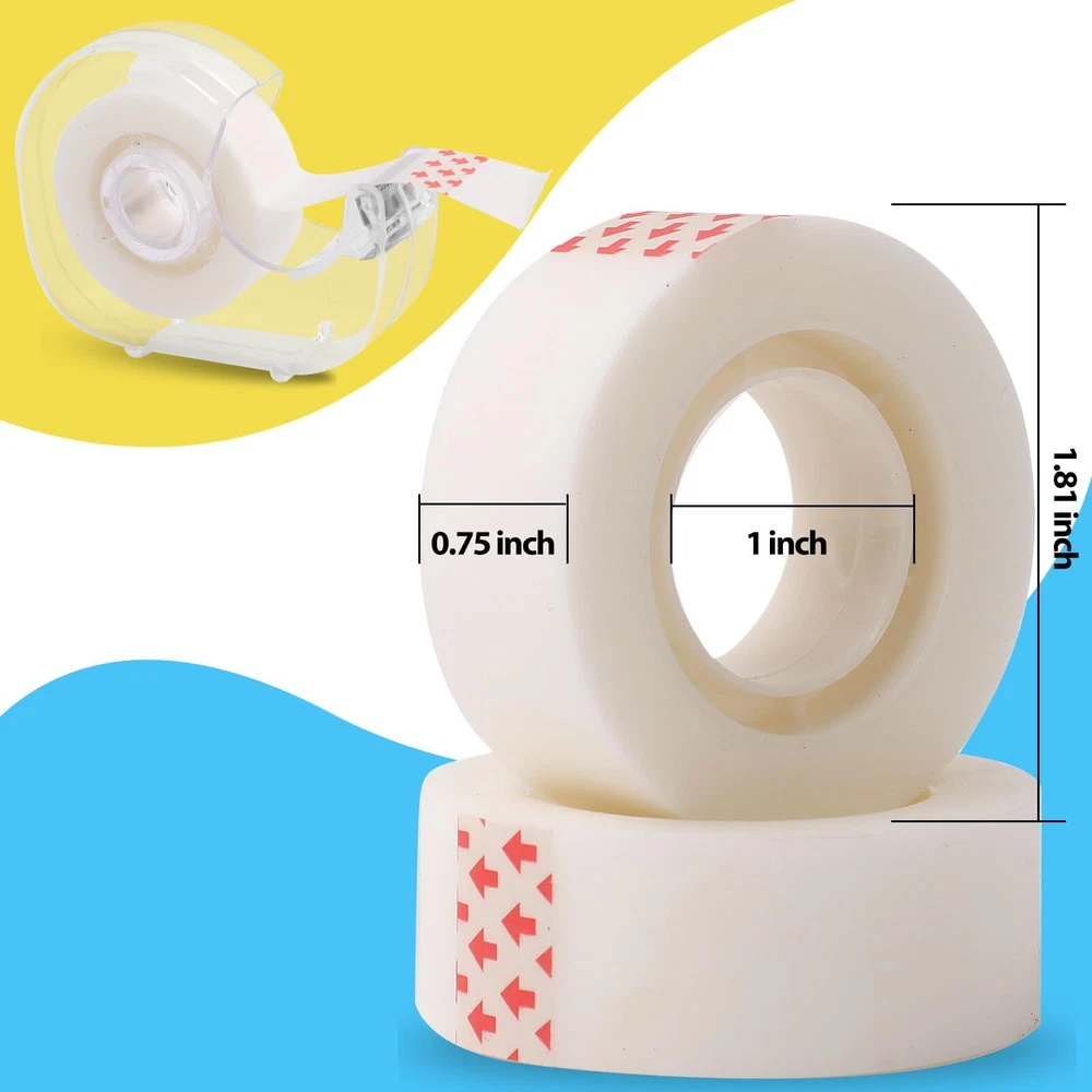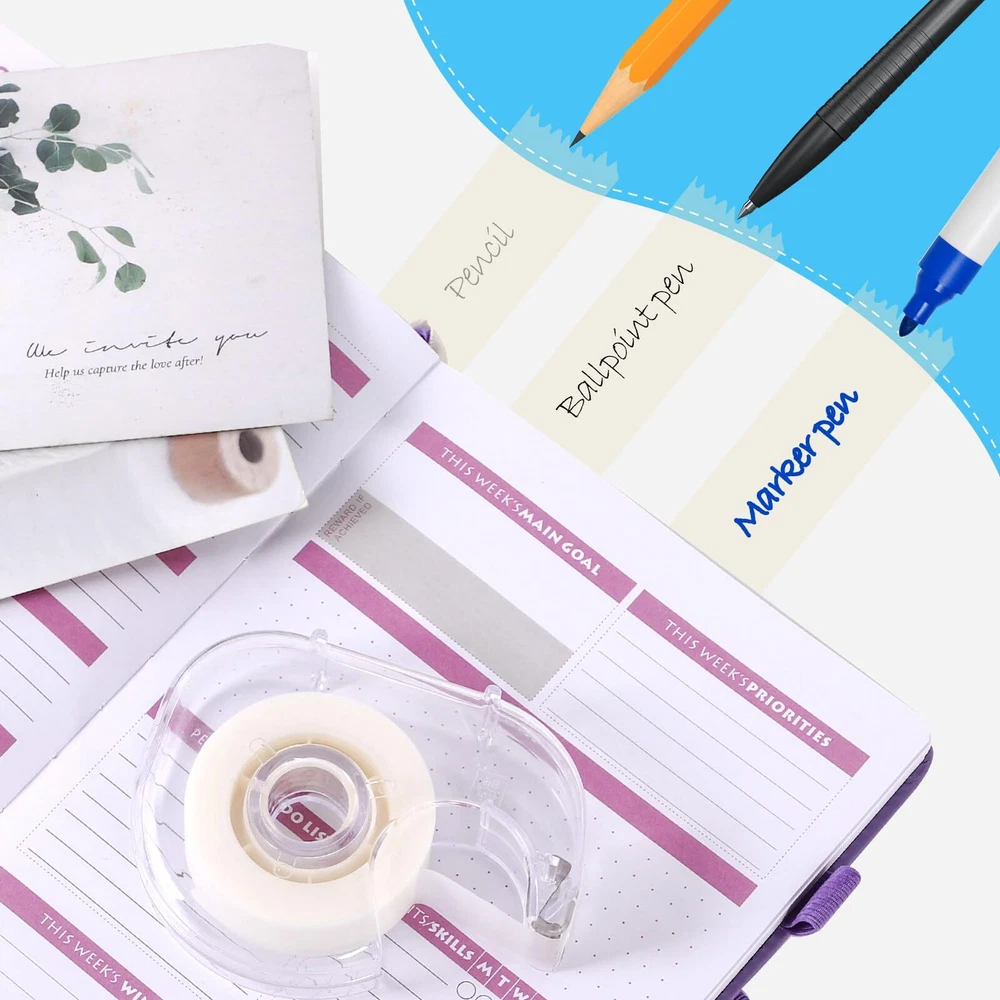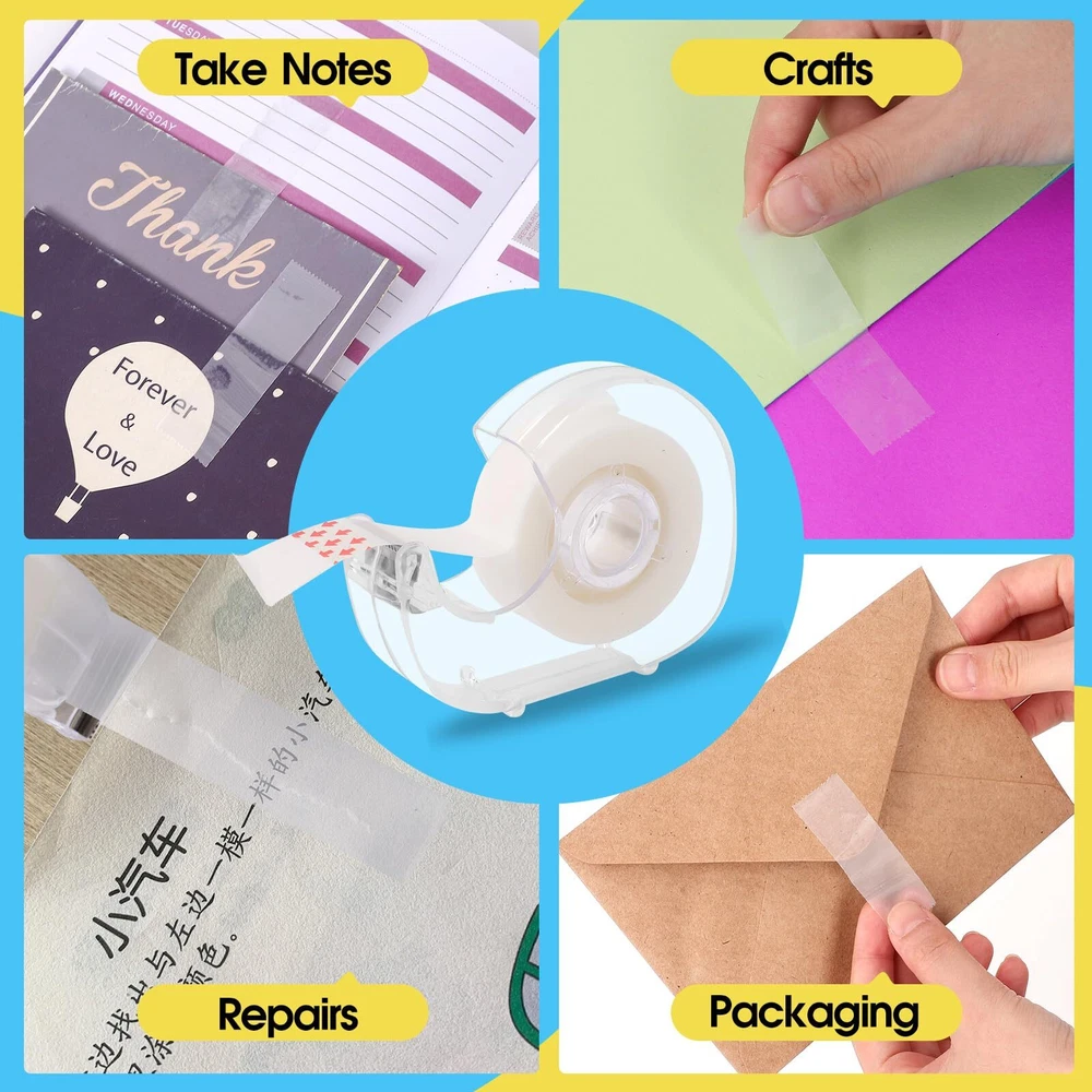 [Invisible Writing]: The invisible tape allows you to write on it without any interference from the tape itself. Whether you use a marker, ballpoint pen, or pencil, your handwriting is visible on the tape and won't get smudged [Unique Design]: This tape features a translucent design that seamlessly blends into any surface. Enjoy a clean, professional result for crafts and repairs with this versatile translucent invisible tape [Easy to Use]: It is ready to use right out of the box. This tape dispenser can cut the tape to your desired length, allowing for precise application and reducing waste. Quality cutting blade lasts for years [Versatile Applications]: From organizing workspace to creating personalized crafts, this tape is suitable for wrapping, marking important documents, decorating scrapbooks, and adding a unique touch to art projects [Package Contain]: 7 rolls of quality invisible tape allow you to enjoy unlimited creativity and practicality. With this set, you can use your ingenuity to conquer any project