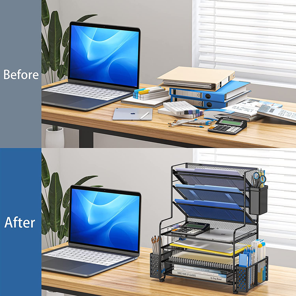 Store New Arrivals Add to Favorite View Feedback Contact 7 Tier Desk File Organizer, Letter Tray Paper Organizer with Pen Holder and Metal Hanging Basket, Black Description Item model number ST57816 Included Components Plastic Drawer organizer Rack, Assembly Manual Style 7 Tier Black Is Customizable No Assembly Required Yes Shelf Type Tiered Shelf Color 7 Tier Black Special Feature Sturdy Product Dimensions 8.75"D x 16.75"W x 16.75"H Material Metal Paper Item Weight 1 pounds Number of Shelves 7 Mounting Type Wall Mount Recommended Uses For Product Letter, Paper, Document Finish Type Metal 【Multifunctional】 The desktop organizer has 2 storage boxes and 1 pen box, you can store many office supplies, such as pens, scissors, staplers, etc. Perfect for office, bookcase, home, etc 【Quality Material】 The Office Supplies Desktop Organizer is made of lightweight and durable metal mesh and reinforced with a sturdy steel frame for lasting strength and reliable performance. 【Large Capacity Organizer]】The 7-layer layered design and large capacity make the paper organizer ideal for managing a wide variety of letter-sized letters, papers, books, bills, and more. Makes it super easy for you to quickly identify the contents of each compartment! 【Save Space]】Desktop Organizer can help you organize your desktop and help you save space better. Keep you productive at work all the time. 【Size】16.75 "W x 8.75 "D x 16.75 "H (U.S. Patent Pending) Product description Simple Trending 7-Trays Mesh Desktop File Organizer , Black Is your desk cluttered and difficult to focus on the task at hand? This desktop file organizer is perfect for holding Letter/A4 size paper, folders, binders, stationery and notebooks to reduce clutter in your office, home or school. Separate your files and papers into 3 angled trays at the top and 4 flat trays at the bottom, 2 removable hanging baskets and 1 pen holder and use it separately. Specifications: 7-Trays Mesh File Organizer Material: Metal Size: 16.75 "W x 8.75 "D x 16.75 "H Color: Black Package Contents: 1 x Desktop File Organizer 1 x torage pen holder 2 x Storage hanging basket 1 x Assembly Manual This desktop file organiser is suitable for a wide range of applications and can be used in the office, at home and at school . Office Home School Multifunctional Desktop File Organizer A sophisticated multifunctional desk organizer to meet your different storage needs. Organize documents, letters, pens and accessories as needed. ABOUT US We offer the best prices around on high quality products. Our E-store includes media such as books, movies, music and games while offering electronics, toys, sporting apparel, clothing, tools, general home, garden items and more. SHIPPING We are always working hard to ensure your package arrives as soon as possible. Please understand that some factors like weather, high postal traffic, and the performance of shipping companies are outside of our control. We offer free shipping to the lower 48 states and ship within 2 business days of payment, usually sooner. We do not accept P.O. Boxes. Please provide a physical address. RETURNS We offer a 30-Day Return Policy on items which you are not completely satisfied with. You have the option for a full-refund or an exchange of the item. No returns are available on items shipped outside of the USA. PAYMENT We accept PayPal. CONTACT US This page content is yet to come Please ad us to your favorite seller and visit again later Thank You CUSTOMER SATISFACTION We try our very best to make sure every customer is completely satisfied. If there's a problem, message us! We're happy to help.