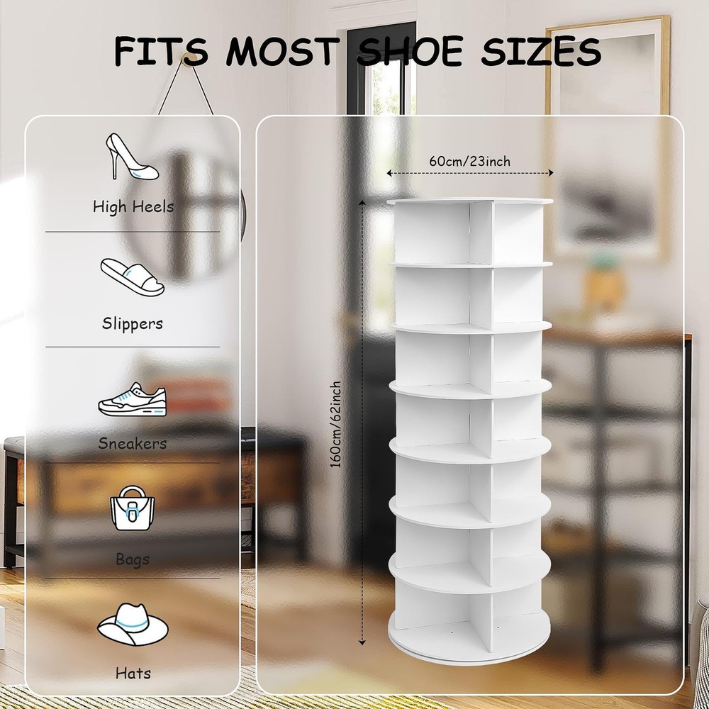 Store category Sign Up Now ! You may also like Product Description Bullet Points: Space-Saving Design: Enhance your shoe storage with this tall tower, maximizing space in any room; keep your shoes organized and easily accessible, freeing up cluttered areas Stable and High Capacity: Crafted from solid board, this sturdy construction ensures durability while neatly organizing shoes, handbags, hats, and other accessories Effortless Assembly: Freestanding rotating shoe display rack tower won't take up too much of your time as you effortlessly assembly and enjoy a neat space Improves Home Organization: Allows for efficient storage of shoes, heels, and sneakers with 7-tier versatility; neatly organizes common items like CDs, books, photo albums, and plants Eecellent Home Decor: Enhance your shoe organization with 360 rotating shoe rack tower, maximizing storage and adding a stylish touch to your home decor Maximize your space with our Space-Saving Shoe Tower! Made of solid board, it's easy to install and great for storing items like CDs, books, plants, and more. This stylish and practical solution organizes and adds flair to any room effortlessly. Specification: Product name: Rotating Shoe Rack Material: PVC board Style: Modern minimalist Color: White Layers: 7 Layers Purpose: Storage Layer height: 21.5cm/8.5in Product size: about 159.5x60x60cm/62.8x23.62x23.62 inches Packing list: Neutral boards x14 Layer boards x6 Fixed board x1 Turn board x1 Notes: 1. Due to different lighting and screen settings, the item color may be slightly different from the picture. 2. Due to different manual measurements, please allow a 1-2cm difference in size. Payment Delivery details Terms of sales About us Feedback & DSRs Payment Before you palce an order, please kindly make sure that you have a paypal account. We accept PAYPAL payment only. Payment should be completed within 2 days after auction closed, or unpaid dispute will be filed for an closing auction. An unpaid case will be filled after 4 days. Delivery details We ship to your eBay address. Each package will be shipped to US by UPS Regular Parcel with tracking number. Please check your shipping address carefully before checkout, it can't be changed if order completed. All items will be shipped within 1-2 business day upon receipt of payment.Orders placed on weekend will be shipped within 3 days. If you do not receive your item in 7-10 business days.please contact us immediately for further assistance. We will be responsible for any damages or losses incurred in the shipping process. About us We maintain high standards of excellence FIVE STAR and strive for 100% customer satisfaction! Positive Feedback is very important to us. We hope that you contact us immediately Before you give us neutral or negative feedback, so that we can satisfactorily address your concerns. We promise to offer the lowest price and high quality produce. Our working time: From Monday to Friday(9:30 am to 18:00pm), we don't working on holidays ,hope you can understand and know that , thank you. Please always talk to us via ebay Message. We appreciate your business and look forward to growing our e-Bay sales with satisfied customers. Feedback Contact us If you have any questions, please feel free to contact with us by ebay Message during our business hours ( 9:30a.m. to 5:30 p.m.), or email us through eBay, we will try our best to help you to resolve it. For any presale or after-sale questions,please do feel free to email us! Due to the time difference, each email will be replied within 1 working day,and weekend will be delayed a bit. Feedback