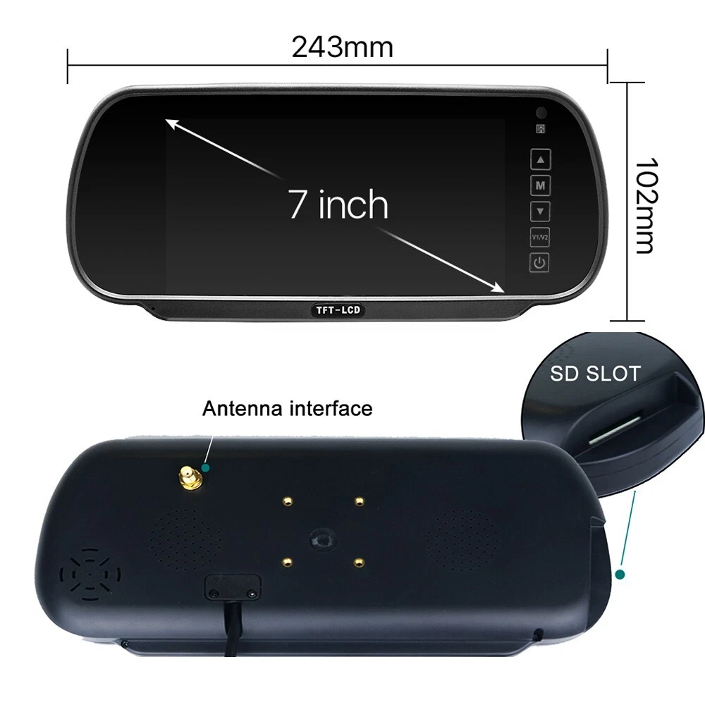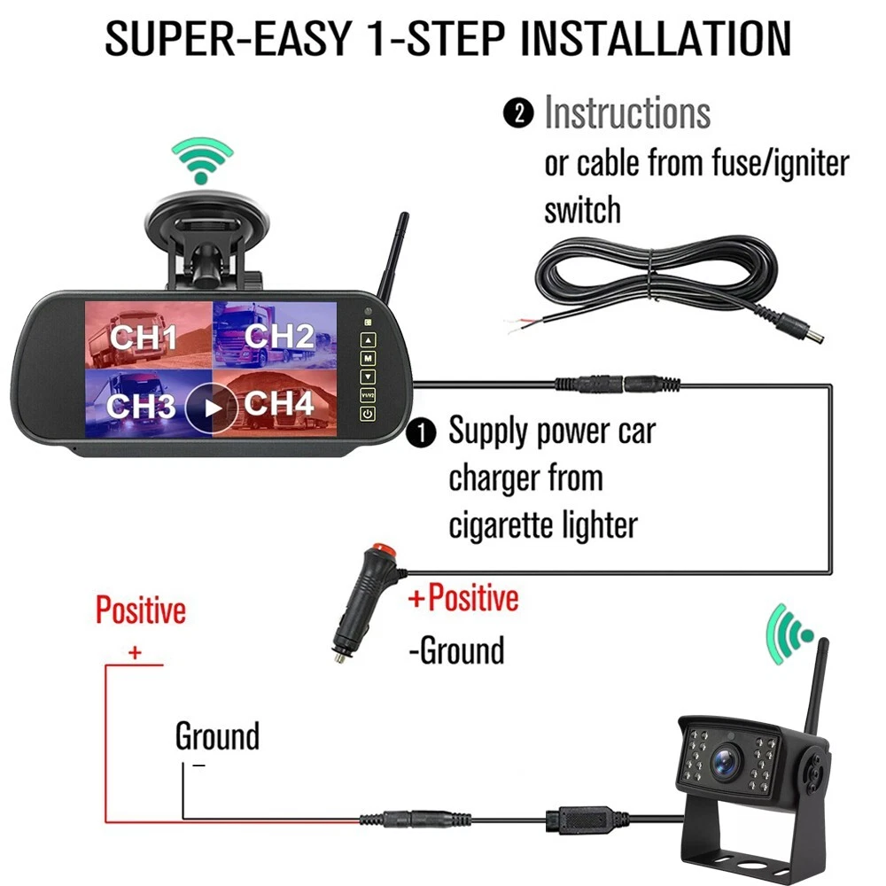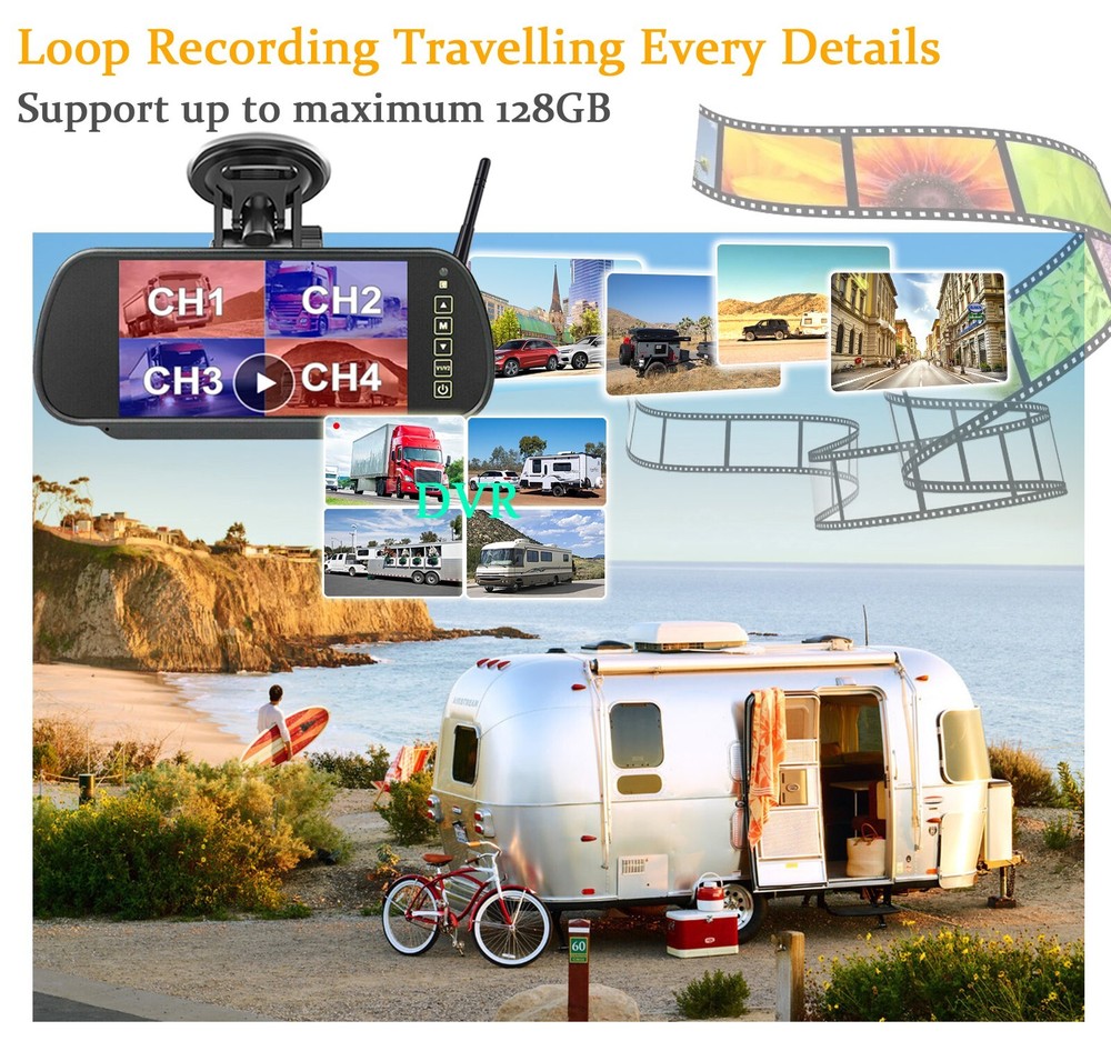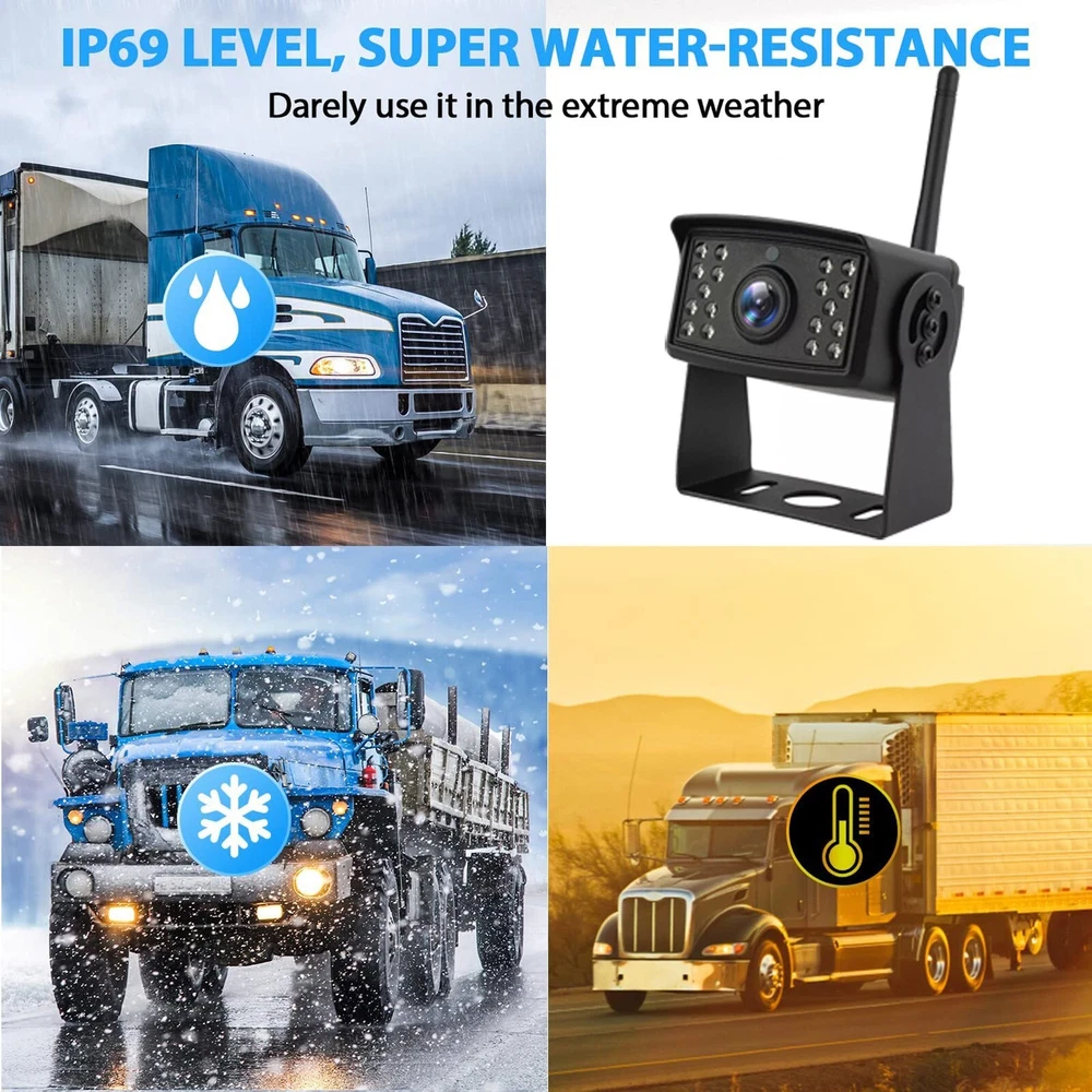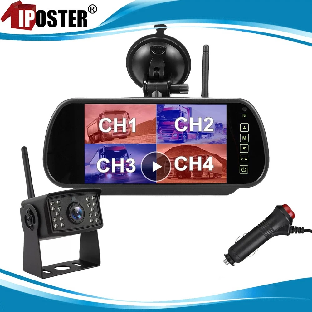 iPoster 7" Digital Wireless DVR Monitor with BSD AI Detection System + 18 IR Leds IP69 Metal Shell 1080P FHD Digital Wireless Camera Designed for high speed RVs ,Trailers , Box Trucks ,Semi Trucks,Motorhome,5th Wheels etc. Easy DIY Installation in 15 minuts to your vehicle by yourself, Save $200 dollar installation fees . This system can be easily intalled on vehicle or took down from vehicle . 50m signal coverage is completely sufficient for most of vehicles. Digital wireless signal is more stable strong penetrant than analog signal. Guideline can be turned on/off on monitor . Image can be set to mirror mode or flipped. This monitor provides different slpit modes, can display 1 channel's image in full screen, or 2ch /3 ch/4 ch simultaneously. You can add extra cameras to this system, this monitor can connect maximum 4 cameras at one time. The monitor supports 32G 64G 128G SD Cards. This itme inluceds 1 default U style Bracket for monior, but you can buy extra windscreen suction bracket from this store. 7" Monitor Specification: The product met FCC/CE/RoHS/UL/IP6X standard with Dual Antenna Design to enhance wireless signal, make its working range 50-10m-effective Effective Pixels:1280(H)*1024(V)Pixels/NTSC Screen Size: 7 inch Display Component: Color TFT LCD Screen ratio 16:9 adjustable Housing Material: ABS Video Frequency: PAL/NTSC Power: DC 9V-35V Rear view Camera Specification: The product itself 100% safety and met any FCC/CE/RoHS/UL/IP69K standard Resolution: 1080P Lens Viewing Angle: 150 Degrees Waterproof IP Rate: IP69K Power: DC12V-24V Package Included: 1 x 7 Inch DVR Monitor 1 x Back up Camera 2 x Antennas 2 x Power Cable 1 x Windscreen Suction 1 x Remote 1 x Charger Adapter with on/off 1 x User Manual