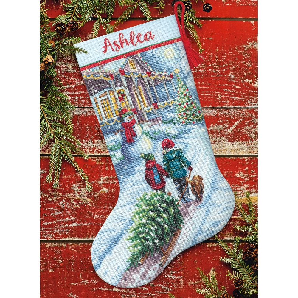 A delicious cup of hot cocoa awaits this young tree-transport team in this darling Christmas counted cross stitch pattern. This holiday scene in counted cross stitch is sure to warm the heart and makes a wonderful Christmas keepsake. Finished size: 16" long. Copyright Simon Treadwell, courtesy of Advocate Art Inc. Counted cross stitch set contains presorted thread, 14 count lt. blue Aida, felt for stocking back, needle 100% wool yarn for hanger, needle, and instructions with an alphabet for personalizing. counted cross stitch kit for adults comes with presorted thread, wool yarn for stocking hanger, 14 count lt. blue Aida, felt, needle and instructions with an alphabet for customizing. Finished cross stitch Christmas stocking measures 16 L. Inspired by classic holiday traditions, this counted cross stitch Christmas stocking kit will warm your heart just like a hot cup of cocoa. A fun and festive Christmas craft, you can add custom names, dates, and more to this stocking cross stitch pattern for an instant family keepsake. Stitch this stocking and fill it with presents and treats for a fun Christmas gift.