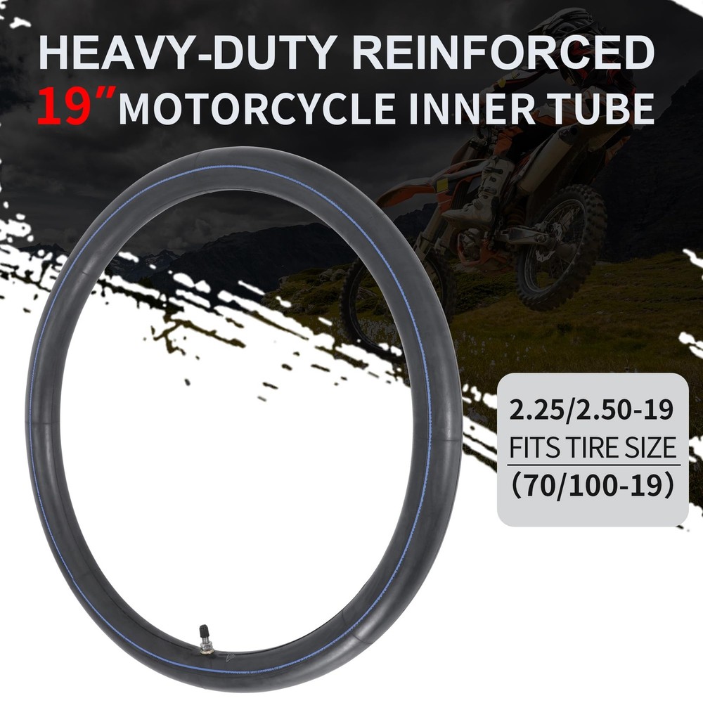 70/100-19 2.25/2.50-19 Dirt Bike Inner Tube,Heavy Duty 2 mm Reinforced Thickness Dirtbike Tubes 19 Inch with Rim Strip Copper Dust Caps for Surron Light Bee Talaria Sting PUNCTURE RESISTANT:super heavy duty 2mm thick inner tube is built to withstand the rigors of motocross and enduro use.Made from puncture proof butyl rubber, this dirt bike inner tube can better handle rough terrain as well as provide increased performance and durability. WIDE COMPATIBILITY:Our reinforced 2.25/2.50-19 inch inner tube fits 2.25-19,2.50-19,70/100-19 tires.19 inch inner tube is a perfect fit for Surron light bee Talaria dirt bikes. PROFESSIONAL : Set includes a dirtbike rim strip made from high-quality rubber material that can effectively protect the inner tube from spoke end punctures. HIGHER PERFOMANCE:High butyl content rubber provides better air retenion to prevent air leakage and offers better shock and vibration absorption performance for a smoother ride. PACKAGE INCLUDES:1×2.25/2.50-19 inner tube with TR4 valve stem,1 x plastic dust cap, 1×rim strip,1×spare copper dust cap.Please feel free to us with any questions.