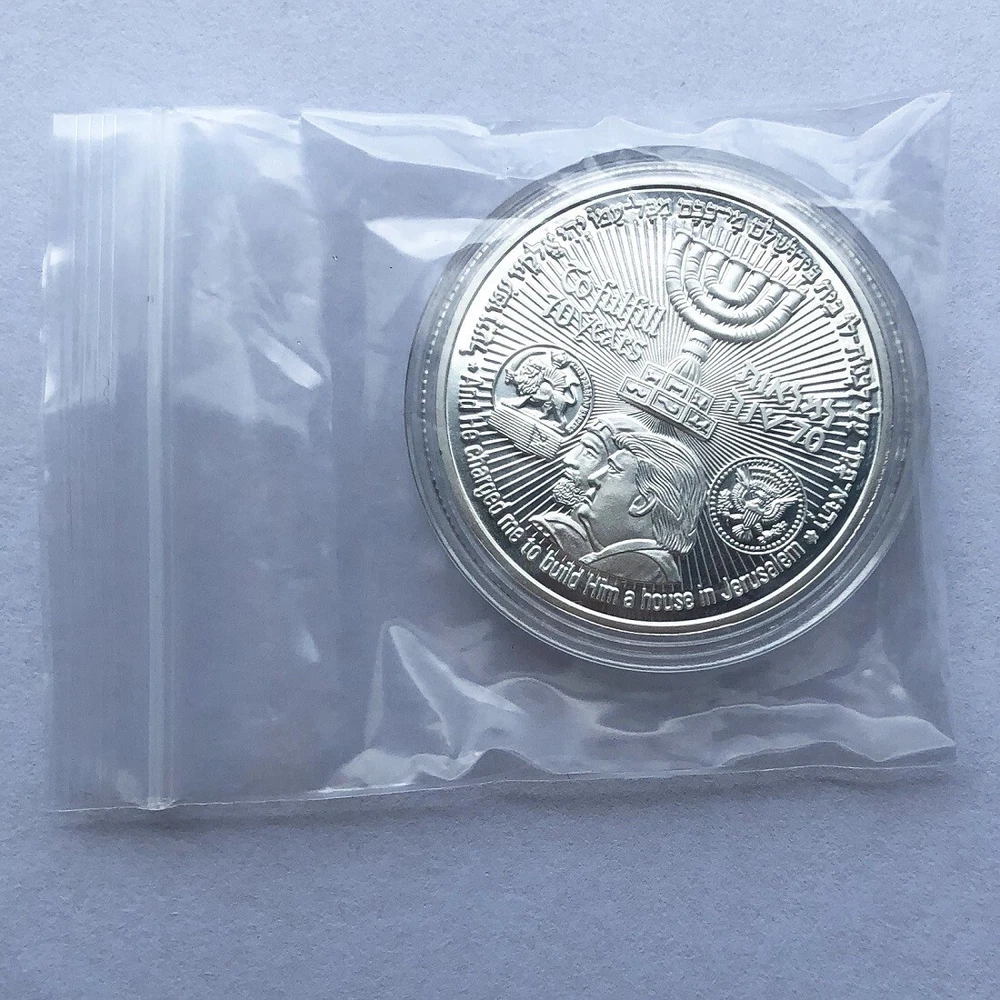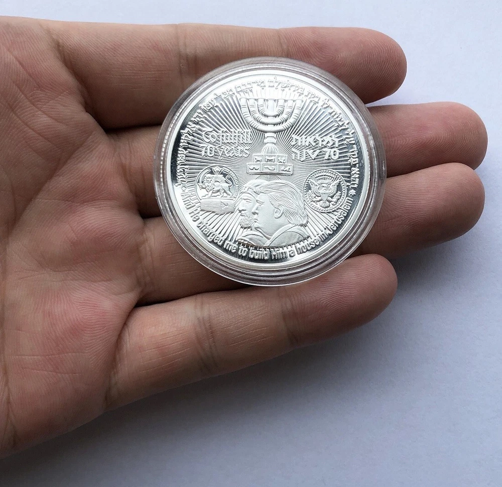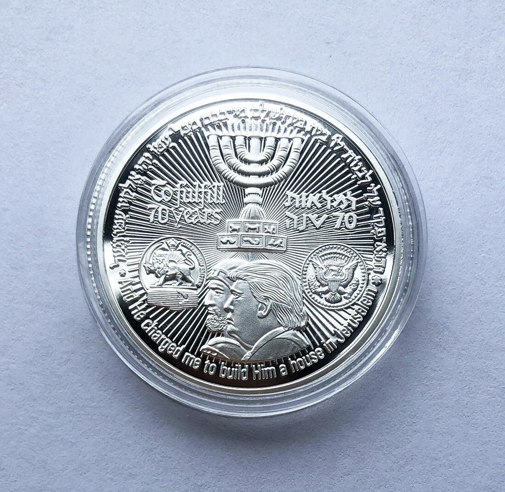 70th Anniversary Jerusalem Commemorative Coin Donald Trump Israel Capital Jewish Temple Silver plated Coins Hebrew Collectable Challenge Coin Novelty Coin Size approx.: 40mm*3mm Material: Metal with 24KT Silver Color Plated Weight: around 40g Special and beautiful plated Silver with King Sirus and President Trump. Package: 2 piece coins packed with premium capsule and opp bag