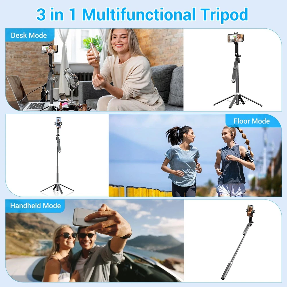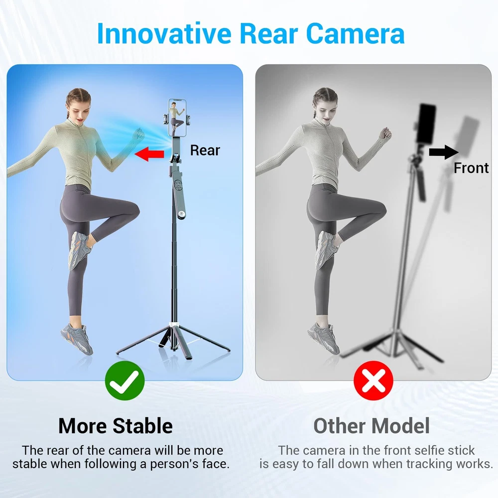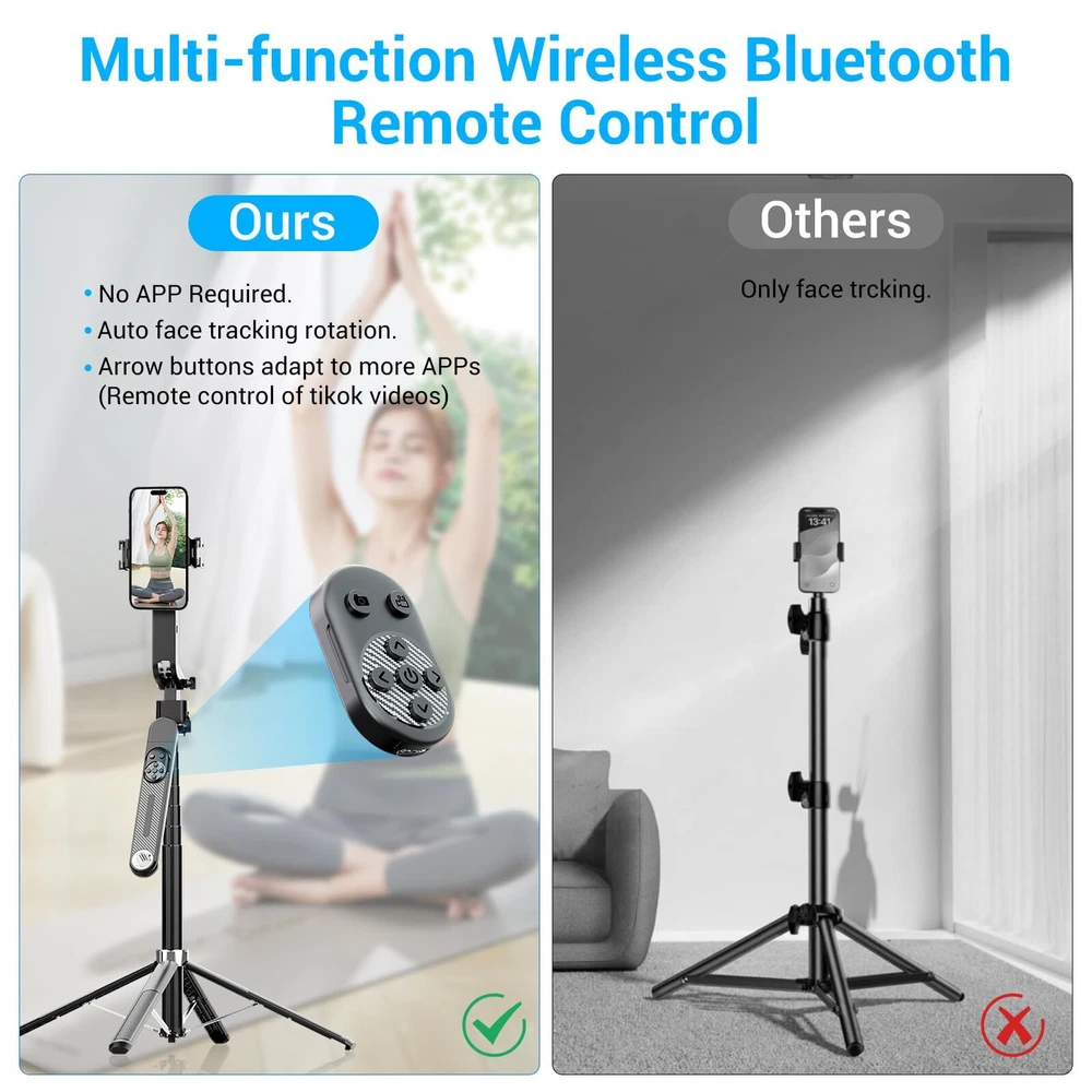 Telescopic pole: aluminum alloy Telescopic length: 35cm/13in; Extended length: 180cm/71in Weight: 520g Control type: AI intelligent recognition following, Bluetooth remote control Product Features:1:AI intelligent cloud eye deep core , sensitive, AI gesture control , OK open , palm pause , than yea only a person mode. 2:PTZ can be rotated 360 °, stable shooting handle can be based on the weight of the and the vertical balance of the counterweight lever state. 3:Equipped with 1/4 nut extension heated boot extension interface, can connect microphone, sports , square detachable rotating fill light. 4:Optional Bluetooth remote control, can take pictures and record remotely, product/remote control TYPE-C charging. 5:Optional square detachable rotating fill light. 6:The bottom bracket can be popped open with key, save your heart and don't pinch your hand. 【360°Auto Face Tracking】:The auto face tracking has a built-in AI with a real-time artificial intelligence computing system, no need to install any APP can automatically recognize and track your face or body, freeing your hands for video recording or live streaming.A must-have for content creators; built-in rechargeable battery that lasts up to 20-48 hours 【Creative Shooting Center of Gravity】: This selfie stick adopts an innovative rotatable bracket design and rear tracking , solving the shortcomings of the previous ordinary shooting center in the front, placing unstable and easy to collapse. Rotatable bracket can do 360 ° all-round rotation of the without dead angle, rear tracking with a steady shooting handle can ensure the vertical balance of the device, the use of more stable 【3-in-1 Tripod & Selfie Stick & Stand】:This AI tracking tripod comes with a foldable telescopic function, which can be used either on the ground or on a tabletop, or as a selfie stick and handheld stabilizer. It measures 12 inches in length when retracted and 71 inches when fully extended.8 sections of aluminum alloy material telescopic tube, to meet your multiple needs 【Gesture Control】:This mobile tripod uses advanced gesture recognition algorithms,supports gesture control, when facing the , OK gesture means start, palm gesture means pause.This Auto face tracking tripod is equipped with a Bluetooth remote control, which can be controlled from a distance, adding up, down, left and right buttons, which can be adapted to a number of software such as Tiktok and other software, so that you can turn the page at will, making it more convenient to use 【Innovative Quadripod Stand Design】:The auto face tracking has extended tripod legs and umbrella skeleton construction with improved four-point bracing, metal ribs, and aluminum telescopic rods.Innovative thickened design ensures excellent stability even during video shooting and face tracking 【Standard 1/4inch Interface】: This Auto face tracking tripod has standard 1/4 inch threads on the top to mount .The iPhone tripod can rotate vertically up to 270°and horizontally up to 360°, supporting both portrait and landscape modes.The stabilizer grip supports 90° adjustment to meet your various shooting needs.Supports mounting of ring lights, sports cameras and cell mounts.