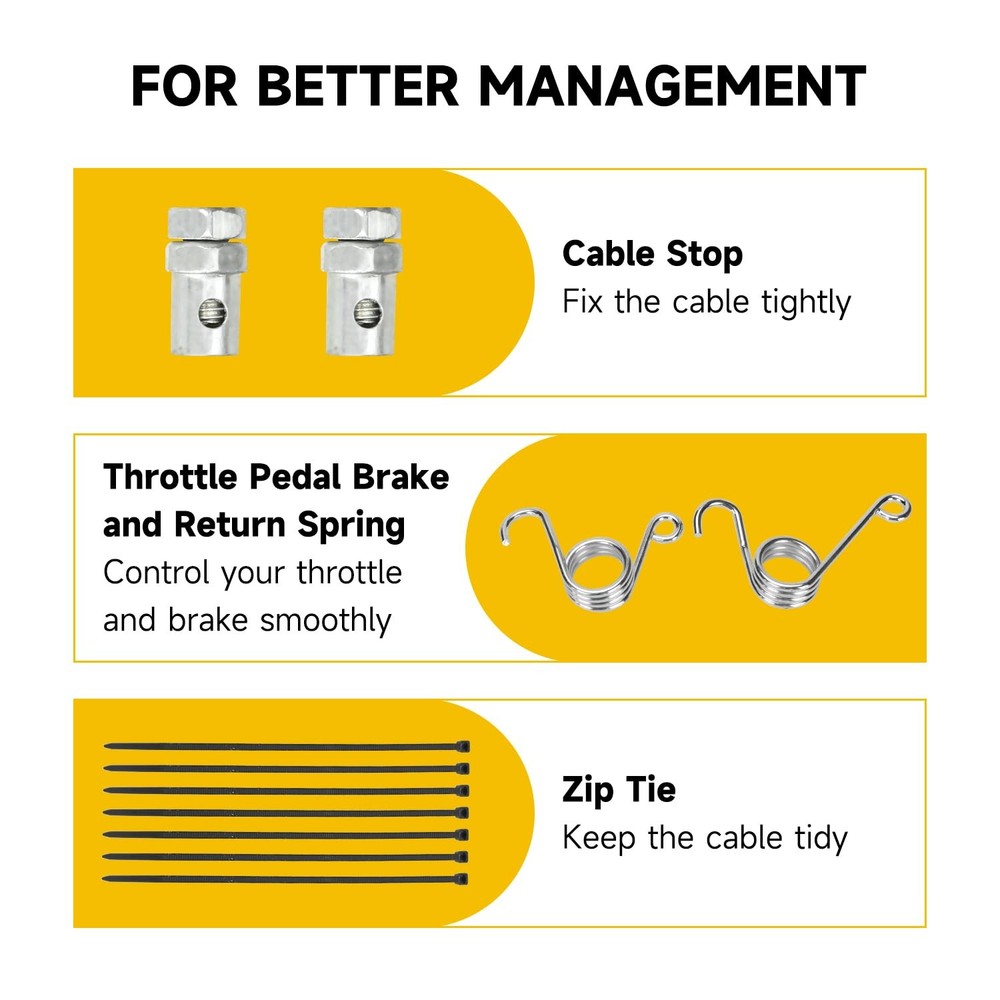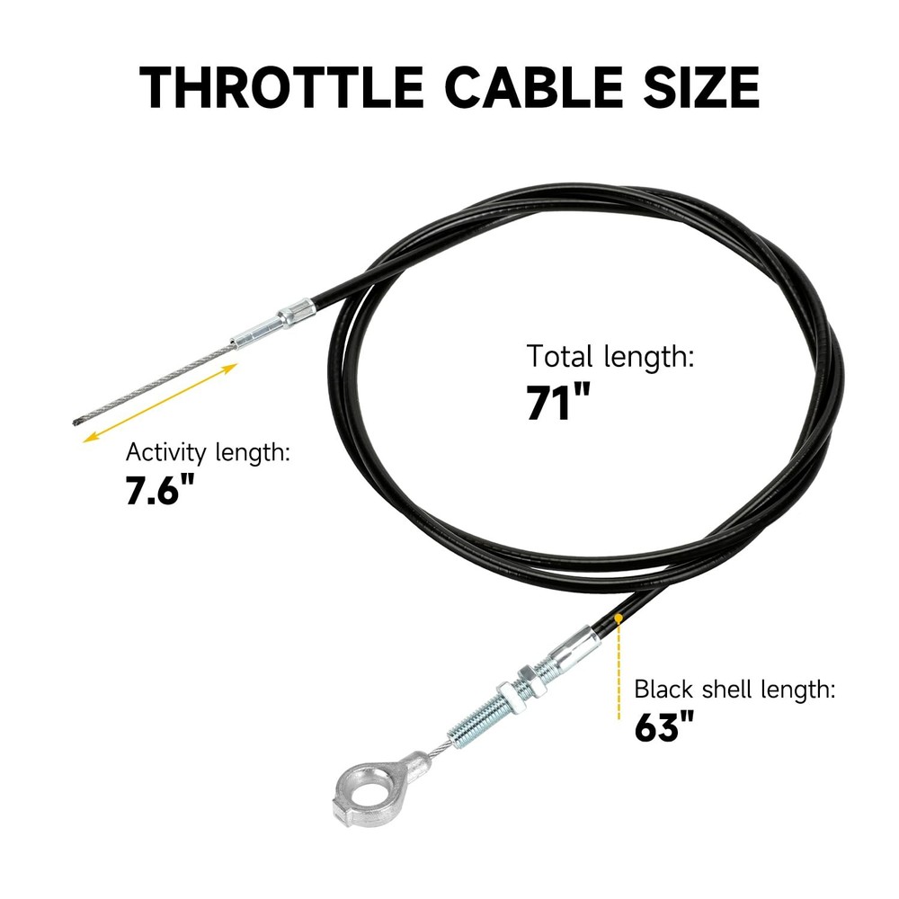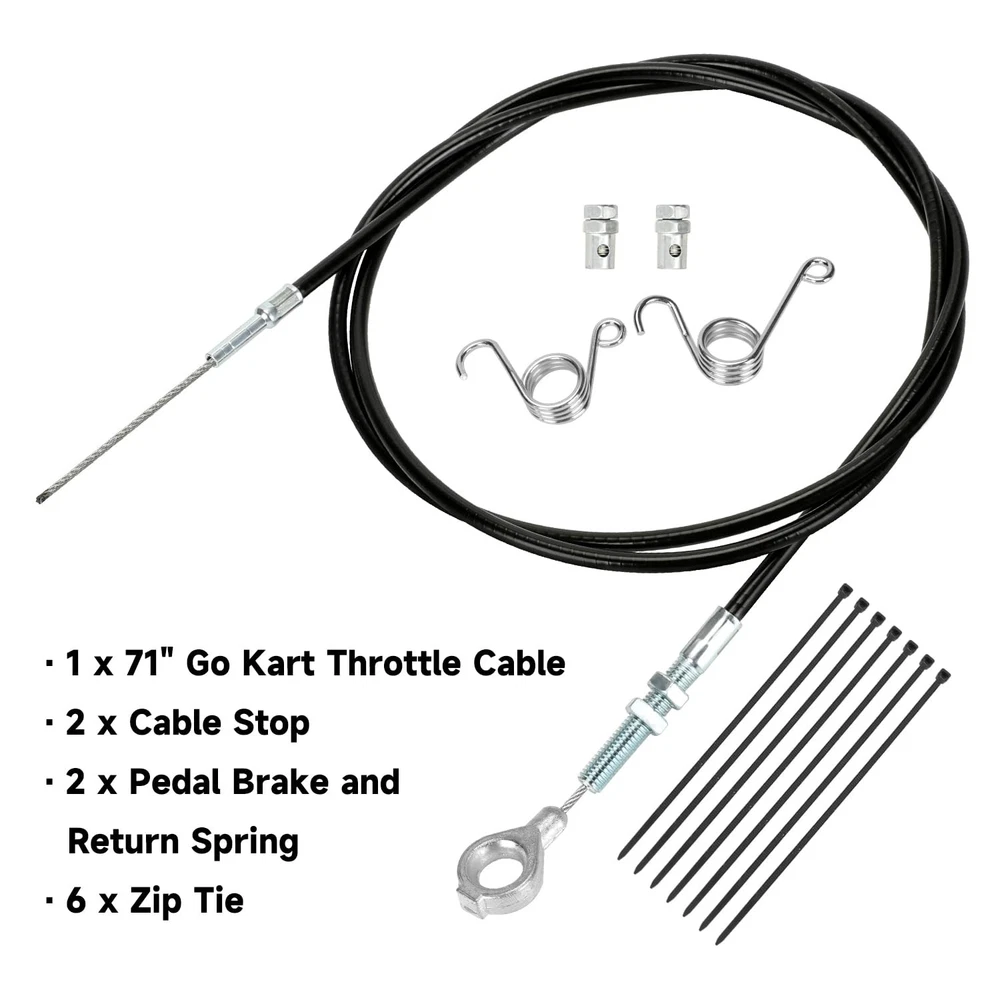 Product Name: 71 inch Throttle cable for go kart Material: Alloy steel and rubber Cable Length: 71” Casting Length: 63” Part Number: 8252-1390 Feature: Strong and Durable Fitment: For predator 212cc 196cc 125cc GX160 GX200 5.5hp 6.5hp engine Manco 4xx Manco fox2 Manco Dingo Yerf dog Murray and Kandi Go Kart Cart Mini Bike Buddy Scooter Package Including:1*71” go kart throttle cable, 2*cable stop, 2*throttle pedal brake and return spring, 6*zip ties; Fitment: 71”throttle cable with 63”casting length is suitable for predator 212cc 196cc 224cc GX160 GX200 5.5hp 6.5hp engine Manco 4xx Manco fox2 Manco Dingo Yerf dog Murray and Kandi American Sportworks Go Kart Cart Mini Bike Buddy Scooter; Part Number: Replaces 8252-1390 throttle cable; Strong and Durable: Made of high quality PVC protective shell with stainless steel core and heavy duty eyelet, our throttle cable will protect the inner from wearing down effectively and lasts for several racing seasons; Function: Go kart throttle cable connects to the gas pedal and the engine’s throttle plate as a link. When the gas pedal is pressed, the cable is pulled and the throttle starts; In addition, control your throttle and brake smoothly with our brake and return spring; Package Including:1*71” go kart throttle cable, 2*cable stops, 2*throttle pedal brake and return springs, 6*zip ties;