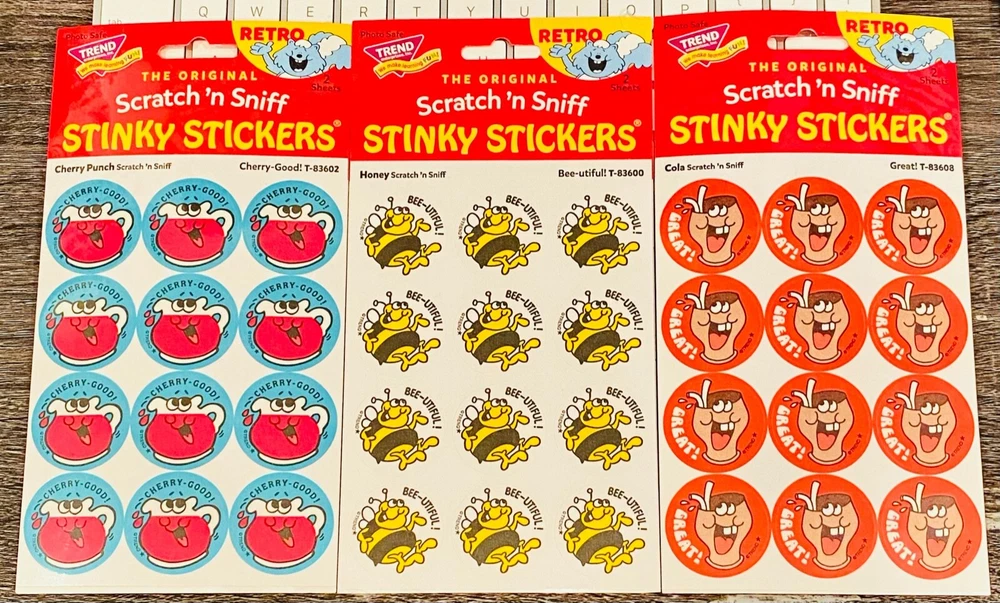 3 Factory Sealed Packs of TREND Scratch n Sniff Stickers from the Special Edition RETRO Collection ~ Stinky Stickers! Includes... Honey - 24 Stickers + Cola - 24 Stickers + Cherry Punch - 24 Stickers