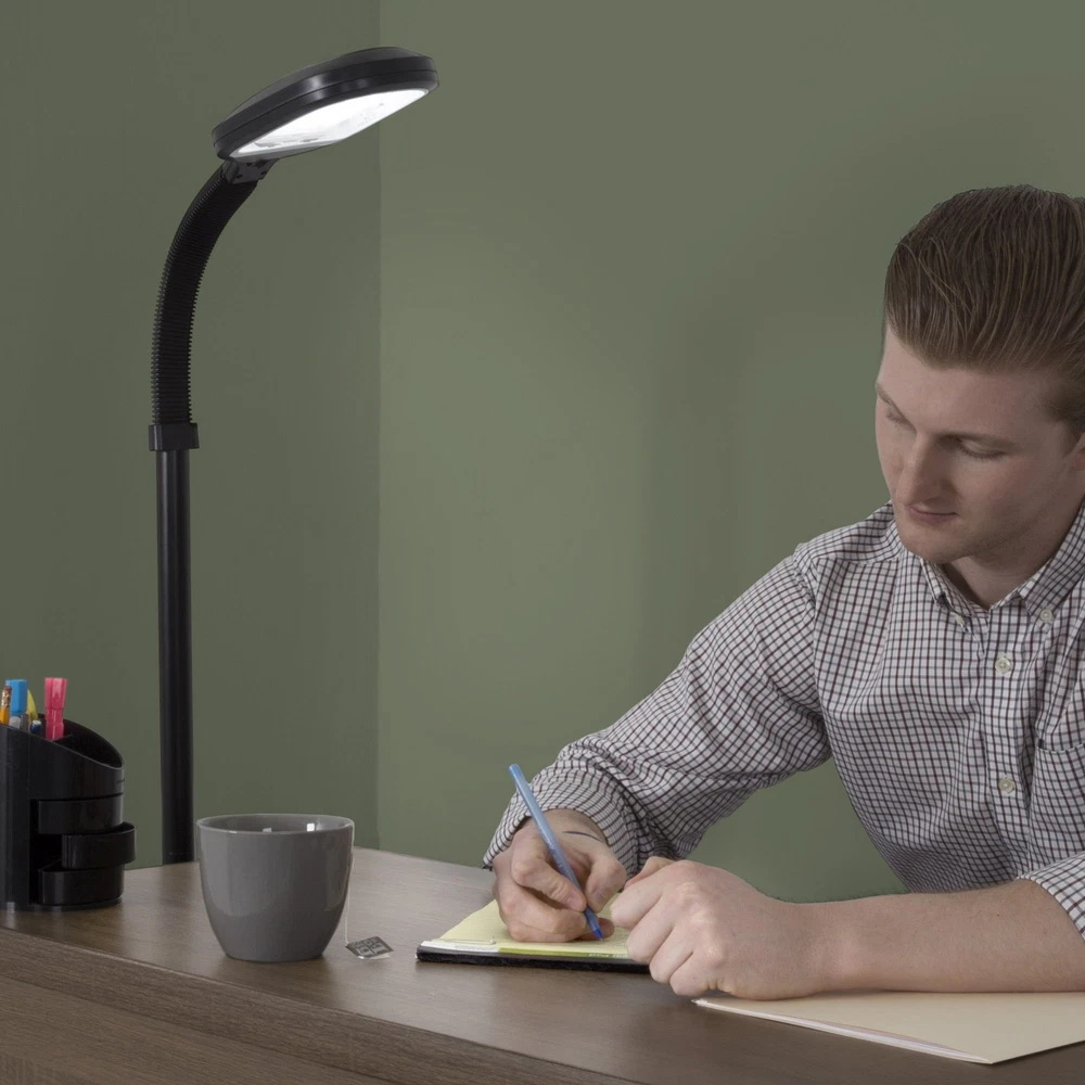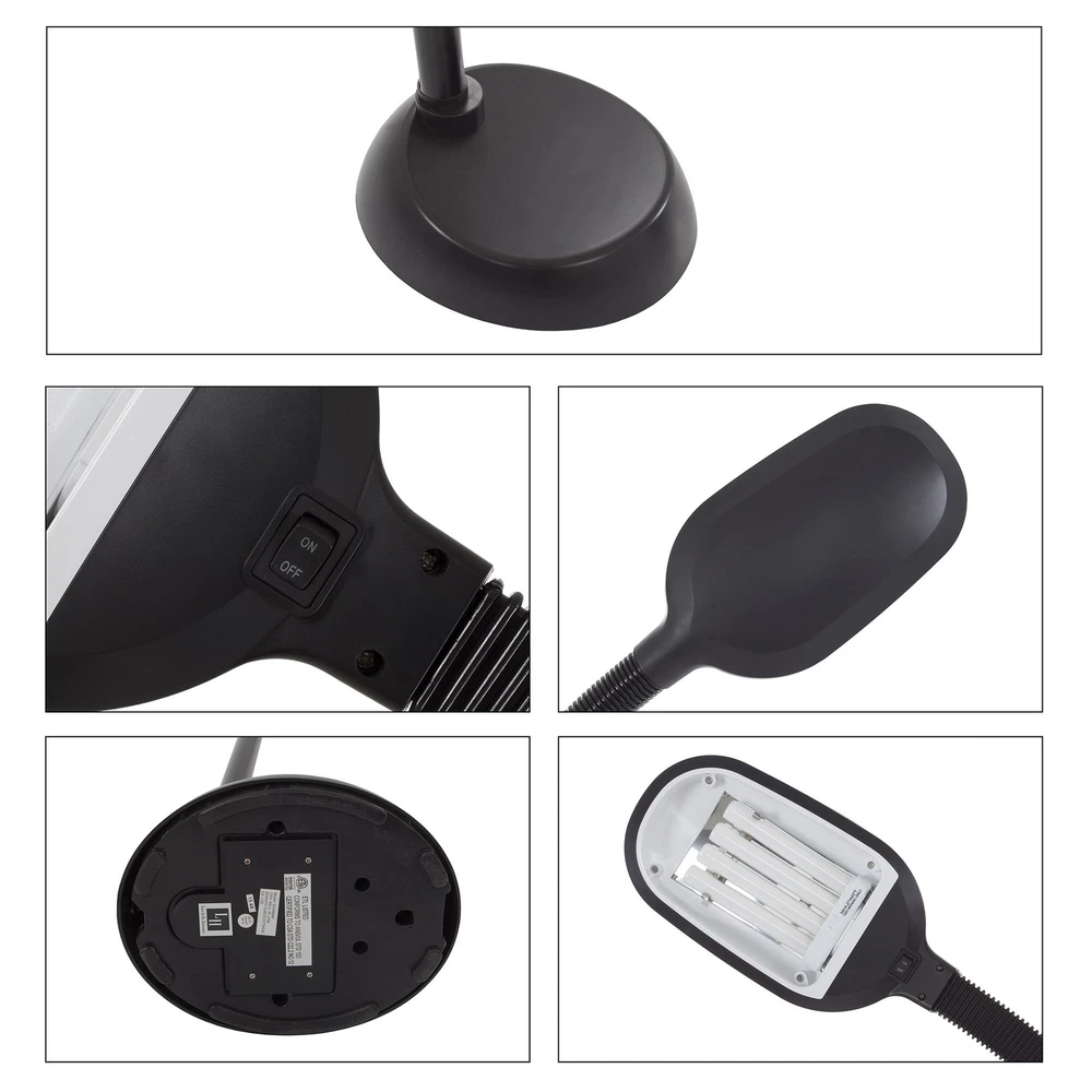 brings you form and function with the Natural Full Spectrum Sunlight Therapy Reading Floor Lamp that produces pure bright white illumination making colors appear more vibrant while reducing eye strain and fatigue. The supplied 27-Watt CFL Bulb gives as much light as an ordinary 150-Watt bulb, but uses far less energy. This bulb can last up to 5,000 hours, 5x longer than other bulbs. The flexible gooseneck design lets you adjust the lamp to any angle to direct light where you need it. Perfect for reading, working, or doing intricate craftwork. A must-have addition to your home or office, this lamp provides natural full spectrum daylight hues, brightening even rooms that have minimal sun exposure. IMPORTANT:Avoid buying counterfeit products and transacting with unauthorized sellers. Look for our logo on the packaging for every of our products. is committed to providing the consumer with the absolute best price and value on all our products, which we ensure by applying a rigorous Quality Control process. is a registered trademark protected by U.S. Trademark law and will be vigorously defended. MODERN FLOOR LAMP - This stylish standing lamp has a modern black finish with a matching 64-inch-long cord for versatile placement. The adjustable light has a simple rocker style on/off switch on the lamp head that is easy to use. IMITATES NATURAL LIGHT - Equipped with a PL-27W bulb with a 6400K color temperature, this lamp for living room projects bright natural light, helping to eliminate eye and fatigue, making it the perfect addition to your dorm room or office décor. ENERGY-SAVING - The included energy-saving replaceable bulb gives off about as much light as an ordinary 150W incandescent bulb while using less energy. The natural office lamp can also last up to 5,000 hours, so it won't have to be replaced as often. MULTI-DIRECTIONAL - The gooseneck arm on the bedroom lamp provides flexible height adjustment from 61.2-inches to 73.5-inches-tall when completely straight with unlimited angle choices, so it is simple to focus the light where you need it. PRODUCT DETAILS - Materials: Plastic and Metal. Dimensions: Straight Neck: (L) 10.2” x (W) 8.7” x (H) 73.5”; Angled at 90-Degrees: (H) 61.2”; Cord Length: 64”. Voltage: 120V. Sun Lamp Comes with PL-27W Bulb. Color: Black.