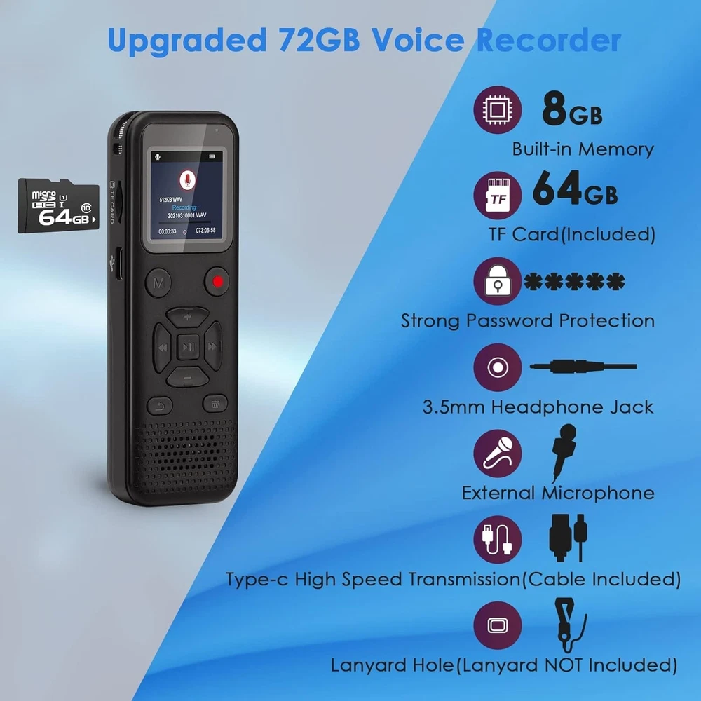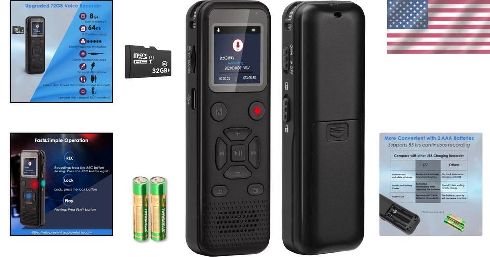 72GB Premium Sound Digital Tape Recorder with Password Protection - On-the-Go ‹ › ‹ › ‹ › ‹ › ‹ › ‹ › ‹ › ‹ › ‹ › 72GB Premium Sound Digital Tape Recorder with Password Protection - On-the-Go Convenience - Powered by 2*AAA Batteries - 72GB Large Capacity - 1536kbps Premium Quality Sound - Simple Tape Recorder with Password Protection - Easy Files Management via TYPE-C Cable Features: Powered by 2*AAA batteries for on-the-go convenience 72GB capacity (8GB built-in memory and removable 64GB TF card expansion) 1536kbps premium quality sound with high-sensitivity omnidirectional microphone 4-digit password protection for secure audio files Easy files management and transfer via TYPE-C cable Benefits: Convenient battery replacement with no downtime High storage capacity for all recording needs Crystal clear audio quality for precise recordings Secure password protection for confidential recordings Effortless files management and transfer Why choose our 72GB Premium Sound Digital Tape Recorder? Upgrade your recording experience with our 72GB Premium Sound Digital Tape Recorder. With convenient 2*AAA battery power, you can replace batteries on-the-go and enjoy uninterrupted recording. The high storage capacity, premium sound quality, and password protection ensure a seamless and secure recording process. Easily manage and transfer your files with the included TYPE-C cable for added convenience. Don't settle for ordinary recording devices - choose our advanced tape recorder for professional results and peace of mind. Order yours today! Shipping Free & Fast Shipping - We offer free shipping to most of the USA with a normal delivery time of 3-7 days. However, due to the current situation, additional delivery time (up to 3 weeks) may be required for some items. Alternative Carriers - We may use alternative carriers (e.g. USPS, FedEx, UPS, etc.) to ensure your package arrives safely and on time. Due to the use of multiple carriers, we are unable to provide a tracking number automatically. Handling Time - Orders are processed and shipped within 1-2 business days of receiving cleared payment. Shipping Restrictions - Shipping to Alaska, Hawaii, Puerto Rico, Guam, and other US territories may incur shipping charges or delivery restrictions. Please contact us before ordering, or your order can be refunded/cancelled. State Restrictions - There may be restrictions based on your state of purchase. For example, certain items may not be shipped to California due to state regulations. Contact for Tracking Updates - If you require tracking updates or have any concerns about the delivery of your order, please feel free to contact us, and we will be happy to assist you. Return 30-Day Hassle-Free Returns - We want you to be completely satisfied with your purchase. If you are not, you can return the item within 30 days of receiving it for a full refund or exchange. Easy Return Process - To start a return, simply contact us and we will provide you with a prepaid return shipping label and detailed instructions. Restocking Fee - There are no restocking fees for returns. However, the buyer is responsible for return shipping costs if the return is not due to a seller's error. Refund Processing Time - Refunds will be processed within 5 business days of receiving the returned item in its original condition. Payment We accept all major credit cards, PayPal, and Apple Pay for your convenience. Your payment information is secure and encrypted to ensure a safe and seamless transaction. Please complete your payment within 3 days of purchase to avoid any delays in shipping. Feedback Your feedback is extremely important to us. We strive to provide the best products and customer service possible. If you are satisfied with your purchase, please take a moment to leave us a positive review. If you have any concerns or issues with your order, please contact us before leaving negative feedback. We are committed to resolving any problems and ensuring your satisfaction. Contact Us If you have any questions or concerns, please feel free to reach out to our customer support team. You can contact us through the eBay messaging system. We are available Monday to Friday, 9:00 am to 5:00 pm EST, and we will do our best to respond to your inquiry within 24 hours. Thank you for supporting our small family business! MPN: Digital_Voice_Activated_Recorder Model: Digital Voice Activated Recorder Unit Quantity: 1 Recording Media: TF Card Connectivity: USB Brand: Unbranded Series: Digital Voice Activated Recorder Flash Memory: 72 GB Max. Recording Time: Unknown Size: Not Set