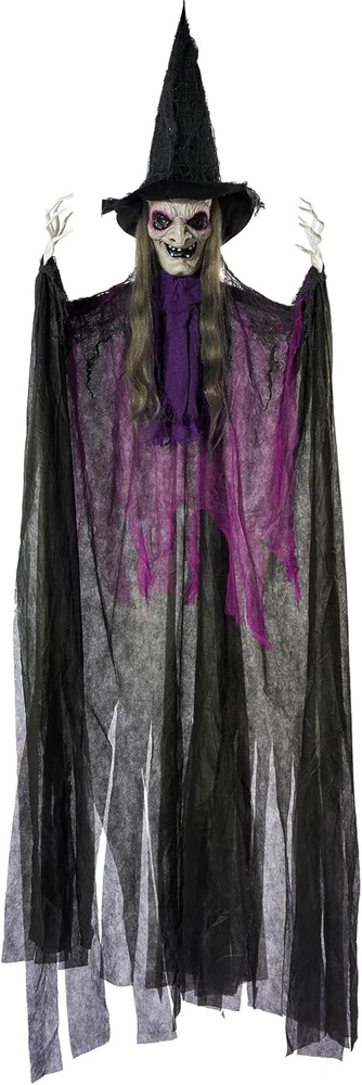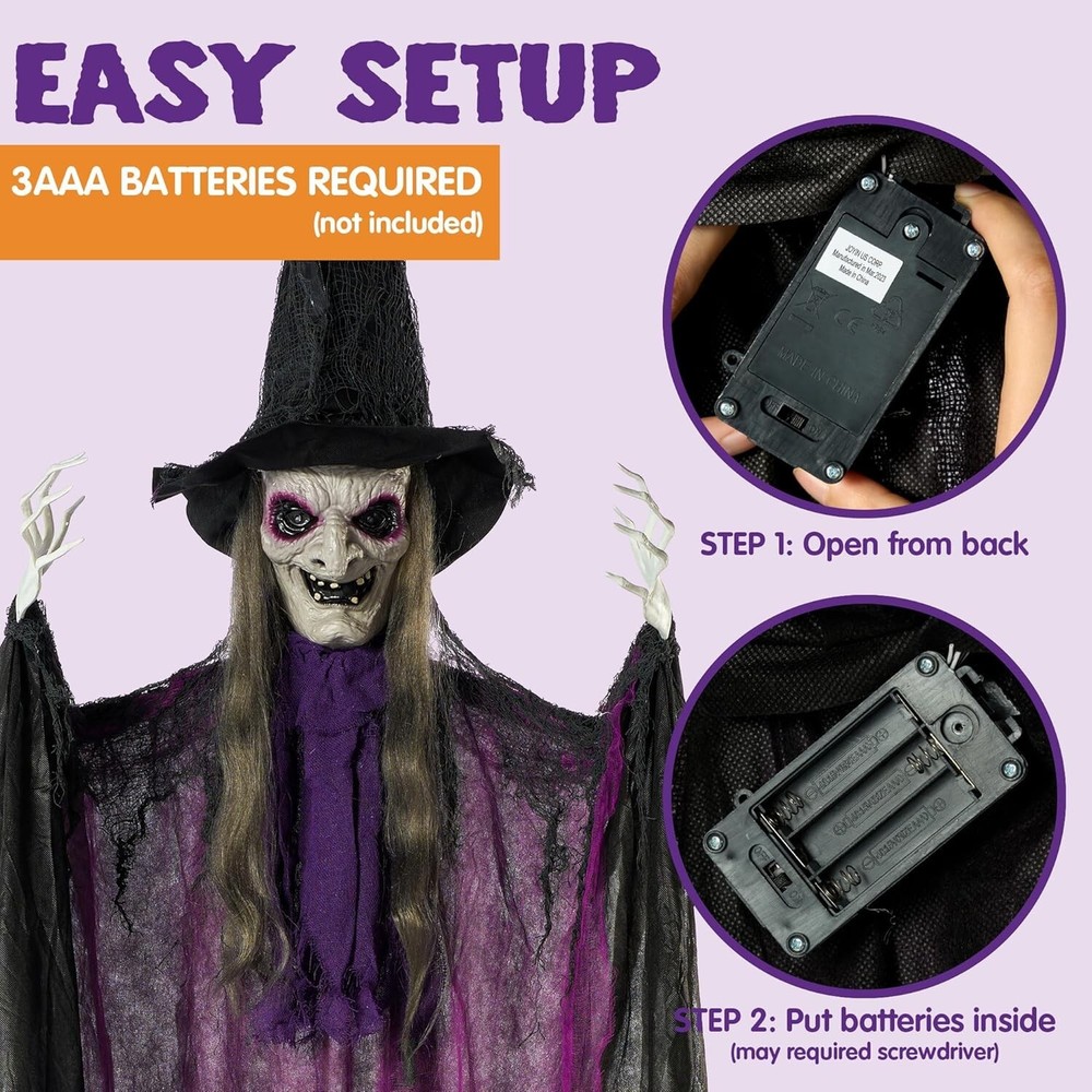 JOYIN 72” Halloween Animated Hanging Talking Witch with Light-up Eyes, Creepy Sound, Sound-Activated Hanging Witch for Halloween Indoor Outdoor Decorations, Haunted House Prop, Yard, Lawn Decorations REALISTIC HALLOWEEN DECOR: Our animated talking witch features a realistic appearance that is sure to impress your guests. With intricate details, such as flowing grayish-white hair that cascades down her back. The witch's eerie face is full of wrinkles, giving her a truly menacing look. To add to the scare factor, her hands are fully adjustable and move in a spooky way. The figurine is completed with a classic witch costume, featuring the traditional colors of black and purple. EASY TO USE: Hanging this Creepy Purple Witch decorations from trees, windows, ceiling, porch or doorways to create a spooky atmosphere at your house to scare your guests. This animated sound-activated talking witch decoration requires 3AAA batteries (not included). With this product, you can bring the spooky season to life in your home or office, and add a touch of eerie charm to any space. ENDLESS FUN: Bring surprise and delight to trick-or-treaters with our detailed Tall Witch Halloween Decor. This dark and creepy villain floats around in a very terrifying aura making it the perfect addition to your Halloween decorations. Perfect to be hung for Perfect for Halloween Outdoor, Lawn, Yard, Patio Decoration, Halloween Haunted House Decorations Halloween tree, window, yard, porch, doorway, haunted house, Halloween party decor, Halloween outdoor decoration DURABLE MATERIAL: Made from high-quality plastic and fabric, these decorations are durable and safe. Our animatronic hanging witch decoration is designed to last for many Halloweens to come. Scare Your Guests: The Halloween hanging witch decor is the perfect way to scare your guests and give them a Halloween they won't forget. It's a fun and unique way to add some extra spookiness to your Halloween home decorations!