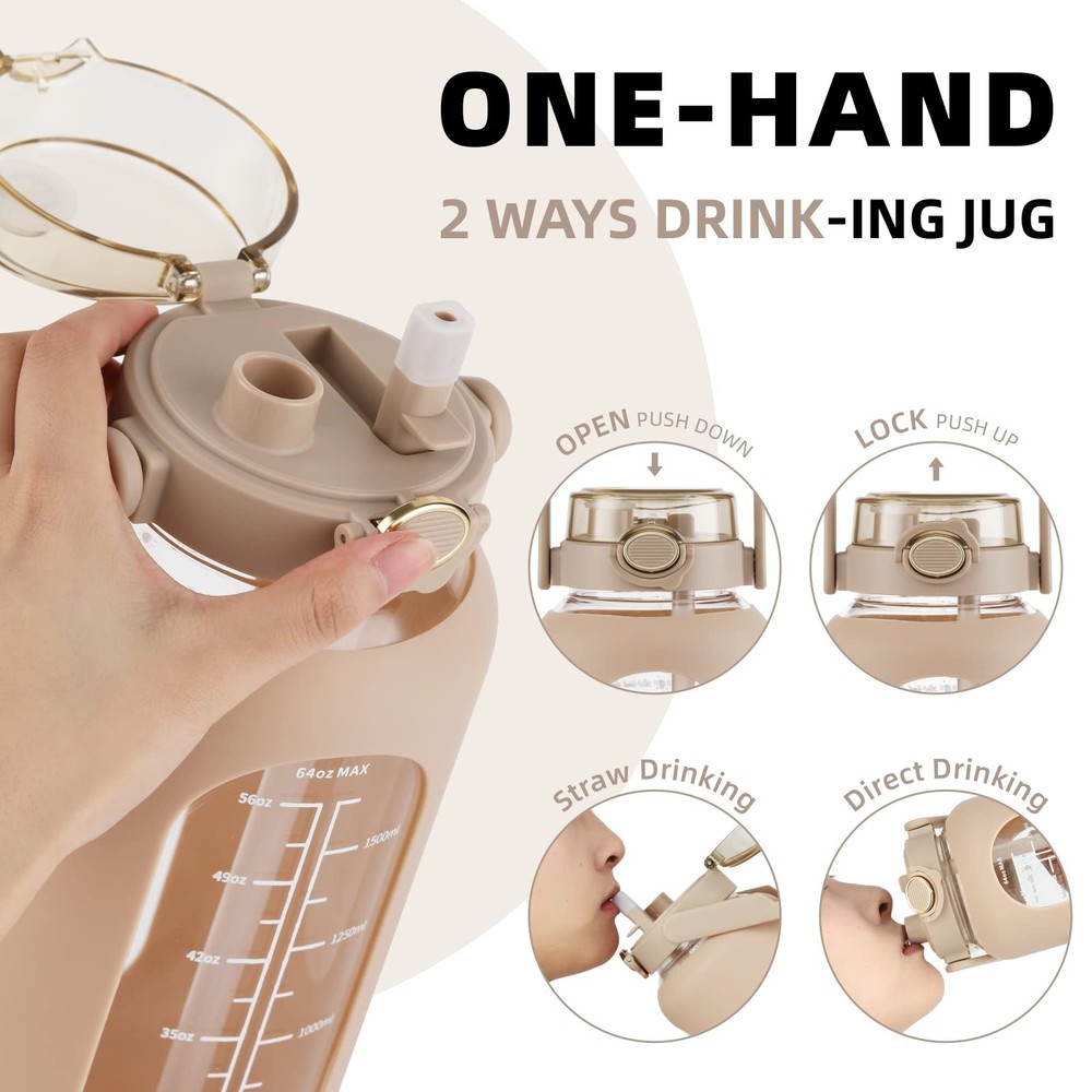 Large Glass Water Bottle: Large water bottle ensures you enjoy enough water without having to refill it frequently. It's perfect for an on-the-go lifestyle! 74 oz capacity glass water bottles that meet your different hydrating need Glass Water Bottle with Time Marker:The glass water bottle comes with time markers and exact volume on the side, monitor your daily hydrated intake and stay on track meet your health and fitness goals, nudge you getting into healthy habit of drinking water, helps you stay hydrated and daily heath High-Quality Borosilicate Glass Water Bottle: Made from eco-friendly, food-grade high borosilicate glass, this glass water bottle is suitable for both warm and cold beverages (-4F to 302F). It is 100% BPA-free and odor-free, ensuring a healthy and safe experience. The wide-mouth opening allows for easy filling with ice cubes and fruits, as well as convenient daily cleaning More Function :This large glass water bottle with straw is designed with high-quality silicone sleeve to protect water bottle from slight bumps. In order to make the half-gallon(2.2 liters) big gym motivational water bottle easy to carry we have equipped it with handle Occasions and Guarantee : Available in multiple colors,it's an ideal gift for your family and friends, outdoor and indoor activities, also the perfect gifts for any festivals.We pay attention to buyers' experience and provide a 100% service guarantee. If you have any questions about our products, feel free to contact us
