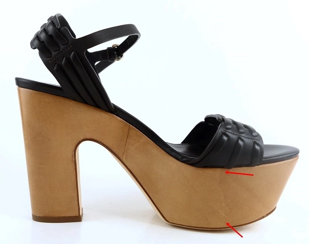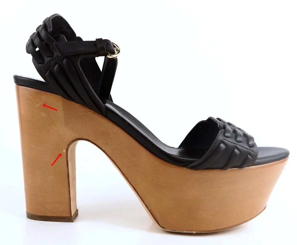 New/ store display ( platform and heel scuffed ) in original box w/ dust bag Leather/ suede upper; Leather sole; Leather lining Covered wedge measures 5 1/8"; Platform 1 3/4" * Lightly padded footbed Peep toe design Made in ITALY *Measurements are hand taken for every item we sell. Every item is carefully inspected to ensure that you receive a quality product. Designer Shoe Box guarantees this product is 100% Authentic