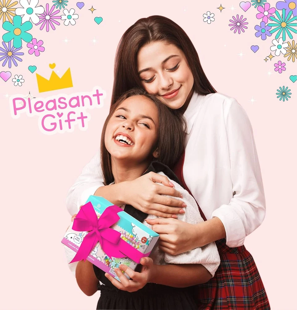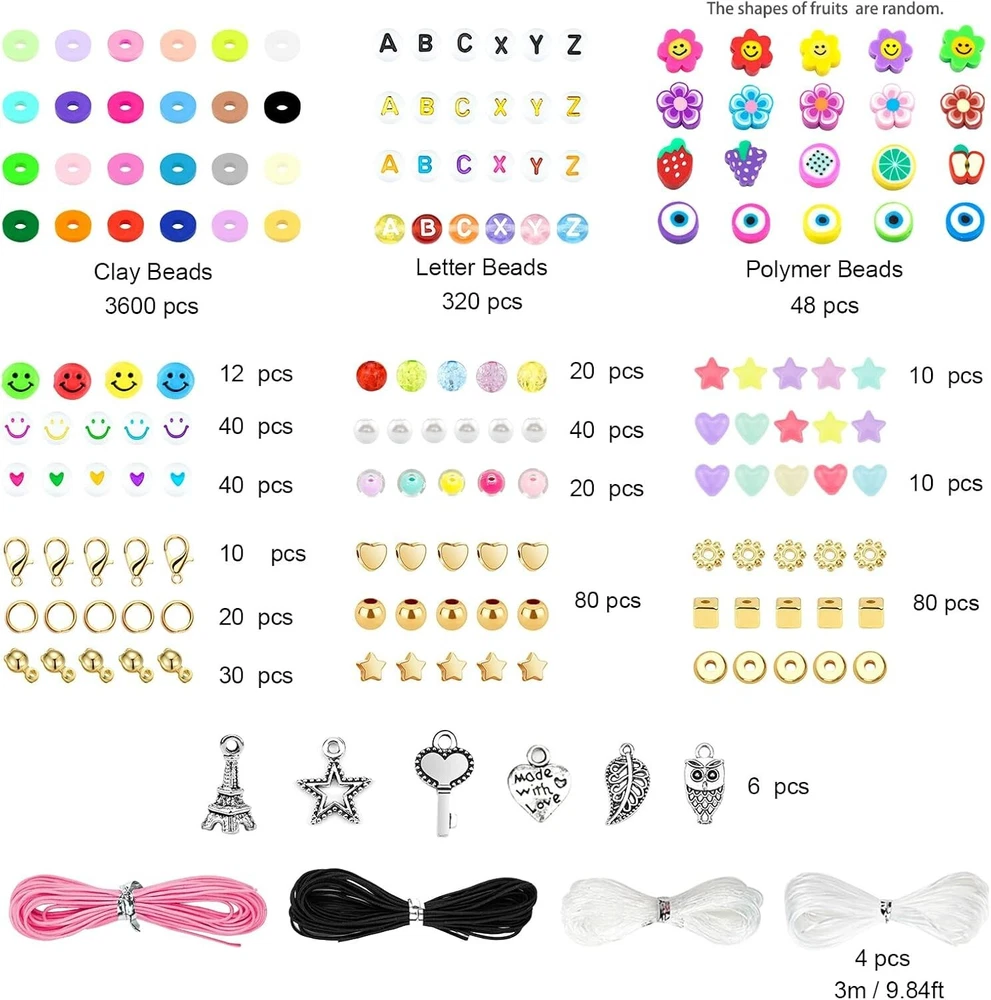 Clay Beads 7500 Pcs Friendship Bracelet Making Kit,2 Boxes 24 Colors Polymer Heishi Beads with Letter Beads for Jewelry Making, DIY Arts and Crafts Gifts Toys for Girls Age 4+ Everything you need is included: Two boxes contain about 3600pcs clay beads in 24 vibrant colors, about 48pcs polymer clay beads in 4 types,320pcs random letter beads in 4 types,20pcs plastic smile beads and 100pcs small round beads,166pcs charms rolls of 6 meters of elastic strings. You can make bracelets or jewelry according to your favorite color and style. What's new in our kits: We have prepared instructions and videos to teach you step-by-step how to make bracelets, jewelry, and earrings. In addition, we will also introduce you to the usage of charms accessories one by one, such as lobster clasp, binder, and so on. Whether you are a beginner or not, we hope to give you a relaxed and enjoyable experience. Kid-Friendly Material: All of our beads are made of healthy and environmentally friendly materials, light and durable, comfortable to the touch, not easy to fade, waterproof, and can be worn when bathing or swimming. You can use and wear it with confidence. All materials provided are completely safe and kid-friendly for ages 4+.Recommended age 4+ s old. Endless Creativity: With thousands of clay beads in 24 colors and various charms accessories, the possibilities for creative expression are endless. Let your imagination run wild and create unique pieces that reflect your style. Great Gift for Kids: Unleash creativity and imagination with this versatile bracelet making kit! Perfect for holiday playtime with kids, it helps improve hand-eye coordination, manual dexterity, and concentration. A meaningful and cheerful gift choice for birthdays, valentine's day, mother's day, Christmas, thanksgiving day, and more!